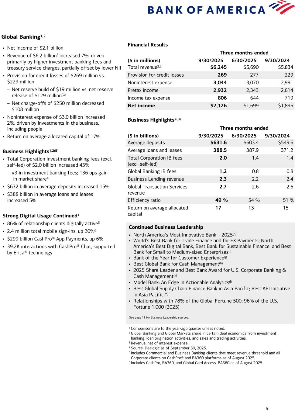 4 Global Wealth and Investment Management1 Financial Results Three months ended ($ in millions) 9/30/2025 6/30/2025 9/30/2024 Total revenue2 $6,312 $5,937 $5,762 Provision for credit losses 4 20 7 Noninterest expense 4,622 4,593 4,340 Pretax income 1,686 1,324 1,415 Income tax expense 421 331 354 Net income $1,265 $993 $1,061 Business Highlights(B) Three months ended ($ in billions) 9/30/2025 6/30/2025 9/30/2024 Average deposits $276.5 $276.8 $280.0 Average loans and leases 245.5 237.4 225.4 Total client balances (EOP) 4,641.2 4,395.2 4,193.9 AUM flows 23.5 14.3 21.3 Pretax margin 27 % 22 % 25 % Return on average allocated capital 26 20 23 • Net income of $1.3 billion • Revenue of $6.3 billion,2 up 10%. The increase was primarily driven by asset management fees, up 12% to $3.9 billion, from higher market valuations and strong AUM flows • Noninterest expense of $4.6 billion increased 6%, driven by revenue-related incentives and investments in people – Pretax margin of 27% • Return on average allocated capital of 26% Business Highlights1(B) • $4.6 trillion in client balances, up 11%, driven by higher market valuations and positive net client flows – AUM flows of $24 billion; $84 billion since 3Q24 • Average deposits of $277 billion decreased 1% • Average loans and leases of $246 billion increased 9% Merrill Wealth Management Highlights Client Engagement • $3.9 trillion in client balances(B) • $1.7 trillion in AUM balances(B) • ~4.5K net new households added in 3Q25 • 42K digital appointments scheduled in the quarter Strong Digital Usage Continued • 85% of Merrill households digitally active3 – 64% of Merrill households are active on mobile • 84% of households enrolled in eDelivery4 • 76% of eligible checks deposited through automated channels5 • 79% of eligible bank and brokerage accounts opened through digital onboarding Bank of America Private Bank Highlights Client Engagement • $745 billion in client balances(B) • $447 billion in AUM balances(B) • ~460 net new relationships added in 3Q25 with $3MM+ clients Strong Digital Usage Continued1 • 93% of relationships digitally active6 – 76% of Private Bank core relationships are active on mobile • 52% of eligible relationships enrolled in eDelivery4 • 77% of eligible checks deposited through automated channels5 • 58% of eligible Investment and Trust accounts opened through digital onboarding Continued Business Leadership • No. 1 on Forbes' Top Women Wealth Advisors Best-in-State (2025), Best-in-State Wealth Management Teams (2025), and Top Next Generation Advisors (2025) • No. 1 on Barron's Top 1200 Wealth Financial Advisors List (2025) and No. 1 on Barron's Top 100 Women Financial Advisors (2025) • No. 1 on Financial Planning's Top 40 Advisors Under 40 List (2025) • No. 1 in Managed Personal Trust AUM(b) • Best Private Bank in North America and Excellence in Philanthropic Services(f) • Winner for Thought Leadership by a Broker-Dealer(g) See page 11 for Business Leadership sources. 1 Comparisons are to the year-ago quarter unless noted. 2 Revenue, net of interest expense. 3 Percentage of digitally active Merrill primary households across the enterprise ($250K+ in investable assets within the enterprise) as of September 2025. Excludes Stock Plan and Banking-only households. 4 Includes Merrill Digital Households across the enterprise (excluding Stock Plan, Banking-only households, Retirement-only and 529-only) and Private Bank relationships that receive statements digitally, as of August 2025 for Private Bank and as of September 2025 for Merrill. 5 Includes mobile check deposits, remote deposit operations, and automated teller machine transactions, as of August 2025 for Private Bank and as of September 2025 for Merrill. 6 Percentage of digitally active Private Bank core relationships across the enterprise ($3MM+ in total balances) as of August 2025. Includes third-party activities and excludes Irrevocable Trust-only relationships, Institutional Philanthropic relationships, and exiting relationships.