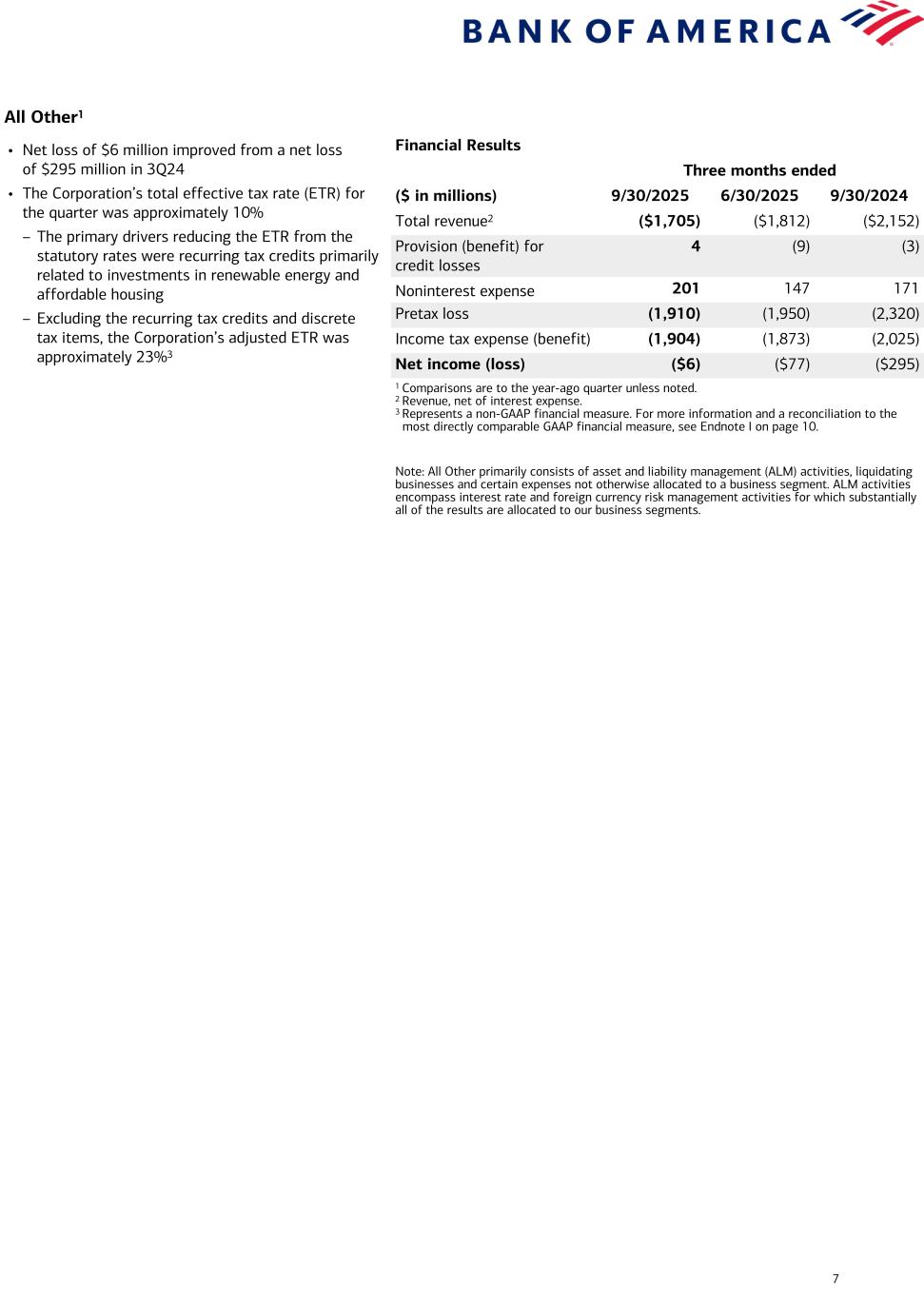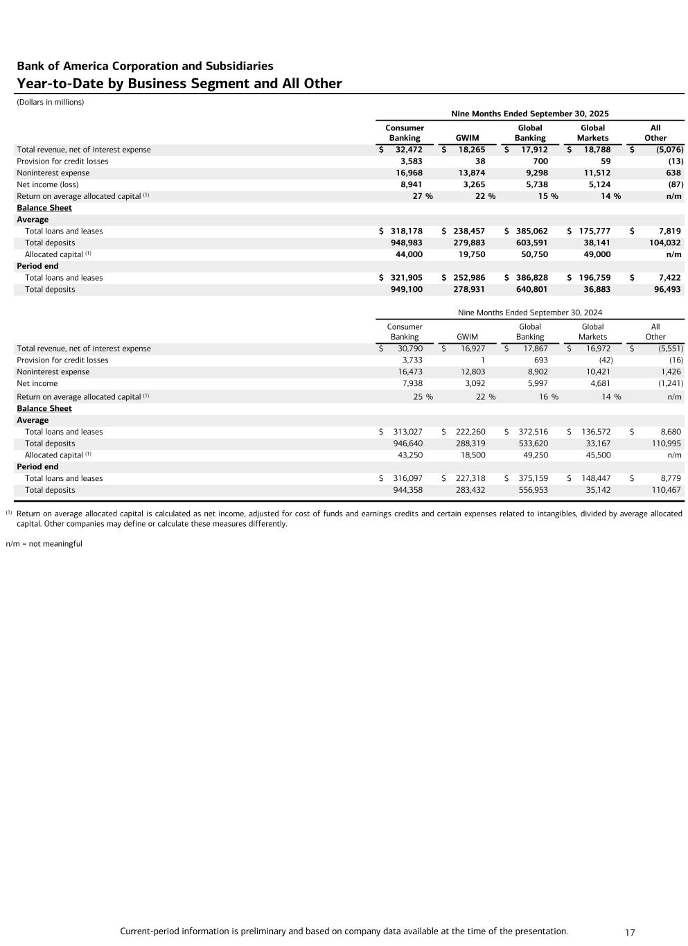 Current-period information is preliminary and based on company data available at the time of the presentation. 16 Bank of America Corporation and Subsidiaries Quarterly Results by Business Segment and All Other (Dollars in millions) Third Quarter 2025 Consumer Banking GWIM Global Banking Global Markets All Other Total revenue, net of interest expense $ 11,166 $ 6,312 $ 6,245 $ 6,224 $ (1,705) Provision for credit losses 1,009 4 269 9 4 Noninterest expense 5,575 4,622 3,044 3,895 201 Net income 3,437 1,265 2,126 1,647 (6) Return on average allocated capital (1) 31 % 26 % 17 % 13 % n/m Balance Sheet Average Total loans and leases $ 320,297 $ 245,523 $ 388,482 $ 190,994 $ 7,739 Total deposits 947,414 276,534 631,560 37,588 98,338 Allocated capital (1) 44,000 19,750 50,750 49,000 n/m Period end Total loans and leases $ 321,905 $ 252,986 $ 386,828 $ 196,759 $ 7,422 Total deposits 949,100 278,931 640,801 36,883 96,493 Second Quarter 2025 Consumer Banking GWIM Global Banking Global Markets All Other Total revenue, net of interest expense $ 10,813 $ 5,937 $ 5,690 $ 5,980 $ (1,812) Provision for credit losses 1,282 20 277 22 (9) Noninterest expense 5,567 4,593 3,070 3,806 147 Net income (loss) 2,973 993 1,699 1,528 (77) Return on average allocated capital (1) 27 % 20 % 13 % 13 % n/m Balance Sheet Average Total loans and leases $ 319,142 $ 237,377 $ 387,864 $ 176,368 $ 7,702 Total deposits 951,986 276,825 603,410 38,040 103,500 Allocated capital (1) 44,000 19,750 50,750 49,000 n/m Period end Total loans and leases $ 320,908 $ 241,142 $ 390,691 $ 187,357 $ 6,958 Total deposits 954,373 275,778 643,529 38,232 99,701 Third Quarter 2024 Consumer Banking GWIM Global Banking Global Markets All Other Total revenue, net of interest expense $ 10,418 $ 5,762 $ 5,834 $ 5,630 $ (2,152) Provision for credit losses 1,302 7 229 7 (3) Noninterest expense 5,534 4,340 2,991 3,443 171 Net income 2,687 1,061 1,895 1,548 (295) Return on average allocated capital (1) 25 % 23 % 15 % 14 % n/m Balance Sheet Average Total loans and leases $ 313,781 $ 225,355 $ 371,216 $ 140,806 $ 8,570 Total deposits 938,364 279,999 549,629 34,952 117,804 Allocated capital (1) 43,250 18,500 49,250 45,500 n/m Period end Total loans and leases $ 316,097 $ 227,318 $ 375,159 $ 148,447 $ 8,779 Total deposits 944,358 283,432 556,953 35,142 110,467 (1) Return on average allocated capital is calculated as net income, adjusted for cost of funds and earnings credits and certain expenses related to intangibles, divided by average allocated capital. Other companies may define or calculate these measures differently. n/m = not meaningful The Company reports the results of operations of its four business segments and All Other on a fully taxable-equivalent (FTE) basis.