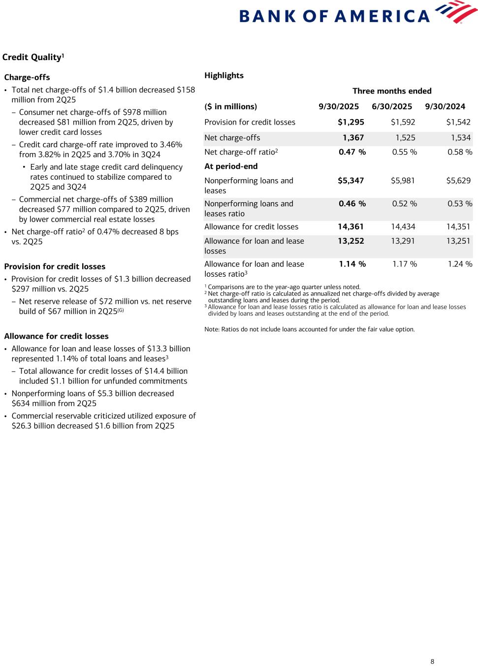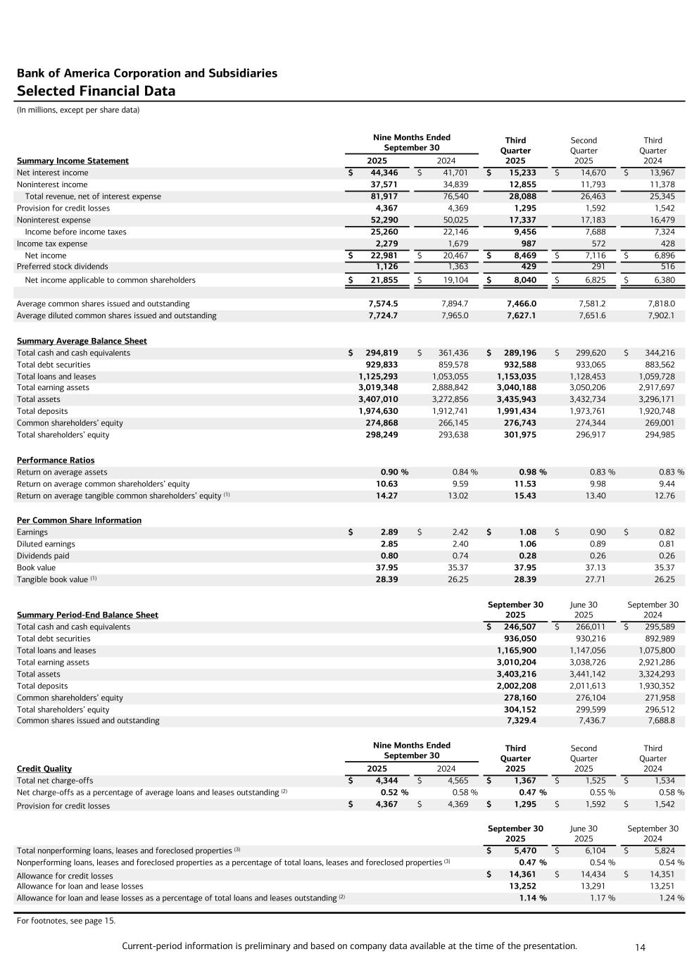 Current-period information is preliminary and based on company data available at the time of the presentation. 14 Bank of America Corporation and Subsidiaries Selected Financial Data (In millions, except per share data) Nine Months Ended September 30 Third Quarter 2025 Second Quarter 2025 Third Quarter 2024Summary Income Statement 2025 2024 Net interest income $ 44,346 $ 41,701 $ 15,233 $ 14,670 $ 13,967 Noninterest income 37,571 34,839 12,855 11,793 11,378 Total revenue, net of interest expense 81,917 76,540 28,088 26,463 25,345 Provision for credit losses 4,367 4,369 1,295 1,592 1,542 Noninterest expense 52,290 50,025 17,337 17,183 16,479 Income before income taxes 25,260 22,146 9,456 7,688 7,324 Income tax expense 2,279 1,679 987 572 428 Net income $ 22,981 $ 20,467 $ 8,469 $ 7,116 $ 6,896 Preferred stock dividends 1,126 1,363 429 291 516 Net income applicable to common shareholders $ 21,855 $ 19,104 $ 8,040 $ 6,825 $ 6,380 Average common shares issued and outstanding 7,574.5 7,894.7 7,466.0 7,581.2 7,818.0 Average diluted common shares issued and outstanding 7,724.7 7,965.0 7,627.1 7,651.6 7,902.1 Summary Average Balance Sheet Total cash and cash equivalents $ 294,819 $ 361,436 $ 289,196 $ 299,620 $ 344,216 Total debt securities 929,833 859,578 932,588 933,065 883,562 Total loans and leases 1,125,293 1,053,055 1,153,035 1,128,453 1,059,728 Total earning assets 3,019,348 2,888,842 3,040,188 3,050,206 2,917,697 Total assets 3,407,010 3,272,856 3,435,943 3,432,734 3,296,171 Total deposits 1,974,630 1,912,741 1,991,434 1,973,761 1,920,748 Common shareholders’ equity 274,868 266,145 276,743 274,344 269,001 Total shareholders’ equity 298,249 293,638 301,975 296,917 294,985 Performance Ratios Return on average assets 0.90 % 0.84 % 0.98 % 0.83 % 0.83 % Return on average common shareholders’ equity 10.63 9.59 11.53 9.98 9.44 Return on average tangible common shareholders’ equity (1) 14.27 13.02 15.43 13.40 12.76 Per Common Share Information Earnings $ 2.89 $ 2.42 $ 1.08 $ 0.90 $ 0.82 Diluted earnings 2.85 2.40 1.06 0.89 0.81 Dividends paid 0.80 0.74 0.28 0.26 0.26 Book value 37.95 35.37 37.95 37.13 35.37 Tangible book value (1) 28.39 26.25 28.39 27.71 26.25 Summary Period-End Balance Sheet September 30 2025 June 30 2025 September 30 2024 Total cash and cash equivalents $ 246,507 $ 266,011 $ 295,589 Total debt securities 936,050 930,216 892,989 Total loans and leases 1,165,900 1,147,056 1,075,800 Total earning assets 3,010,204 3,038,726 2,921,286 Total assets 3,403,216 3,441,142 3,324,293 Total deposits 2,002,208 2,011,613 1,930,352 Common shareholders’ equity 278,160 276,104 271,958 Total shareholders’ equity 304,152 299,599 296,512 Common shares issued and outstanding 7,329.4 7,436.7 7,688.8 Nine Months Ended September 30 Third Quarter 2025 Second Quarter 2025 Third Quarter 2024Credit Quality 2025 2024 Total net charge-offs $ 4,344 $ 4,565 $ 1,367 $ 1,525 $ 1,534 Net charge-offs as a percentage of average loans and leases outstanding (2) 0.52 % 0.58 % 0.47 % 0.55 % 0.58 % Provision for credit losses $ 4,367 $ 4,369 $ 1,295 $ 1,592 $ 1,542 September 30 2025 June 30 2025 September 30 2024 Total nonperforming loans, leases and foreclosed properties (3) $ 5,470 $ 6,104 $ 5,824 Nonperforming loans, leases and foreclosed properties as a percentage of total loans, leases and foreclosed properties (3) 0.47 % 0.54 % 0.54 % Allowance for credit losses $ 14,361 $ 14,434 $ 14,351 Allowance for loan and lease losses 13,252 13,291 13,251 Allowance for loan and lease losses as a percentage of total loans and leases outstanding (2) 1.14 % 1.17 % 1.24 % For footnotes, see page 15.