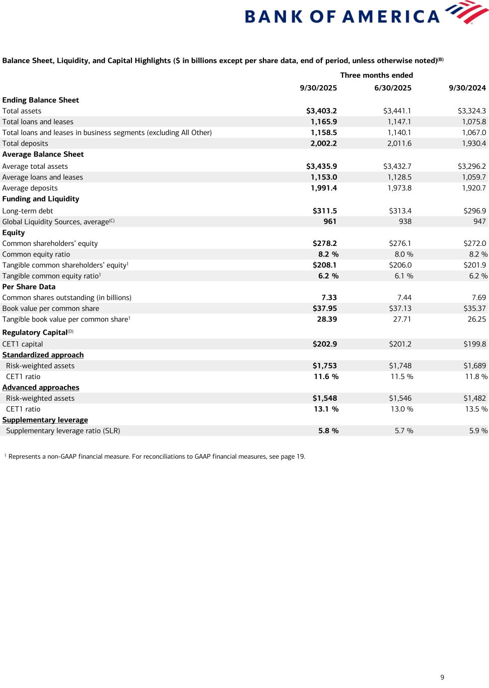 Current-period information is preliminary and based on company data available at the time of the presentation. 15 Bank of America Corporation and Subsidiaries Selected Financial Data (continued) (Dollars in millions) Capital Management September 30 2025 June 30 2025 September 30 2024 Regulatory capital metrics (4): Common equity tier 1 capital $ 202,875 $ 201,200 $ 199,805 Common equity tier 1 capital ratio - Standardized approach 11.6 % 11.5 % 11.8 % Common equity tier 1 capital ratio - Advanced approaches 13.1 13.0 13.5 Total capital ratio - Standardized approach 15.0 14.8 14.9 Total capital ratio - Advanced approaches 16.3 16.1 16.3 Tier 1 leverage ratio 6.8 6.7 6.9 Supplementary leverage ratio 5.8 5.7 5.9 Total ending equity to total ending assets ratio 8.9 8.7 8.9 Common equity ratio 8.2 8.0 8.2 Tangible equity ratio (5) 7.0 6.8 7.0 Tangible common equity ratio (5) 6.2 6.1 6.2 (1) Return on average tangible common shareholders’ equity and tangible book value per share of common stock are non-GAAP financial measures. We believe the use of ratios that utilize tangible equity provides additional useful information because they present measures of those assets that can generate income. Tangible book value per common share provides additional useful information about the level of tangible assets in relation to outstanding shares of common stock. See Reconciliations to GAAP Financial Measures on page 19. (2) Ratios do not include loans accounted for under the fair value option. Charge-off ratios are annualized for the quarterly presentation. (3) Balances do not include past due consumer credit card loans, consumer loans secured by real estate where repayments are insured by the Federal Housing Administration and individually insured long-term stand-by agreements (fully-insured home loans), and in general, other consumer and commercial loans not secured by real estate, and nonperforming loans held-for-sale or accounted for under the fair value option. (4) Regulatory capital ratios at September 30, 2025 are preliminary. Bank of America Corporation reports regulatory capital ratios under both the Standardized and Advanced approaches. Capital adequacy is evaluated against the lower of the Standardized or Advanced approaches compared to their respective regulatory capital ratio requirements. The Corporation’s binding ratio was the Total capital ratio under the Standardized approach for all periods presented. (5) Tangible equity ratio equals period-end tangible shareholders’ equity divided by period-end tangible assets. Tangible common equity ratio equals period-end tangible common shareholders’ equity divided by period-end tangible assets. Tangible shareholders’ equity and tangible assets are non-GAAP financial measures. We believe the use of ratios that utilize tangible equity provides additional useful information because they present measures of those assets that can generate income. See Reconciliations to GAAP Financial Measures on page 19.