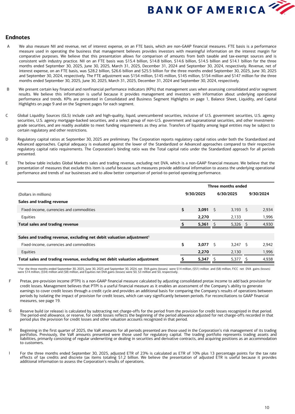 10 Endnotes A We also measure NII and revenue, net of interest expense, on an FTE basis, which are non-GAAP financial measures. FTE basis is a performance measure used in operating the business that management believes provides investors with meaningful information on the interest margin for comparative purposes. We believe that this presentation allows for comparison of amounts from both taxable and tax-exempt sources and is consistent with industry practice. NII on an FTE basis was $15.4 billion, $14.8 billion, $14.6 billion, $14.5 billion and $14.1 billion for the three months ended September 30, 2025, June 30, 2025, March 31, 2025, December 31, 2024 and September 30, 2024, respectively. Revenue, net of interest expense, on an FTE basis, was $28.2 billion, $26.6 billion and $25.5 billion for the three months ended September 30, 2025, June 30, 2025 and September 30, 2024, respectively. The FTE adjustment was $154 million, $145 million, $145 million, $154 million and $147 million for the three months ended September 30, 2025, June 30, 2025, March 31, 2025, December 31, 2024 and September 30, 2024, respectively. B We present certain key financial and nonfinancial performance indicators (KPIs) that management uses when assessing consolidated and/or segment results. We believe this information is useful because it provides management and investors with information about underlying operational performance and trends. KPIs are presented in Consolidated and Business Segment Highlights on page 1, Balance Sheet, Liquidity, and Capital Highlights on page 9 and on the Segment pages for each segment. C Global Liquidity Sources (GLS) include cash and high-quality, liquid, unencumbered securities, inclusive of U.S. government securities, U.S. agency securities, U.S. agency mortgage-backed securities, and a select group of non-U.S. government and supranational securities, and other investment- grade securities, and are readily available to meet funding requirements as they arise. Transfers of liquidity among legal entities may be subject to certain regulatory and other restrictions. D Regulatory capital ratios at September 30, 2025 are preliminary. The Corporation reports regulatory capital ratios under both the Standardized and Advanced approaches. Capital adequacy is evaluated against the lower of the Standardized or Advanced approaches compared to their respective regulatory capital ratio requirements. The Corporation’s binding ratio was the Total capital ratio under the Standardized approach for all periods presented. E The below table includes Global Markets sales and trading revenue, excluding net DVA, which is a non-GAAP financial measure. We believe that the presentation of measures that exclude this item is useful because such measures provide additional information to assess the underlying operational performance and trends of our businesses and to allow better comparison of period-to-period operating performance. Three months ended (Dollars in millions) 9/30/2025 6/30/2025 9/30/2024 Sales and trading revenue Fixed-income, currencies and commodities $ 3,091 $ 3,193 $ 2,934 Equities 2,270 2,133 1,996 Total sales and trading revenue $ 5,361 $ 5,326 $ 4,930 Sales and trading revenue, excluding net debit valuation adjustment1 Fixed-income, currencies and commodities $ 3,077 $ 3,247 $ 2,942 Equities 2,270 2,130 1,996 Total sales and trading revenue, excluding net debit valuation adjustment $ 5,347 $ 5,377 $ 4,938 F Pretax, pre-provision income (PTPI) is a non-GAAP financial measure calculated by adjusting consolidated pretax income to add back provision for credit losses. Management believes that PTPI is a useful financial measure as it enables an assessment of the Company’s ability to generate earnings to cover credit losses through a credit cycle and provides an additional basis for comparing the Company's results of operations between periods by isolating the impact of provision for credit losses, which can vary significantly between periods. For reconciliations to GAAP financial measures, see page 19. G Reserve build (or release) is calculated by subtracting net charge-offs for the period from the provision for credit losses recognized in that period. The period-end allowance, or reserve, for credit losses reflects the beginning of the period allowance adjusted for net charge-offs recorded in that period plus the provision for credit losses and other valuation accounts recognized in that period. H Beginning in the first quarter of 2025, the VaR amounts for all periods presented are those used in the Corporation’s risk management of its trading portfolios. Previously, the VaR amounts presented were those used for regulatory capital. The trading portfolio represents trading assets and liabilities, primarily consisting of regular underwriting or dealing in securities and derivative contracts, and acquiring positions as an accommodation to customers. I For the three months ended September 30, 2025, adjusted ETR of 23% is calculated as ETR of 10% plus 13 percentage points for the tax rate effects of tax credits and discrete tax items totaling $1.2 billion. We believe the presentation of adjusted ETR is useful because it provides additional information to assess the Corporation’s results of operations. 1 For the three months ended September 30, 2025, June 30, 2025 and September 30, 2024, net DVA gains (losses) were $14 million, ($51) million and ($8) million, FICC net DVA gains (losses) were $14 million, ($54) million and ($8) million, and Equities net DVA gains (losses) were $0, $3 million and $0, respectively.