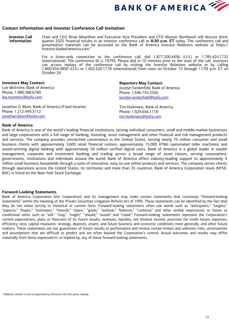 12 Contact Information and Investor Conference Call Invitation Investor Call Information Chair and CEO Brian Moynihan and Executive Vice President and CFO Alastair Borthwick will discuss third- quarter 2025 financial results in an investor conference call at 8:30 a.m. ET today. The conference call and presentation materials can be accessed on the Bank of America Investor Relations website at https:// investor.bankofamerica.com.* For a listen-only connection to the conference call, dial 1.877.200.4456 (U.S.) or 1.785.424.1732 (international). The conference ID is 79795. Please dial in 10 minutes prior to the start of the call. Investors can access replays of the conference call by visiting the Investor Relations website or by calling 1.800.934.4850 (U.S.) or 1.402.220.1178 (international) from noon on October 15 through 11:59 p.m. ET on October 24. Investors May Contact: Lee McEntire, Bank of America Phone: 1.980.388.6780 lee.mcentire@bofa.com Jonathan G. Blum, Bank of America (Fixed Income) Phone: 1.212.449.3112 jonathan.blum@bofa.com Bank of America Bank of America is one of the world’s leading financial institutions, serving individual consumers, small and middle-market businesses and large corporations with a full range of banking, investing, asset management and other financial and risk management products and services. The company provides unmatched convenience in the United States, serving nearly 70 million consumer and small business clients with approximately 3,600 retail financial centers, approximately 15,000 ATMs (automated teller machines) and award-winning digital banking with approximately 59 million verified digital users. Bank of America is a global leader in wealth management, corporate and investment banking and trading across a broad range of asset classes, serving corporations, governments, institutions and individuals around the world. Bank of America offers industry-leading support to approximately 4 million small business households through a suite of innovative, easy-to-use online products and services. The company serves clients through operations across the United States, its territories and more than 35 countries. Bank of America Corporation stock (NYSE: BAC) is listed on the New York Stock Exchange. Forward-Looking Statements Bank of America Corporation (the Corporation) and its management may make certain statements that constitute “forward-looking statements” within the meaning of the Private Securities Litigation Reform Act of 1995. These statements can be identified by the fact that they do not relate strictly to historical or current facts. Forward-looking statements often use words such as “anticipates,” “targets,” “expects,” “hopes,” “estimates,” “intends,” “plans,” “goals,” “outlook,” “believes,” “continue” and other similar expressions or future or conditional verbs such as “will,” “may,” “might,” “should,” “would” and “could.” Forward-looking statements represent the Corporation’s current expectations, plans or forecasts of its future results, revenues, liquidity, net interest income, provision for credit losses, expenses, efficiency ratio, capital measures, strategy, deposits, assets, and future business and economic conditions more generally, and other future matters. These statements are not guarantees of future results or performance and involve certain known and unknown risks, uncertainties and assumptions that are difficult to predict and are often beyond the Corporation’s control. Actual outcomes and results may differ materially from those expressed in, or implied by, any of these forward-looking statements. * Website content is not incorporated by reference into this press release. Reporters May Contact: Jocelyn Seidenfeld, Bank of America Phone: 1.646.743.3356 jocelyn.seidenfeld@bofa.com Tim Hurkmans, Bank of America Phone: 1.929.656.1718 tim.hurkmans@bofa.com