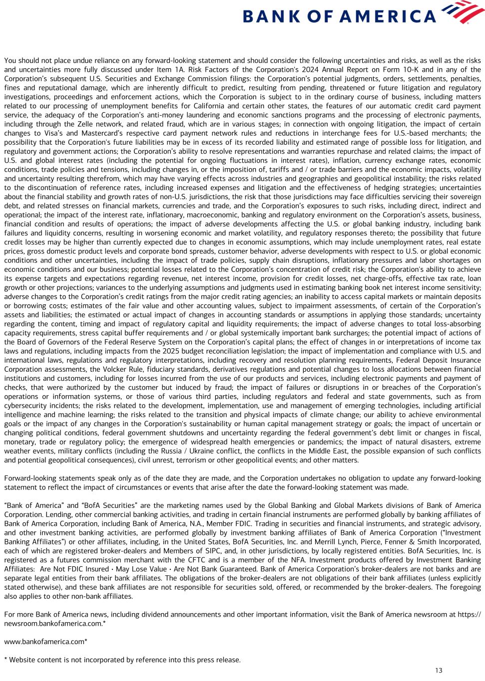 13 You should not place undue reliance on any forward-looking statement and should consider the following uncertainties and risks, as well as the risks and uncertainties more fully discussed under Item 1A. Risk Factors of the Corporation's 2024 Annual Report on Form 10-K and in any of the Corporation’s subsequent U.S. Securities and Exchange Commission filings: the Corporation’s potential judgments, orders, settlements, penalties, fines and reputational damage, which are inherently difficult to predict, resulting from pending, threatened or future litigation and regulatory investigations, proceedings and enforcement actions, which the Corporation is subject to in the ordinary course of business, including matters related to our processing of unemployment benefits for California and certain other states, the features of our automatic credit card payment service, the adequacy of the Corporation’s anti-money laundering and economic sanctions programs and the processing of electronic payments, including through the Zelle network, and related fraud, which are in various stages; in connection with ongoing litigation, the impact of certain changes to Visa’s and Mastercard’s respective card payment network rules and reductions in interchange fees for U.S.-based merchants; the possibility that the Corporation's future liabilities may be in excess of its recorded liability and estimated range of possible loss for litigation, and regulatory and government actions; the Corporation’s ability to resolve representations and warranties repurchase and related claims; the impact of U.S. and global interest rates (including the potential for ongoing fluctuations in interest rates), inflation, currency exchange rates, economic conditions, trade policies and tensions, including changes in, or the imposition of, tariffs and / or trade barriers and the economic impacts, volatility and uncertainty resulting therefrom, which may have varying effects across industries and geographies and geopolitical instability; the risks related to the discontinuation of reference rates, including increased expenses and litigation and the effectiveness of hedging strategies; uncertainties about the financial stability and growth rates of non-U.S. jurisdictions, the risk that those jurisdictions may face difficulties servicing their sovereign debt, and related stresses on financial markets, currencies and trade, and the Corporation’s exposures to such risks, including direct, indirect and operational; the impact of the interest rate, inflationary, macroeconomic, banking and regulatory environment on the Corporation’s assets, business, financial condition and results of operations; the impact of adverse developments affecting the U.S. or global banking industry, including bank failures and liquidity concerns, resulting in worsening economic and market volatility, and regulatory responses thereto; the possibility that future credit losses may be higher than currently expected due to changes in economic assumptions, which may include unemployment rates, real estate prices, gross domestic product levels and corporate bond spreads, customer behavior, adverse developments with respect to U.S. or global economic conditions and other uncertainties, including the impact of trade policies, supply chain disruptions, inflationary pressures and labor shortages on economic conditions and our business; potential losses related to the Corporation’s concentration of credit risk; the Corporation's ability to achieve its expense targets and expectations regarding revenue, net interest income, provision for credit losses, net charge-offs, effective tax rate, loan growth or other projections; variances to the underlying assumptions and judgments used in estimating banking book net interest income sensitivity; adverse changes to the Corporation’s credit ratings from the major credit rating agencies; an inability to access capital markets or maintain deposits or borrowing costs; estimates of the fair value and other accounting values, subject to impairment assessments, of certain of the Corporation’s assets and liabilities; the estimated or actual impact of changes in accounting standards or assumptions in applying those standards; uncertainty regarding the content, timing and impact of regulatory capital and liquidity requirements; the impact of adverse changes to total loss-absorbing capacity requirements, stress capital buffer requirements and / or global systemically important bank surcharges; the potential impact of actions of the Board of Governors of the Federal Reserve System on the Corporation’s capital plans; the effect of changes in or interpretations of income tax laws and regulations, including impacts from the 2025 budget reconciliation legislation; the impact of implementation and compliance with U.S. and international laws, regulations and regulatory interpretations, including recovery and resolution planning requirements, Federal Deposit Insurance Corporation assessments, the Volcker Rule, fiduciary standards, derivatives regulations and potential changes to loss allocations between financial institutions and customers, including for losses incurred from the use of our products and services, including electronic payments and payment of checks, that were authorized by the customer but induced by fraud; the impact of failures or disruptions in or breaches of the Corporation’s operations or information systems, or those of various third parties, including regulators and federal and state governments, such as from cybersecurity incidents; the risks related to the development, implementation, use and management of emerging technologies, including artificial intelligence and machine learning; the risks related to the transition and physical impacts of climate change; our ability to achieve environmental goals or the impact of any changes in the Corporation's sustainability or human capital management strategy or go