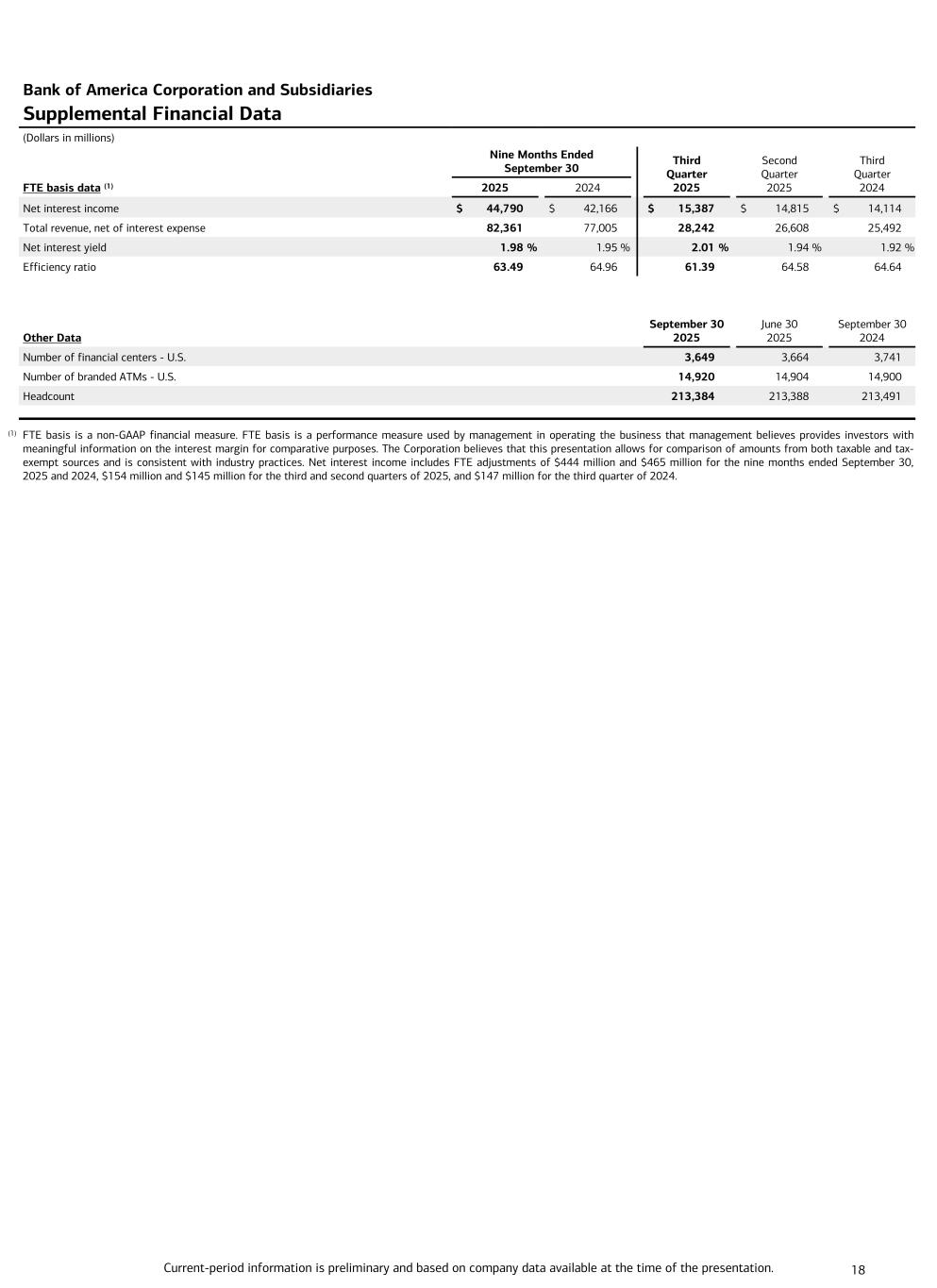 Current-period information is preliminary and based on company data available at the time of the presentation. 18 Bank of America Corporation and Subsidiaries Supplemental Financial Data (Dollars in millions) Nine Months Ended September 30 Third Quarter 2025 Second Quarter 2025 Third Quarter 2024FTE basis data (1) 2025 2024 Net interest income $ 44,790 $ 42,166 $ 15,387 $ 14,815 $ 14,114 Total revenue, net of interest expense 82,361 77,005 28,242 26,608 25,492 Net interest yield 1.98 % 1.95 % 2.01 % 1.94 % 1.92 % Efficiency ratio 63.49 64.96 61.39 64.58 64.64 Other Data September 30 2025 June 30 2025 September 30 2024 Number of financial centers - U.S. 3,649 3,664 3,741 Number of branded ATMs - U.S. 14,920 14,904 14,900 Headcount 213,384 213,388 213,491 (1) FTE basis is a non-GAAP financial measure. FTE basis is a performance measure used by management in operating the business that management believes provides investors with meaningful information on the interest margin for comparative purposes. The Corporation believes that this presentation allows for comparison of amounts from both taxable and tax- exempt sources and is consistent with industry practices. Net interest income includes FTE adjustments of $444 million and $465 million for the nine months ended September 30, 2025 and 2024, $154 million and $145 million for the third and second quarters of 2025, and $147 million for the third quarter of 2024.