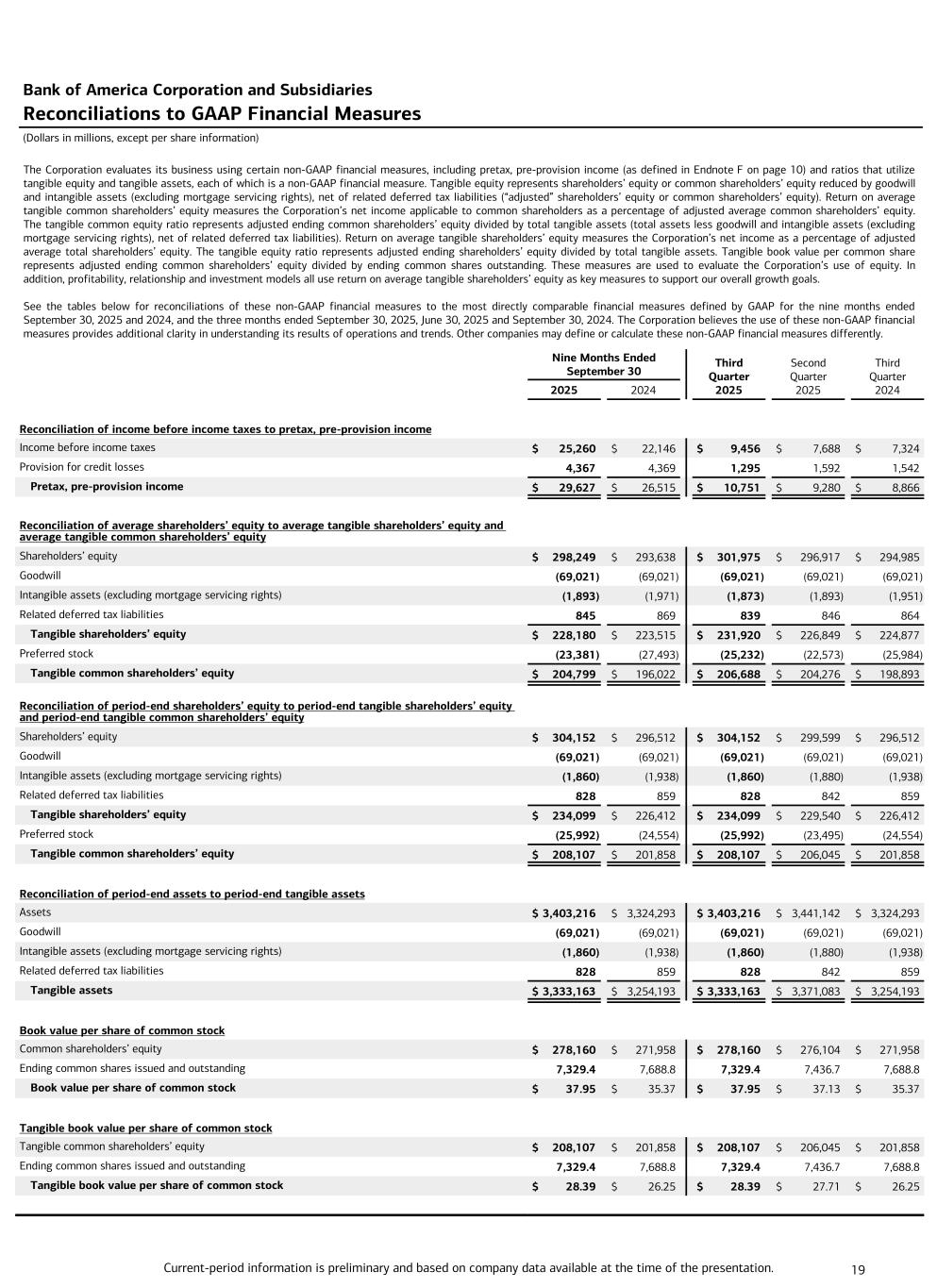 Current-period information is preliminary and based on company data available at the time of the presentation. 19 The Corporation evaluates its business using certain non-GAAP financial measures, including pretax, pre-provision income (as defined in Endnote F on page 10) and ratios that utilize tangible equity and tangible assets, each of which is a non-GAAP financial measure. Tangible equity represents shareholders’ equity or common shareholders’ equity reduced by goodwill and intangible assets (excluding mortgage servicing rights), net of related deferred tax liabilities (“adjusted” shareholders’ equity or common shareholders’ equity). Return on average tangible common shareholders’ equity measures the Corporation’s net income applicable to common shareholders as a percentage of adjusted average common shareholders’ equity. The tangible common equity ratio represents adjusted ending common shareholders’ equity divided by total tangible assets (total assets less goodwill and intangible assets (excluding mortgage servicing rights), net of related deferred tax liabilities). Return on average tangible shareholders’ equity measures the Corporation’s net income as a percentage of adjusted average total shareholders’ equity. The tangible equity ratio represents adjusted ending shareholders’ equity divided by total tangible assets. Tangible book value per common share represents adjusted ending common shareholders’ equity divided by ending common shares outstanding. These measures are used to evaluate the Corporation’s use of equity. In addition, profitability, relationship and investment models all use return on average tangible shareholders’ equity as key measures to support our overall growth goals. See the tables below for reconciliations of these non-GAAP financial measures to the most directly comparable financial measures defined by GAAP for the nine months ended September 30, 2025 and 2024, and the three months ended September 30, 2025, June 30, 2025 and September 30, 2024. The Corporation believes the use of these non-GAAP financial measures provides additional clarity in understanding its results of operations and trends. Other companies may define or calculate these non-GAAP financial measures differently. Bank of America Corporation and Subsidiaries Reconciliations to GAAP Financial Measures (Dollars in millions, except per share information) Nine Months Ended September 30 Third Quarter 2025 Second Quarter 2025 Third Quarter 2024 2025 2024 Reconciliation of income before income taxes to pretax, pre-provision income Income before income taxes $ 25,260 $ 22,146 $ 9,456 $ 7,688 $ 7,324 Provision for credit losses 4,367 4,369 1,295 1,592 1,542 Pretax, pre-provision income $ 29,627 $ 26,515 $ 10,751 $ 9,280 $ 8,866 Reconciliation of average shareholders’ equity to average tangible shareholders’ equity and average tangible common shareholders’ equity Shareholders’ equity $ 298,249 $ 293,638 $ 301,975 $ 296,917 $ 294,985 Goodwill (69,021) (69,021) (69,021) (69,021) (69,021) Intangible assets (excluding mortgage servicing rights) (1,893) (1,971) (1,873) (1,893) (1,951) Related deferred tax liabilities 845 869 839 846 864 Tangible shareholders’ equity $ 228,180 $ 223,515 $ 231,920 $ 226,849 $ 224,877 Preferred stock (23,381) (27,493) (25,232) (22,573) (25,984) Tangible common shareholders’ equity $ 204,799 $ 196,022 $ 206,688 $ 204,276 $ 198,893 Reconciliation of period-end shareholders’ equity to period-end tangible shareholders’ equity and period-end tangible common shareholders’ equity Shareholders’ equity $ 304,152 $ 296,512 $ 304,152 $ 299,599 $ 296,512 Goodwill (69,021) (69,021) (69,021) (69,021) (69,021) Intangible assets (excluding mortgage servicing rights) (1,860) (1,938) (1,860) (1,880) (1,938) Related deferred tax liabilities 828 859 828 842 859 Tangible shareholders’ equity $ 234,099 $ 226,412 $ 234,099 $ 229,540 $ 226,412 Preferred stock (25,992) (24,554) (25,992) (23,495) (24,554) Tangible common shareholders’ equity $ 208,107 $ 201,858 $ 208,107 $ 206,045 $ 201,858 Reconciliation of period-end assets to period-end tangible assets Assets $ 3,403,216 $ 3,324,293 $ 3,403,216 $ 3,441,142 $ 3,324,293 Goodwill (69,021) (69,021) (69,021) (69,021) (69,021) Intangible assets (excluding mortgage servicing rights) (1,860) (1,938) (1,860) (1,880) (1,938) Related deferred tax liabilities 828 859 828 842 859 Tangible assets $ 3,333,163 $ 3,254,193 $ 3,333,163 $ 3,371,083 $ 3,254,193 Book value per share of common stock Common shareholders’ equity $ 278,160 $ 271,958 $ 278,160 $ 276,104 $ 271,958 Ending common shares issued and outstanding 7,329.4 7,688.8 7,329.4 7,436.7 7,688.8 Book value per share of common stock $ 37.95 $ 35.37 $ 37.95 $ 37.13 $ 35.37 Tangible book value per share of common stock Tangible common shareholders’ equity $ 208,107 $ 201,858 $ 208,107 $ 206,045 $ 201,858 Ending common shares issued and outstanding 7,329.4 7,688.8 7,329.4 7,436.7 7,688.8 Tangible book value per share of common stock $ 28.39 $ 26.25 $ 28.39 $ 27.71 $ 26.25