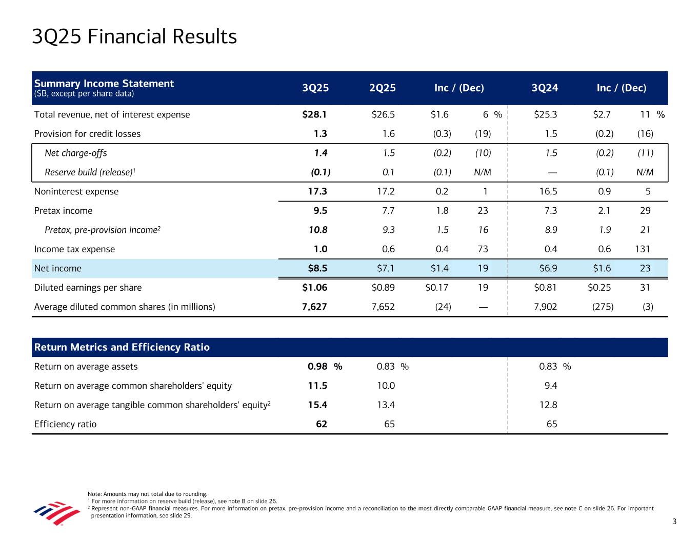 Note: Amounts may not total due to rounding. 1 For more information on reserve build (release), see note B on slide 26. 2 Represent non-GAAP financial measures. For more information on pretax, pre-provision income and a reconciliation to the most directly comparable GAAP financial measure, see note C on slide 26. For important presentation information, see slide 29. Summary Income Statement ($B, except per share data) 3Q25 2Q25 Inc / (Dec) 3Q24 Inc / (Dec) Total revenue, net of interest expense $28.1 $26.5 $1.6 6 % $25.3 $2.7 11 % Provision for credit losses 1.3 1.6 (0.3) (19) 1.5 (0.2) (16) Net charge-offs 1.4 1.5 (0.2) (10) 1.5 (0.2) (11) Reserve build (release)1 (0.1) 0.1 (0.1) N/M — (0.1) N/M Noninterest expense 17.3 17.2 0.2 1 16.5 0.9 5 Pretax income 9.5 7.7 1.8 23 7.3 2.1 29 Pretax, pre-provision income2 10.8 9.3 1.5 16 8.9 1.9 21 Income tax expense 1.0 0.6 0.4 73 0.4 0.6 131 Net income $8.5 $7.1 $1.4 19 $6.9 $1.6 23 Diluted earnings per share $1.06 $0.89 $0.17 19 $0.81 $0.25 31 Average diluted common shares (in millions) 7,627 7,652 (24) — 7,902 (275) (3) Return Metrics and Efficiency Ratio Return on average assets 0.98 % 0.83 % 0.83 % Return on average common shareholders' equity 11.5 10.0 9.4 Return on average tangible common shareholders' equity2 15.4 13.4 12.8 Efficiency ratio 62 65 65 3Q25 Financial Results 3