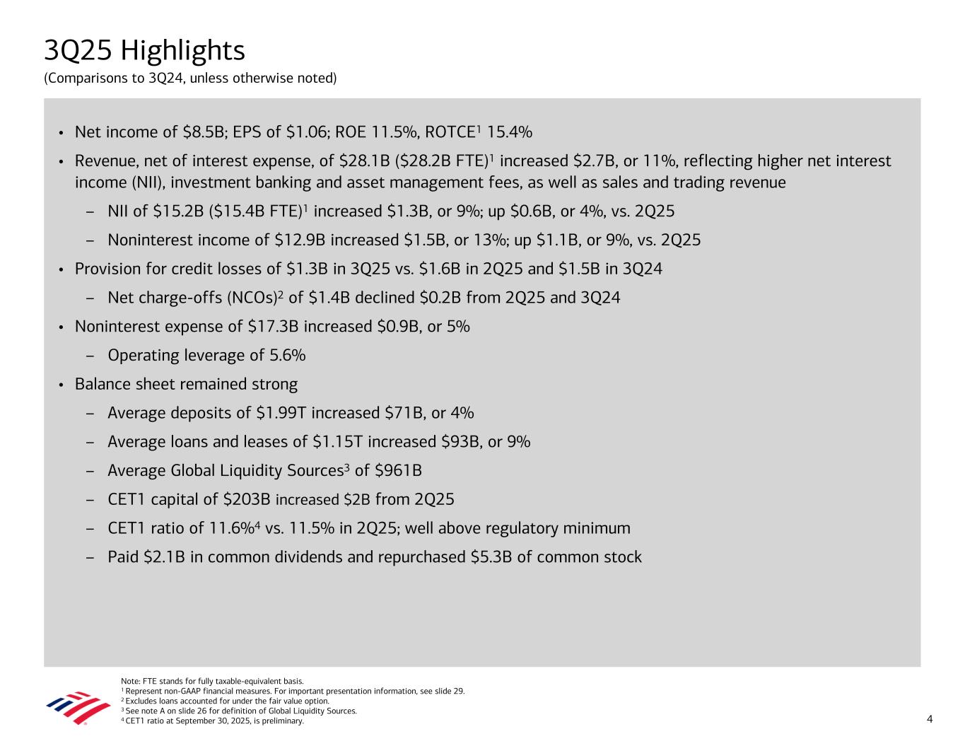 • Net income of $8.5B; EPS of $1.06; ROE 11.5%, ROTCE1 15.4% • Revenue, net of interest expense, of $28.1B ($28.2B FTE)1 increased $2.7B, or 11%, reflecting higher net interest income (NII), investment banking and asset management fees, as well as sales and trading revenue – NII of $15.2B ($15.4B FTE)1 increased $1.3B, or 9%; up $0.6B, or 4%, vs. 2Q25 – Noninterest income of $12.9B increased $1.5B, or 13%; up $1.1B, or 9%, vs. 2Q25 • Provision for credit losses of $1.3B in 3Q25 vs. $1.6B in 2Q25 and $1.5B in 3Q24 – Net charge-offs (NCOs)2 of $1.4B declined $0.2B from 2Q25 and 3Q24 • Noninterest expense of $17.3B increased $0.9B, or 5% – Operating leverage of 5.6% • Balance sheet remained strong – Average deposits of $1.99T increased $71B, or 4% – Average loans and leases of $1.15T increased $93B, or 9% – Average Global Liquidity Sources3 of $961B – CET1 capital of $203B increased $2B from 2Q25 – CET1 ratio of 11.6%4 vs. 11.5% in 2Q25; well above regulatory minimum – Paid $2.1B in common dividends and repurchased $5.3B of common stock Note: FTE stands for fully taxable-equivalent basis. 1 Represent non-GAAP financial measures. For important presentation information, see slide 29. 2 Excludes loans accounted for under the fair value option. 3 See note A on slide 26 for definition of Global Liquidity Sources. 4 CET1 ratio at September 30, 2025, is preliminary. 3Q25 Highlights (Comparisons to 3Q24, unless otherwise noted) 4