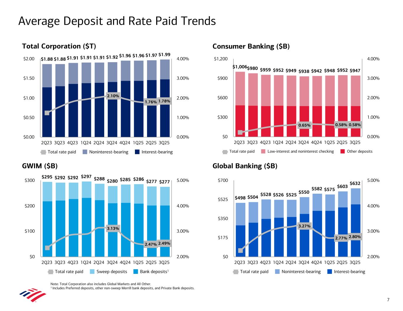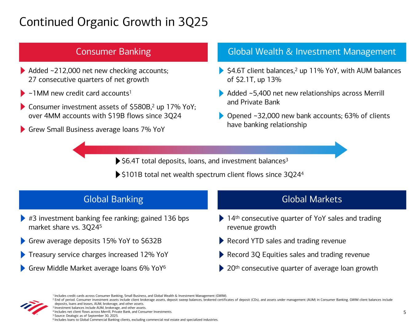 14th consecutive quarter of YoY sales and trading revenue growth Record YTD sales and trading revenue Record 3Q Equities sales and trading revenue 20th consecutive quarter of average loan growth Added ~212,000 net new checking accounts; 27 consecutive quarters of net growth ~1MM new credit card accounts1 Consumer investment assets of $580B,2 up 17% YoY; over 4MM accounts with $19B flows since 3Q24 Grew Small Business average loans 7% YoY 1 Includes credit cards across Consumer Banking, Small Business, and Global Wealth & Investment Management (GWIM). 2 End of period. Consumer investment assets include client brokerage assets, deposit sweep balances, brokered certificates of deposit (CDs), and assets under management (AUM) in Consumer Banking. GWIM client balances include deposits, loans and leases, AUM, brokerage, and other assets. 3 Investment balances include AUM, brokerage, and other assets. 4 Includes net client flows across Merrill, Private Bank, and Consumer Investments. 5 Source: Dealogic as of September 30, 2025. 6 Includes loans to Global Commercial Banking clients, excluding commercial real estate and specialized industries. #3 investment banking fee ranking; gained 136 bps market share vs. 3Q245 Grew average deposits 15% YoY to $632B Treasury service charges increased 12% YoY Grew Middle Market average loans 6% YoY6 $4.6T client balances,2 up 11% YoY, with AUM balances of $2.1T, up 13% Added ~5,400 net new relationships across Merrill and Private Bank Opened ~32,000 new bank accounts; 63% of clients have banking relationship Continued Organic Growth in 3Q25 5 Consumer Banking Global Wealth & Investment Management Global Banking Global Markets $6.4T total deposits, loans, and investment balances3 $101B total net wealth spectrum client flows since 3Q244