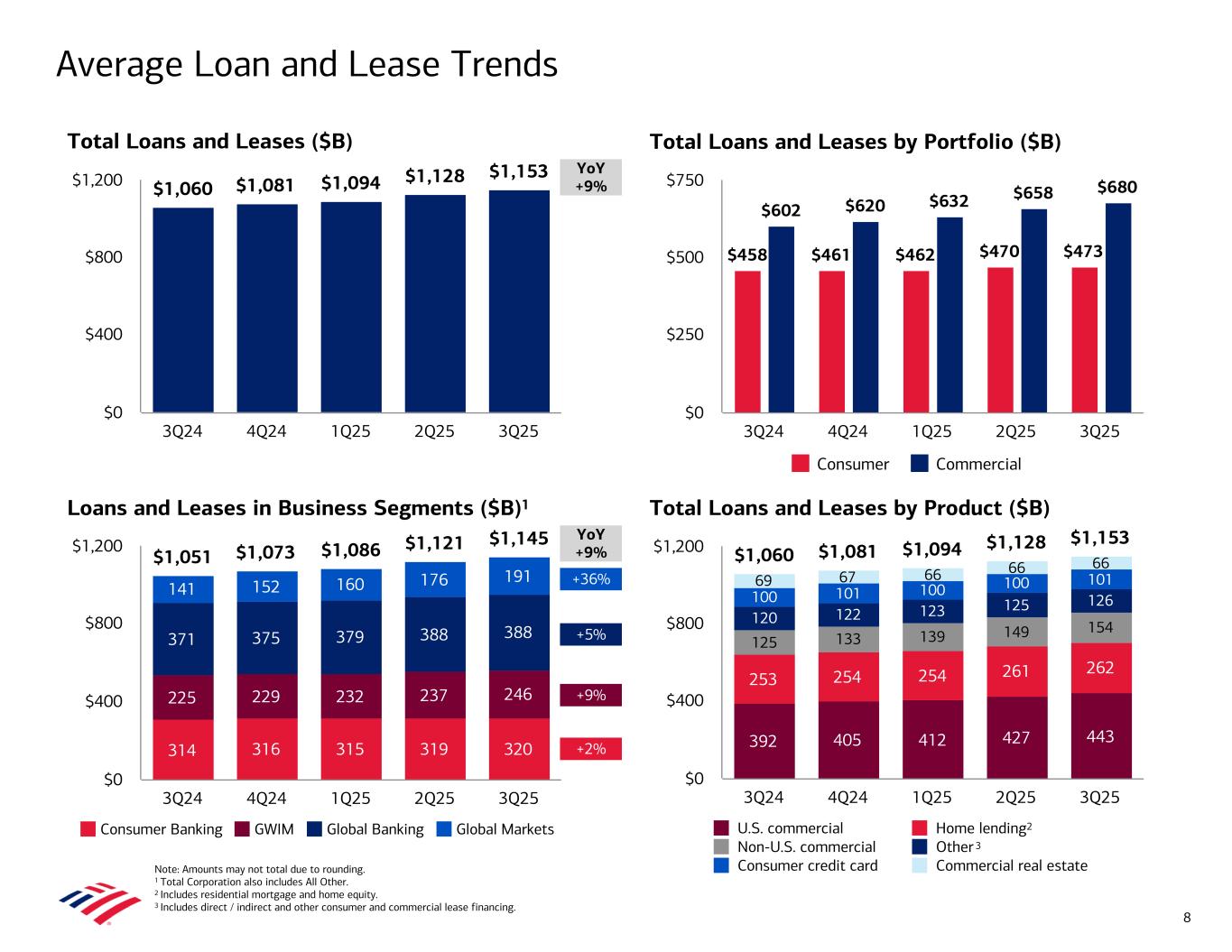 $1.88 $1.88 $1.91 $1.91 $1.91 $1.92 $1.96 $1.96 $1.97 $1.99 Total rate paid Noninterest-bearing Interest-bearing 2Q23 3Q23 4Q23 1Q24 2Q24 3Q24 4Q24 1Q25 2Q25 3Q25 $0.00 $0.50 $1.00 $1.50 $2.00 0.00% 1.00% 2.00% 3.00% 4.00% Consumer Banking ($B) GWIM ($B) Global Banking ($B) Total Corporation ($T) Average Deposit and Rate Paid Trends 7 $1,006$980 $959 $952 $949 $938 $942 $948 $952 $947 Total rate paid Low-interest and noninterest checking Other deposits 2Q23 3Q23 4Q23 1Q24 2Q24 3Q24 4Q24 1Q25 2Q25 3Q25 $0 $300 $600 $900 $1,200 0.00% 1.00% 2.00% 3.00% 4.00% $295 $292 $292 $297 $288 $280 $285 $286 $277 $277 Total rate paid Sweep deposits Bank deposits 2Q23 3Q23 4Q23 1Q24 2Q24 3Q24 4Q24 1Q25 2Q25 3Q25 $0 $100 $200 $300 2.00% 3.00% 4.00% 5.00% $498 $504 $528 $526 $525 $550 $582 $575 $603 $632 Total rate paid Noninterest-bearing Interest-bearing 2Q23 3Q23 4Q23 1Q24 2Q24 3Q24 4Q24 1Q25 2Q25 3Q25 $0 $175 $350 $525 $700 2.00% 3.00% 4.00% 5.00% Note: Total Corporation also includes Global Markets and All Other. 1 Includes Preferred deposits, other non-sweep Merrill bank deposits, and Private Bank deposits. 1 1.78% 0.58% 2.49% 2.80% 1.76% 2.47% 2.77% 0.58% 2.10% 0.65% 3.13% 3.27%