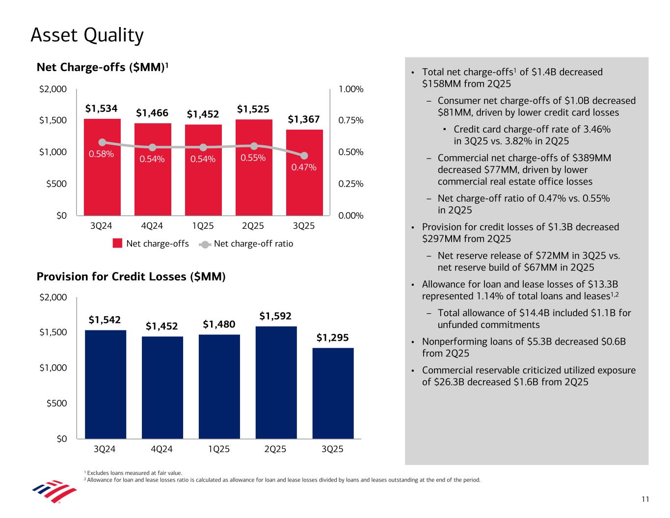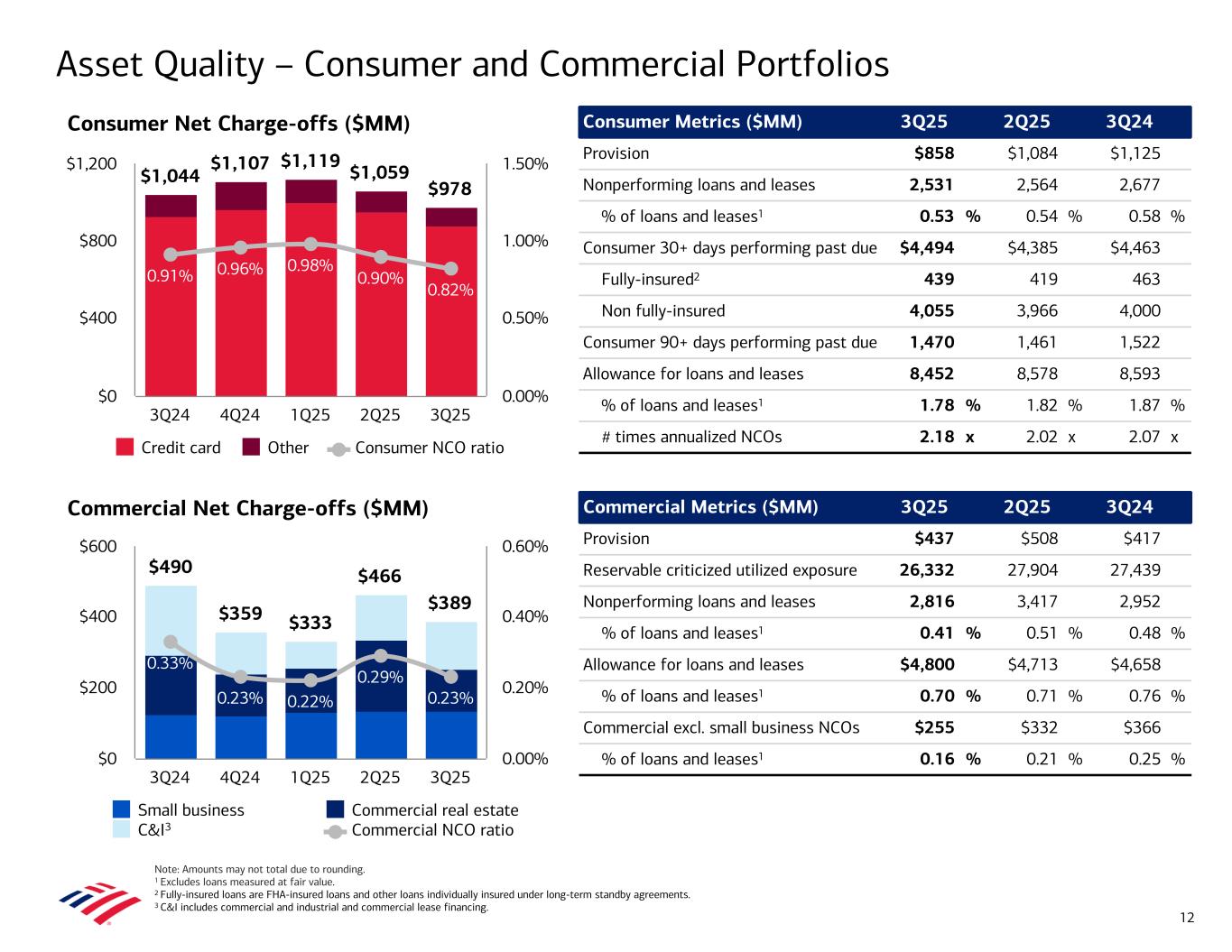 Commercial Net Charge-offs ($MM) Consumer Net Charge-offs ($MM) Asset Quality – Consumer and Commercial Portfolios $490 $359 $333 $466 $389 0.33% 0.23% 0.22% 0.29% 0.23% Small business Commercial real estate C&I Commercial NCO ratio 3Q24 4Q24 1Q25 2Q25 3Q25 $0 $200 $400 $600 0.00% 0.20% 0.40% 0.60% $1,044 $1,107 $1,119 $1,059 $978 0.91% 0.96% 0.98% 0.90% 0.82% Credit card Other Consumer NCO ratio 3Q24 4Q24 1Q25 2Q25 3Q25 $0 $400 $800 $1,200 0.00% 0.50% 1.00% 1.50% Commercial Metrics ($MM) 3Q25 2Q25 3Q24 Provision $437 $508 $417 Reservable criticized utilized exposure 26,332 27,904 27,439 Nonperforming loans and leases 2,816 3,417 2,952 % of loans and leases1 0.41 % 0.51 % 0.48 % Allowance for loans and leases $4,800 $4,713 $4,658 % of loans and leases1 0.70 % 0.71 % 0.76 % Commercial excl. small business NCOs $255 $332 $366 % of loans and leases1 0.16 % 0.21 % 0.25 % Consumer Metrics ($MM) 3Q25 2Q25 3Q24 Provision $858 $1,084 $1,125 Nonperforming loans and leases 2,531 2,564 2,677 % of loans and leases1 0.53 % 0.54 % 0.58 % Consumer 30+ days performing past due $4,494 $4,385 $4,463 Fully-insured2 439 419 463 Non fully-insured 4,055 3,966 4,000 Consumer 90+ days performing past due 1,470 1,461 1,522 Allowance for loans and leases 8,452 8,578 8,593 % of loans and leases1 1.78 % 1.82 % 1.87 % # times annualized NCOs 2.18 x 2.02 x 2.07 x 12 3 Note: Amounts may not total due to rounding. 1 Excludes loans measured at fair value. 2 Fully-insured loans are FHA-insured loans and other loans individually insured under long-term standby agreements. 3 C&I includes commercial and industrial and commercial lease financing.