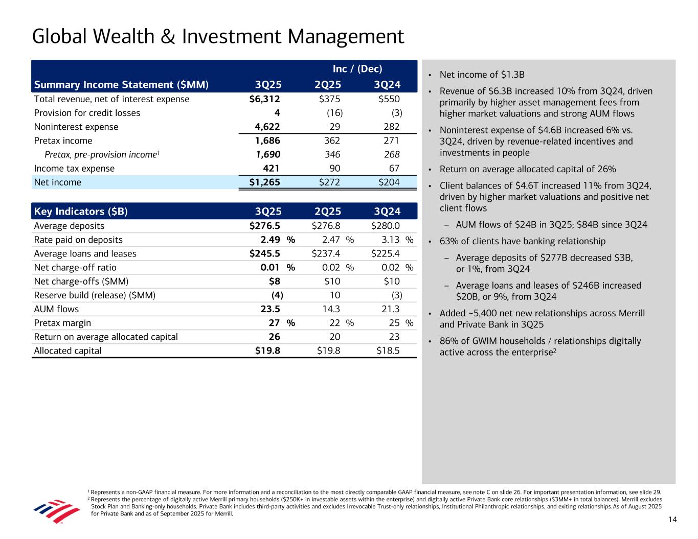 • Net income of $1.3B • Revenue of $6.3B increased 10% from 3Q24, driven primarily by higher asset management fees from higher market valuations and strong AUM flows • Noninterest expense of $4.6B increased 6% vs. 3Q24, driven by revenue-related incentives and investments in people • Return on average allocated capital of 26% • Client balances of $4.6T increased 11% from 3Q24, driven by higher market valuations and positive net client flows – AUM flows of $24B in 3Q25; $84B since 3Q24 • 63% of clients have banking relationship – Average deposits of $277B decreased $3B, or 1%, from 3Q24 – Average loans and leases of $246B increased $20B, or 9%, from 3Q24 • Added ~5,400 net new relationships across Merrill and Private Bank in 3Q25 • 86% of GWIM households / relationships digitally active across the enterprise2 Global Wealth & Investment Management 1 Represents a non-GAAP financial measure. For more information and a reconciliation to the most directly comparable GAAP financial measure, see note C on slide 26. For important presentation information, see slide 29. 2 Represents the percentage of digitally active Merrill primary households ($250K+ in investable assets within the enterprise) and digitally active Private Bank core relationships ($3MM+ in total balances). Merrill excludes Stock Plan and Banking-only households. Private Bank includes third-party activities and excludes Irrevocable Trust-only relationships, Institutional Philanthropic relationships, and exiting relationships. As of August 2025 for Private Bank and as of September 2025 for Merrill. Inc / (Dec) Summary Income Statement ($MM) 3Q25 2Q25 3Q24 Total revenue, net of interest expense $6,312 $375 $550 Provision for credit losses 4 (16) (3) Noninterest expense 4,622 29 282 Pretax income 1,686 362 271 Pretax, pre-provision income1 1,690 346 268 Income tax expense 421 90 67 Net income $1,265 $272 $204 Key Indicators ($B) 3Q25 2Q25 3Q24 Average deposits $276.5 $276.8 $280.0 Rate paid on deposits 2.49 % 2.47 % 3.13 % Average loans and leases $245.5 $237.4 $225.4 Net charge-off ratio 0.01 % 0.02 % 0.02 % Net charge-offs ($MM) $8 $10 $10 Reserve build (release) ($MM) (4) 10 (3) AUM flows 23.5 14.3 21.3 Pretax margin 27 % 22 % 25 % Return on average allocated capital 26 20 23 Allocated capital $19.8 $19.8 $18.5 14