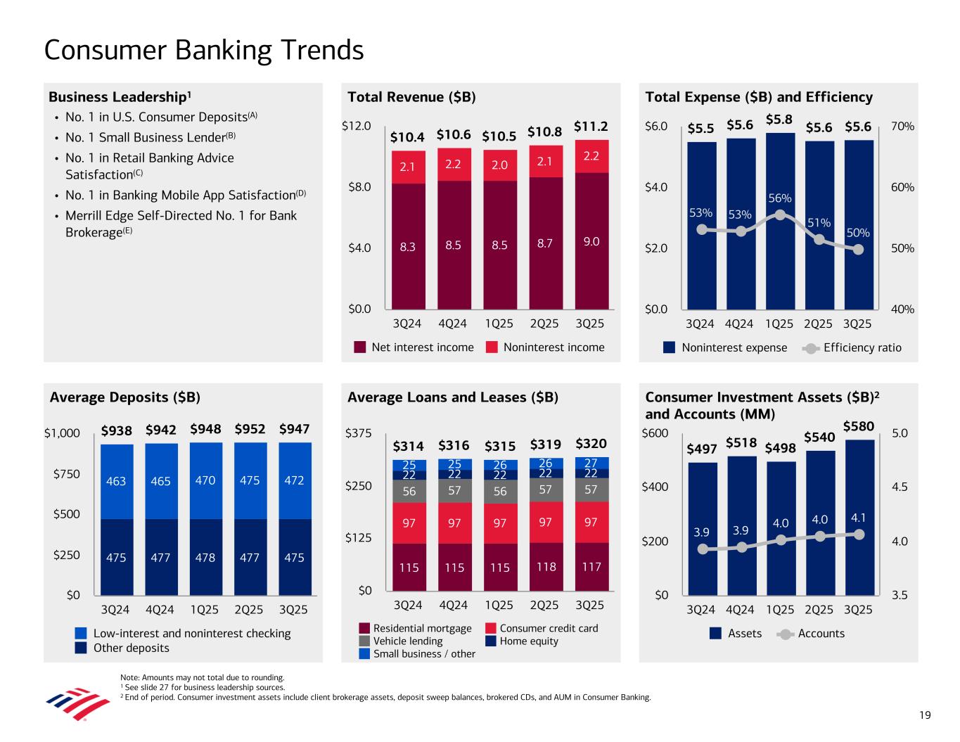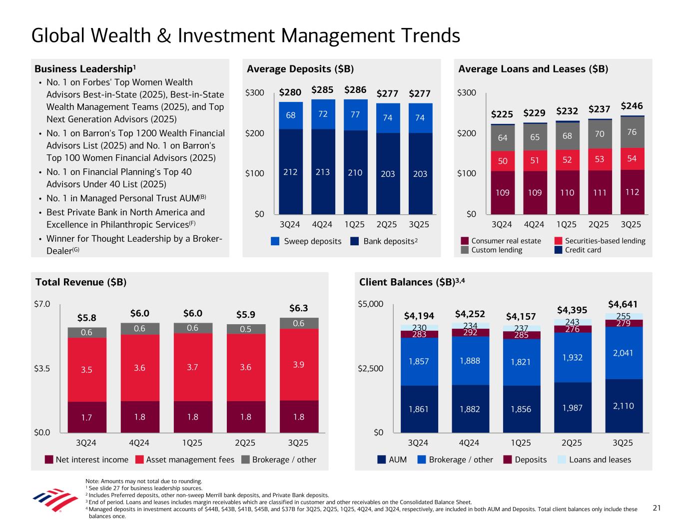 Note: Amounts may not total due to rounding. 1 See slide 27 for business leadership sources. 2 Includes Preferred deposits, other non-sweep Merrill bank deposits, and Private Bank deposits. 3 End of period. Loans and leases includes margin receivables which are classified in customer and other receivables on the Consolidated Balance Sheet. 4 Managed deposits in investment accounts of $44B, $43B, $41B, $45B, and $37B for 3Q25, 2Q25, 1Q25, 4Q24, and 3Q24, respectively, are included in both AUM and Deposits. Total client balances only include these balances once. Average Deposits ($B) Global Wealth & Investment Management Trends Business Leadership1 • No. 1 on Forbes' Top Women Wealth Advisors Best-in-State (2025), Best-in-State Wealth Management Teams (2025), and Top Next Generation Advisors (2025) • No. 1 on Barron's Top 1200 Wealth Financial Advisors List (2025) and No. 1 on Barron's Top 100 Women Financial Advisors (2025) • No. 1 on Financial Planning's Top 40 Advisors Under 40 List (2025) • No. 1 in Managed Personal Trust AUM(B) • Best Private Bank in North America and Excellence in Philanthropic Services(F) • Winner for Thought Leadership by a Broker- Dealer(G) Average Loans and Leases ($B) Total Revenue ($B) Client Balances ($B)3,4 $5.8 $6.0 $6.0 $5.9 $6.3 1.7 1.8 1.8 1.8 1.8 3.5 3.6 3.7 3.6 3.9 0.6 0.6 0.6 0.5 0.6 Net interest income Asset management fees Brokerage / other 3Q24 4Q24 1Q25 2Q25 3Q25 $0.0 $3.5 $7.0 1,861 1,882 1,856 1,987 2,110 1,857 1,888 1,821 1,932 2,041 283 292 285 276 279230 234 237 243 255$4,194 $4,252 $4,157 $4,395 $4,641 AUM Brokerage / other Deposits Loans and leases 3Q24 4Q24 1Q25 2Q25 3Q25 $0 $2,500 $5,000 $225 $229 $232 $237 $246 109 109 110 111 112 50 51 52 53 54 64 65 68 70 76 Consumer real estate Securities-based lending Custom lending Credit card 3Q24 4Q24 1Q25 2Q25 3Q25 $0 $100 $200 $300$280 $285 $286 $277 $277 212 213 210 203 203 68 72 77 74 74 Sweep deposits Bank deposits 3Q24 4Q24 1Q25 2Q25 3Q25 $0 $100 $200 $300 21 2