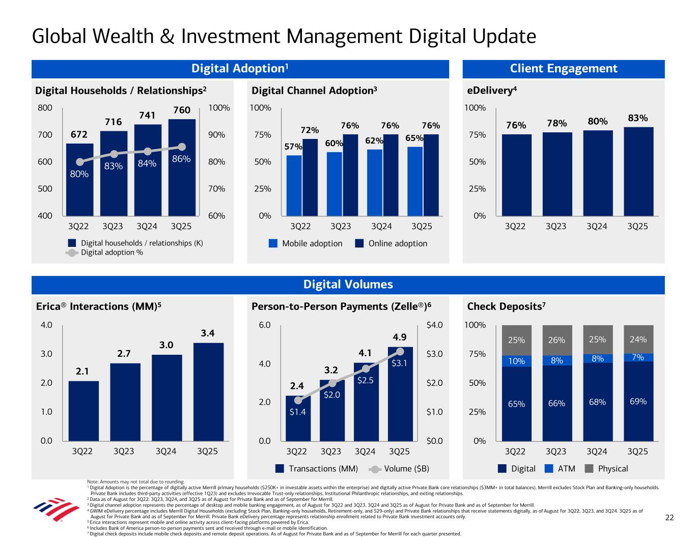 Erica® Interactions (MM)5 2.1 2.7 3.0 3.4 3Q22 3Q23 3Q24 3Q25 0.0 1.0 2.0 3.0 4.0 Person-to-Person Payments (Zelle®)6 Check Deposits7 eDelivery4Digital Households / Relationships2 Digital Channel Adoption3 76% 78% 80% 83% 3Q22 3Q23 3Q24 3Q25 0% 25% 50% 75% 100% 57% 60% 62% 65% 72% 76% 76% 76% Mobile adoption Online adoption 3Q22 3Q23 3Q24 3Q25 0% 25% 50% 75% 100% 672 716 741 760 80% 83% 84% 86% Digital households / relationships (K) Digital adoption % 3Q22 3Q23 3Q24 3Q25 400 500 600 700 800 60% 70% 80% 90% 100% Client Engagement Digital Volumes Global Wealth & Investment Management Digital Update 22 Digital Adoption1 2.4 3.2 4.1 4.9 $1.4 $2.0 $2.5 $3.1 Transactions (MM) Volume ($B) 3Q22 3Q23 3Q24 3Q25 0.0 2.0 4.0 6.0 $0.0 $1.0 $2.0 $3.0 $4.0 65% 66% 68% 69% 10% 8% 8% 7% 25% 26% 25% 24% Digital ATM Physical 3Q22 3Q23 3Q24 3Q25 0% 25% 50% 75% 100% Note: Amounts may not total due to rounding. 1 Digital Adoption is the percentage of digitally active Merrill primary households ($250K+ in investable assets within the enterprise) and digitally active Private Bank core relationships ($3MM+ in total balances). Merrill excludes Stock Plan and Banking-only households. Private Bank includes third-party activities (effective 1Q23) and excludes Irrevocable Trust-only relationships, Institutional Philanthropic relationships, and exiting relationships. 2 Data as of August for 3Q22. 3Q23, 3Q24, and 3Q25 as of August for Private Bank and as of September for Merrill. 3 Digital channel adoption represents the percentage of desktop and mobile banking engagement, as of August for 3Q22 and 3Q23. 3Q24 and 3Q25 as of August for Private Bank and as of September for Merrill. 4 GWIM eDelivery percentage includes Merrill Digital Households (excluding Stock Plan, Banking-only households, Retirement-only, and 529-only) and Private Bank relationships that receive statements digitally, as of August for 3Q22, 3Q23, and 3Q24. 3Q25 as of August for Private Bank and as of September for Merrill. Private Bank eDelivery percentage represents relationship enrollment related to Private Bank investment accounts only. 5 Erica interactions represent mobile and online activity across client-facing platforms powered by Erica. 6 Includes Bank of America person-to-person payments sent and received through e-mail or mobile identification. 7 Digital check deposits include mobile check deposits and remote deposit operations. As of August for Private Bank and as of September for Merrill for each quarter presented.