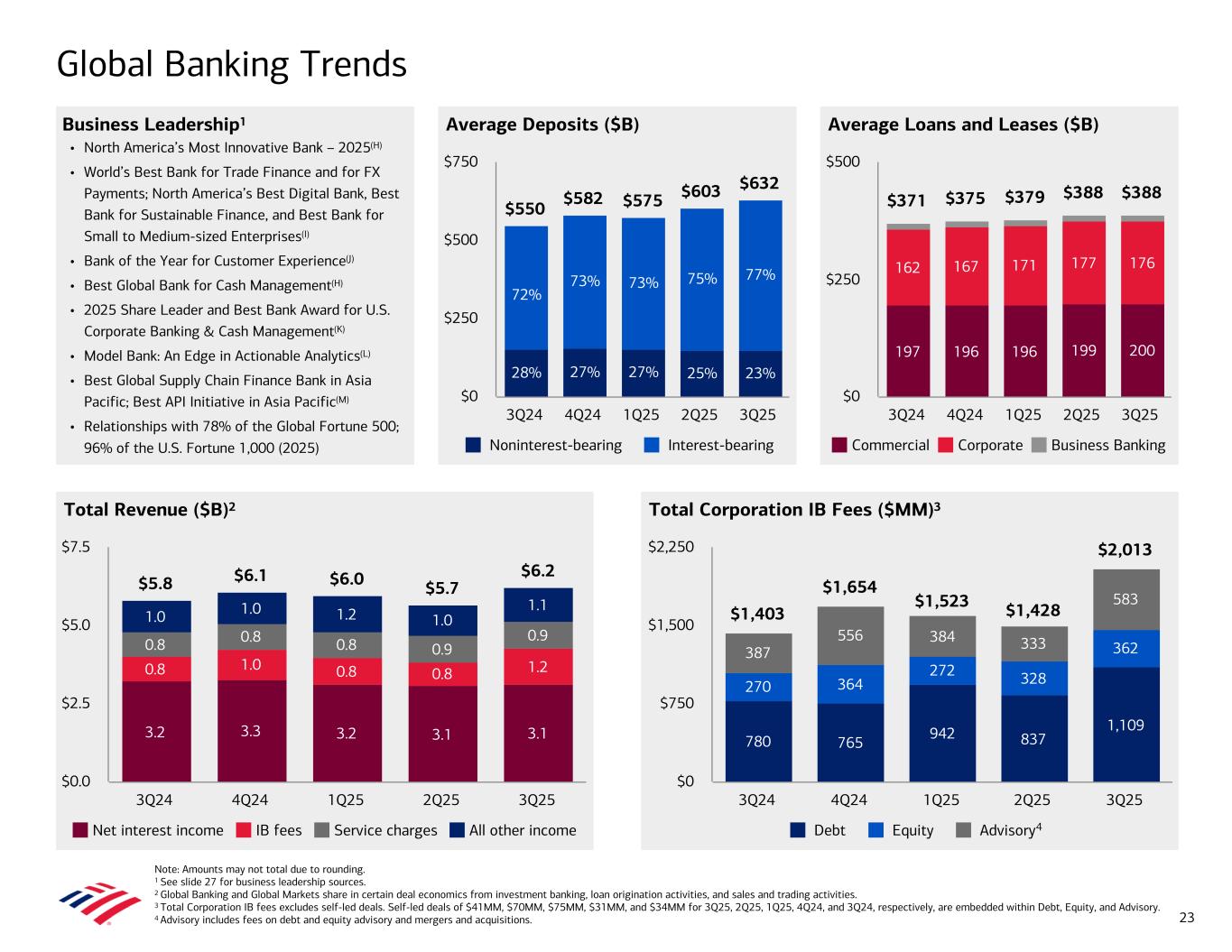 Global Banking Trends Note: Amounts may not total due to rounding. 1 See slide 27 for business leadership sources. 2 Global Banking and Global Markets share in certain deal economics from investment banking, loan origination activities, and sales and trading activities. 3 Total Corporation IB fees excludes self-led deals. Self-led deals of $41MM, $70MM, $75MM, $31MM, and $34MM for 3Q25, 2Q25, 1Q25, 4Q24, and 3Q24, respectively, are embedded within Debt, Equity, and Advisory. 4 Advisory includes fees on debt and equity advisory and mergers and acquisitions. Average Deposits ($B)Business Leadership1 • North America’s Most Innovative Bank – 2025(H) • World’s Best Bank for Trade Finance and for FX Payments; North America’s Best Digital Bank, Best Bank for Sustainable Finance, and Best Bank for Small to Medium-sized Enterprises(I) • Bank of the Year for Customer Experience(J) • Best Global Bank for Cash Management(H) • 2025 Share Leader and Best Bank Award for U.S. Corporate Banking & Cash Management(K) • Model Bank: An Edge in Actionable Analytics(L) • Best Global Supply Chain Finance Bank in Asia Pacific; Best API Initiative in Asia Pacific(M) • Relationships with 78% of the Global Fortune 500; 96% of the U.S. Fortune 1,000 (2025) Average Loans and Leases ($B) Total Revenue ($B)2 Total Corporation IB Fees ($MM)3 $5.8 $6.1 $6.0 $5.7 $6.2 3.2 3.3 3.2 3.1 3.1 0.8 1.0 0.8 0.8 1.2 0.8 0.8 0.8 0.9 0.9 1.0 1.0 1.2 1.0 1.1 Net interest income IB fees Service charges All other income 3Q24 4Q24 1Q25 2Q25 3Q25 $0.0 $2.5 $5.0 $7.5 780 765 942 837 1,109 270 364 272 328 362387 556 384 333 583 $1,403 $1,654 $1,523 $1,428 $2,013 Debt Equity Advisory 3Q24 4Q24 1Q25 2Q25 3Q25 $0 $750 $1,500 $2,250 197 196 196 199 200 162 167 171 177 176 $371 $375 $379 $388 $388 Commercial Corporate Business Banking 3Q24 4Q24 1Q25 2Q25 3Q25 $0 $250 $500 4 $550 $582 $575 $603 $632 Noninterest-bearing Interest-bearing 3Q24 4Q24 1Q25 2Q25 3Q25 $0 $250 $500 $750 23 28% 27% 27% 25% 23% 72% 73% 73% 75% 77%