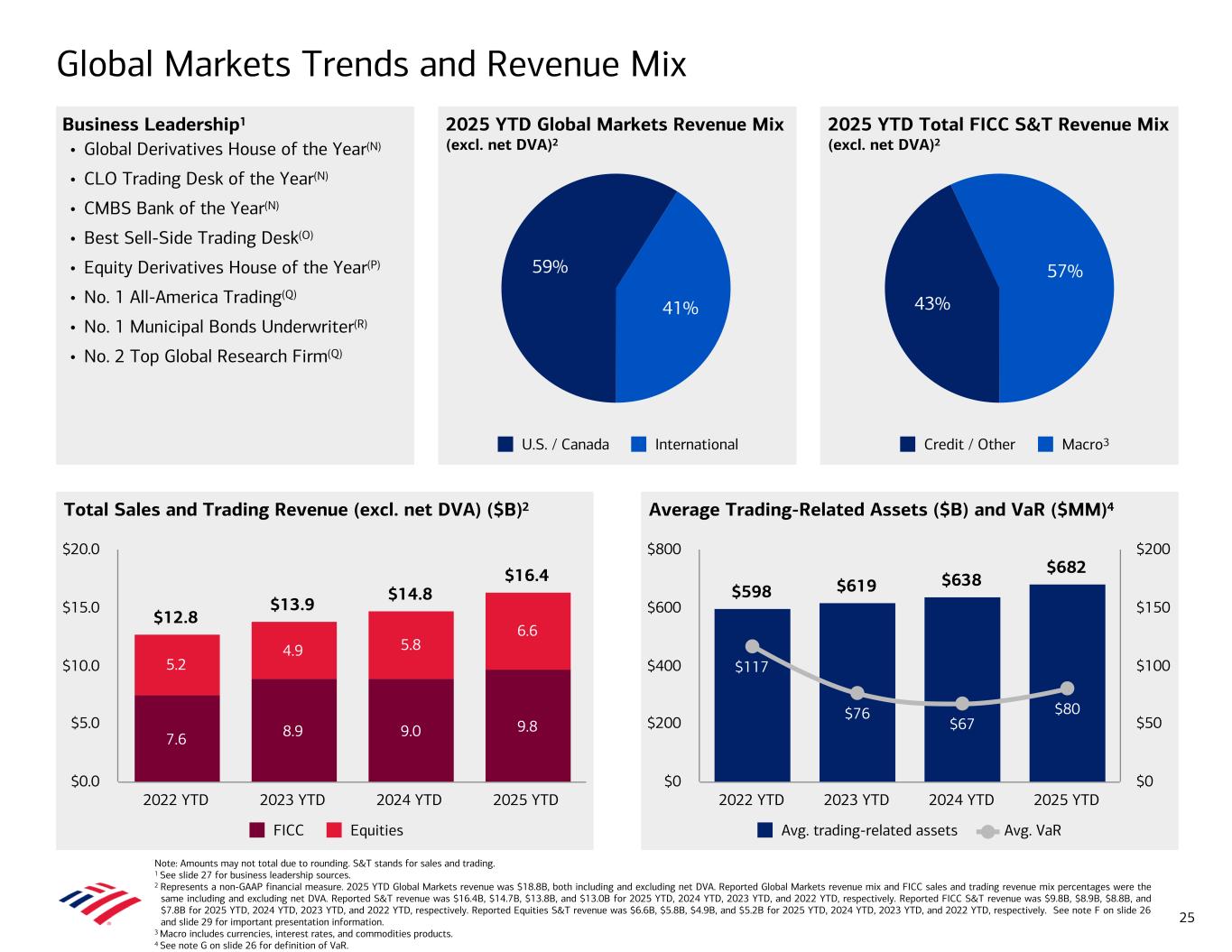Note: Amounts may not total due to rounding. S&T stands for sales and trading. 1 See slide 27 for business leadership sources. 2 Represents a non-GAAP financial measure. 2025 YTD Global Markets revenue was $18.8B, both including and excluding net DVA. Reported Global Markets revenue mix and FICC sales and trading revenue mix percentages were the same including and excluding net DVA. Reported S&T revenue was $16.4B, $14.7B, $13.8B, and $13.0B for 2025 YTD, 2024 YTD, 2023 YTD, and 2022 YTD, respectively. Reported FICC S&T revenue was $9.8B, $8.9B, $8.8B, and $7.8B for 2025 YTD, 2024 YTD, 2023 YTD, and 2022 YTD, respectively. Reported Equities S&T revenue was $6.6B, $5.8B, $4.9B, and $5.2B for 2025 YTD, 2024 YTD, 2023 YTD, and 2022 YTD, respectively. See note F on slide 26 and slide 29 for important presentation information. 3 Macro includes currencies, interest rates, and commodities products. 4 See note G on slide 26 for definition of VaR. Global Markets Trends and Revenue Mix 2025 YTD Global Markets Revenue Mix (excl. net DVA)2 Business Leadership1 • Global Derivatives House of the Year(N) • CLO Trading Desk of the Year(N) • CMBS Bank of the Year(N) • Best Sell-Side Trading Desk(O) • Equity Derivatives House of the Year(P) • No. 1 All-America Trading(Q) • No. 1 Municipal Bonds Underwriter(R) • No. 2 Top Global Research Firm(Q) 2025 YTD Total FICC S&T Revenue Mix (excl. net DVA)2 Total Sales and Trading Revenue (excl. net DVA) ($B)2 Average Trading-Related Assets ($B) and VaR ($MM)4 $12.8 $13.9 $14.8 $16.4 7.6 8.9 9.0 9.8 5.2 4.9 5.8 6.6 FICC Equities 2022 YTD 2023 YTD 2024 YTD 2025 YTD $0.0 $5.0 $10.0 $15.0 $20.0 $598 $619 $638 $682 $117 $76 $67 $80 Avg. trading-related assets Avg. VaR 2022 YTD 2023 YTD 2024 YTD 2025 YTD $0 $200 $400 $600 $800 $0 $50 $100 $150 $200 59% 41% U.S. / Canada International 43% 57% Credit / Other Macro 25 3