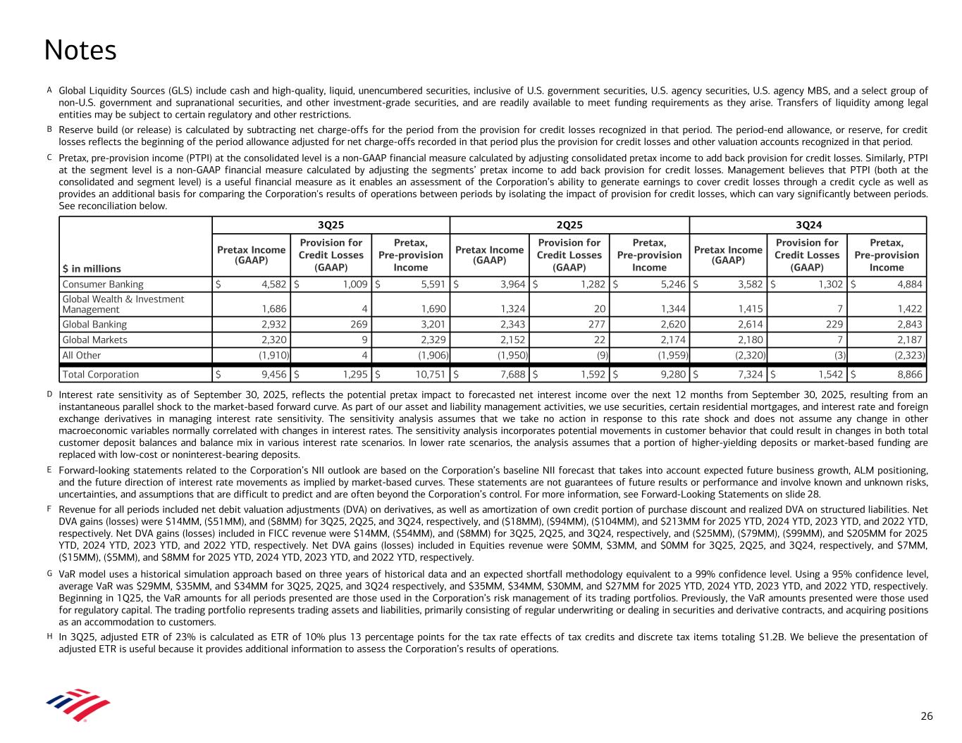 A Global Liquidity Sources (GLS) include cash and high-quality, liquid, unencumbered securities, inclusive of U.S. government securities, U.S. agency securities, U.S. agency MBS, and a select group of non-U.S. government and supranational securities, and other investment-grade securities, and are readily available to meet funding requirements as they arise. Transfers of liquidity among legal entities may be subject to certain regulatory and other restrictions. B Reserve build (or release) is calculated by subtracting net charge-offs for the period from the provision for credit losses recognized in that period. The period-end allowance, or reserve, for credit losses reflects the beginning of the period allowance adjusted for net charge-offs recorded in that period plus the provision for credit losses and other valuation accounts recognized in that period. C Pretax, pre-provision income (PTPI) at the consolidated level is a non-GAAP financial measure calculated by adjusting consolidated pretax income to add back provision for credit losses. Similarly, PTPI at the segment level is a non-GAAP financial measure calculated by adjusting the segments’ pretax income to add back provision for credit losses. Management believes that PTPI (both at the consolidated and segment level) is a useful financial measure as it enables an assessment of the Corporation’s ability to generate earnings to cover credit losses through a credit cycle as well as provides an additional basis for comparing the Corporation's results of operations between periods by isolating the impact of provision for credit losses, which can vary significantly between periods. See reconciliation below. D Interest rate sensitivity as of September 30, 2025, reflects the potential pretax impact to forecasted net interest income over the next 12 months from September 30, 2025, resulting from an instantaneous parallel shock to the market-based forward curve. As part of our asset and liability management activities, we use securities, certain residential mortgages, and interest rate and foreign exchange derivatives in managing interest rate sensitivity. The sensitivity analysis assumes that we take no action in response to this rate shock and does not assume any change in other macroeconomic variables normally correlated with changes in interest rates. The sensitivity analysis incorporates potential movements in customer behavior that could result in changes in both total customer deposit balances and balance mix in various interest rate scenarios. In lower rate scenarios, the analysis assumes that a portion of higher-yielding deposits or market-based funding are replaced with low-cost or noninterest-bearing deposits. E Forward-looking statements related to the Corporation’s NII outlook are based on the Corporation’s baseline NII forecast that takes into account expected future business growth, ALM positioning, and the future direction of interest rate movements as implied by market-based curves. These statements are not guarantees of future results or performance and involve known and unknown risks, uncertainties, and assumptions that are difficult to predict and are often beyond the Corporation’s control. For more information, see Forward-Looking Statements on slide 28. F Revenue for all periods included net debit valuation adjustments (DVA) on derivatives, as well as amortization of own credit portion of purchase discount and realized DVA on structured liabilities. Net DVA gains (losses) were $14MM, ($51MM), and ($8MM) for 3Q25, 2Q25, and 3Q24, respectively, and ($18MM), ($94MM), ($104MM), and $213MM for 2025 YTD, 2024 YTD, 2023 YTD, and 2022 YTD, respectively. Net DVA gains (losses) included in FICC revenue were $14MM, ($54MM), and ($8MM) for 3Q25, 2Q25, and 3Q24, respectively, and ($25MM), ($79MM), ($99MM), and $205MM for 2025 YTD, 2024 YTD, 2023 YTD, and 2022 YTD, respectively. Net DVA gains (losses) included in Equities revenue were $0MM, $3MM, and $0MM for 3Q25, 2Q25, and 3Q24, respectively, and $7MM, ($15MM), ($5MM), and $8MM for 2025 YTD, 2024 YTD, 2023 YTD, and 2022 YTD, respectively. G VaR model uses a historical simulation approach based on three years of historical data and an expected shortfall methodology equivalent to a 99% confidence level. Using a 95% confidence level, average VaR was $29MM, $35MM, and $34MM for 3Q25, 2Q25, and 3Q24 respectively, and $35MM, $34MM, $30MM, and $27MM for 2025 YTD, 2024 YTD, 2023 YTD, and 2022 YTD, respectively. Beginning in 1Q25, the VaR amounts for all periods presented are those used in the Corporation’s risk management of its trading portfolios. Previously, the VaR amounts presented were those used for regulatory capital. The trading portfolio represents trading assets and liabilities, primarily consisting of regular underwriting or dealing in securities and derivative contracts, and acquiring positions as an accommodation to customers. H In 3Q25, adjusted ETR of 23% is calculated as ETR of 10% plus 13 percentage points for the tax rate effects of tax credits and discrete tax items totaling $1.2B. We believe the presentation of adjusted ETR is useful because it provides additional information to assess the Corporation’s results of operations. Notes $ in millions 3Q25 2Q25 3Q24 Pretax Income (GAAP) Provision for Credit Losses (GAAP) Pretax, Pre-provision Income Pretax Income (GAAP) Provision for Credit Losses (GAAP) Pretax, Pre-provision Income Pretax Income (GAAP) Provision for Credit Losses (GAAP) Pretax, Pre-provision Income Consumer Banking $ 4,582 $ 1,009 $ 5,591 $ 3,964 $ 1,282 $ 5,246 $ 3,582 $ 1,302 $ 4,884 Global Wealth & Investment Management 1,686 4 1,690 1,324 20 1,344 1,415 7 1,422 Global Banking 2,932 269 3,201 2,343 277 2,620 2,614 229 2,843 Global Markets 2,320 9 2,329 2,152 22 2,174 2,180 7 2,187 All Other (1,910) 4 (1,906) (1,950) (9) (1,959) (2,320) (3) (2,323) Total Corporation $ 9,456 $ 1,295 $ 10,751 $ 7,688 $ 1,592 $ 9,280 $ 7,324 $ 1,542 $ 8,866 26