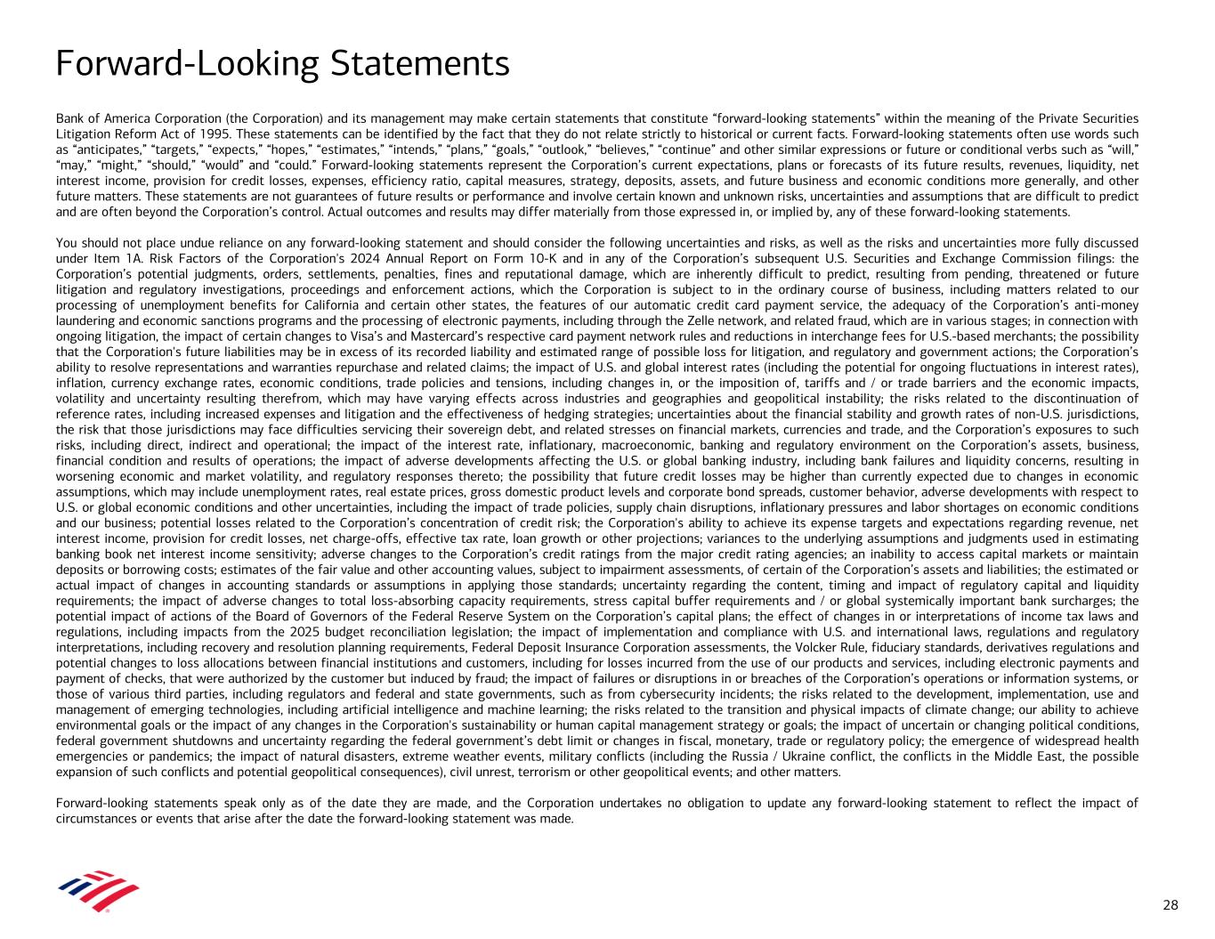 Forward-Looking Statements Bank of America Corporation (the Corporation) and its management may make certain statements that constitute “forward-looking statements” within the meaning of the Private Securities Litigation Reform Act of 1995. These statements can be identified by the fact that they do not relate strictly to historical or current facts. Forward-looking statements often use words such as “anticipates,” “targets,” “expects,” “hopes,” “estimates,” “intends,” “plans,” “goals,” “outlook,” “believes,” “continue” and other similar expressions or future or conditional verbs such as “will,” “may,” “might,” “should,” “would” and “could.” Forward-looking statements represent the Corporation’s current expectations, plans or forecasts of its future results, revenues, liquidity, net interest income, provision for credit losses, expenses, efficiency ratio, capital measures, strategy, deposits, assets, and future business and economic conditions more generally, and other future matters. These statements are not guarantees of future results or performance and involve certain known and unknown risks, uncertainties and assumptions that are difficult to predict and are often beyond the Corporation’s control. Actual outcomes and results may differ materially from those expressed in, or implied by, any of these forward-looking statements. You should not place undue reliance on any forward-looking statement and should consider the following uncertainties and risks, as well as the risks and uncertainties more fully discussed under Item 1A. Risk Factors of the Corporation's 2024 Annual Report on Form 10-K and in any of the Corporation’s subsequent U.S. Securities and Exchange Commission filings: the Corporation’s potential judgments, orders, settlements, penalties, fines and reputational damage, which are inherently difficult to predict, resulting from pending, threatened or future litigation and regulatory investigations, proceedings and enforcement actions, which the Corporation is subject to in the ordinary course of business, including matters related to our processing of unemployment benefits for California and certain other states, the features of our automatic credit card payment service, the adequacy of the Corporation’s anti-money laundering and economic sanctions programs and the processing of electronic payments, including through the Zelle network, and related fraud, which are in various stages; in connection with ongoing litigation, the impact of certain changes to Visa’s and Mastercard’s respective card payment network rules and reductions in interchange fees for U.S.-based merchants; the possibility that the Corporation's future liabilities may be in excess of its recorded liability and estimated range of possible loss for litigation, and regulatory and government actions; the Corporation’s ability to resolve representations and warranties repurchase and related claims; the impact of U.S. and global interest rates (including the potential for ongoing fluctuations in interest rates), inflation, currency exchange rates, economic conditions, trade policies and tensions, including changes in, or the imposition of, tariffs and / or trade barriers and the economic impacts, volatility and uncertainty resulting therefrom, which may have varying effects across industries and geographies and geopolitical instability; the risks related to the discontinuation of reference rates, including increased expenses and litigation and the effectiveness of hedging strategies; uncertainties about the financial stability and growth rates of non-U.S. jurisdictions, the risk that those jurisdictions may face difficulties servicing their sovereign debt, and related stresses on financial markets, currencies and trade, and the Corporation’s exposures to such risks, including direct, indirect and operational; the impact of the interest rate, inflationary, macroeconomic, banking and regulatory environment on the Corporation’s assets, business, financial condition and results of operations; the impact of adverse developments affecting the U.S. or global banking industry, including bank failures and liquidity concerns, resulting in worsening economic and market volatility, and regulatory responses thereto; the possibility that future credit losses may be higher than currently expected due to changes in economic assumptions, which may include unemployment rates, real estate prices, gross domestic product levels and corporate bond spreads, customer behavior, adverse developments with respect to U.S. or global economic conditions and other uncertainties, including the impact of trade policies, supply chain disruptions, inflationary pressures and labor shortages on economic conditions and our business; potential losses related to the Corporation’s concentration of credit risk; the Corporation's ability to achieve its expense targets and expectations regarding revenue, net interest income, provision for credit losses, net charge-offs, effective tax rate, loan growth or other projections; variances to the underlying assumptions and judgments used in estimating banking book net interest income sensitivity; adverse changes to the Corporation’s credit ratings from the major credit rating agencies; an inability to access capital markets or maintain deposits or borrowing costs; estimates of the fair value and other accounting values, subject to impairment assessments, of certain of the Corporation’s assets and liabilities; the estimated or actual impact of changes in accounting standards or assumptions in applying those standards; uncertainty regarding the content, timing and impact of regulatory capital and liquidity requirements; the impact of adverse changes to total loss-absorbing capacity requirements, stress capital buffer requirements and / or global systemically important bank surcharges; the potential impact of actions of