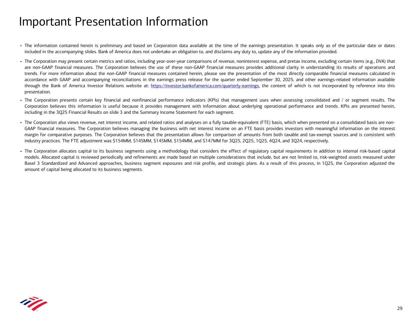 Important Presentation Information 29 • The information contained herein is preliminary and based on Corporation data available at the time of the earnings presentation. It speaks only as of the particular date or dates included in the accompanying slides. Bank of America does not undertake an obligation to, and disclaims any duty to, update any of the information provided. • The Corporation may present certain metrics and ratios, including year-over-year comparisons of revenue, noninterest expense, and pretax income, excluding certain items (e.g., DVA) that are non-GAAP financial measures. The Corporation believes the use of these non-GAAP financial measures provides additional clarity in understanding its results of operations and trends. For more information about the non-GAAP financial measures contained herein, please see the presentation of the most directly comparable financial measures calculated in accordance with GAAP and accompanying reconciliations in the earnings press release for the quarter ended September 30, 2025, and other earnings-related information available through the Bank of America Investor Relations website at: https://investor.bankofamerica.com/quarterly-earnings, the content of which is not incorporated by reference into this presentation. • The Corporation presents certain key financial and nonfinancial performance indicators (KPIs) that management uses when assessing consolidated and / or segment results. The Corporation believes this information is useful because it provides management with information about underlying operational performance and trends. KPIs are presented herein, including in the 3Q25 Financial Results on slide 3 and the Summary Income Statement for each segment. • The Corporation also views revenue, net interest income, and related ratios and analyses on a fully taxable-equivalent (FTE) basis, which when presented on a consolidated basis are non- GAAP financial measures. The Corporation believes managing the business with net interest income on an FTE basis provides investors with meaningful information on the interest margin for comparative purposes. The Corporation believes that the presentation allows for comparison of amounts from both taxable and tax-exempt sources and is consistent with industry practices. The FTE adjustment was $154MM, $145MM, $145MM, $154MM, and $147MM for 3Q25, 2Q25, 1Q25, 4Q24, and 3Q24, respectively. • The Corporation allocates capital to its business segments using a methodology that considers the effect of regulatory capital requirements in addition to internal risk-based capital models. Allocated capital is reviewed periodically and refinements are made based on multiple considerations that include, but are not limited to, risk-weighted assets measured under Basel 3 Standardized and Advanced approaches, business segment exposures and risk profile, and strategic plans. As a result of this process, in 1Q25, the Corporation adjusted the amount of capital being allocated to its business segments.