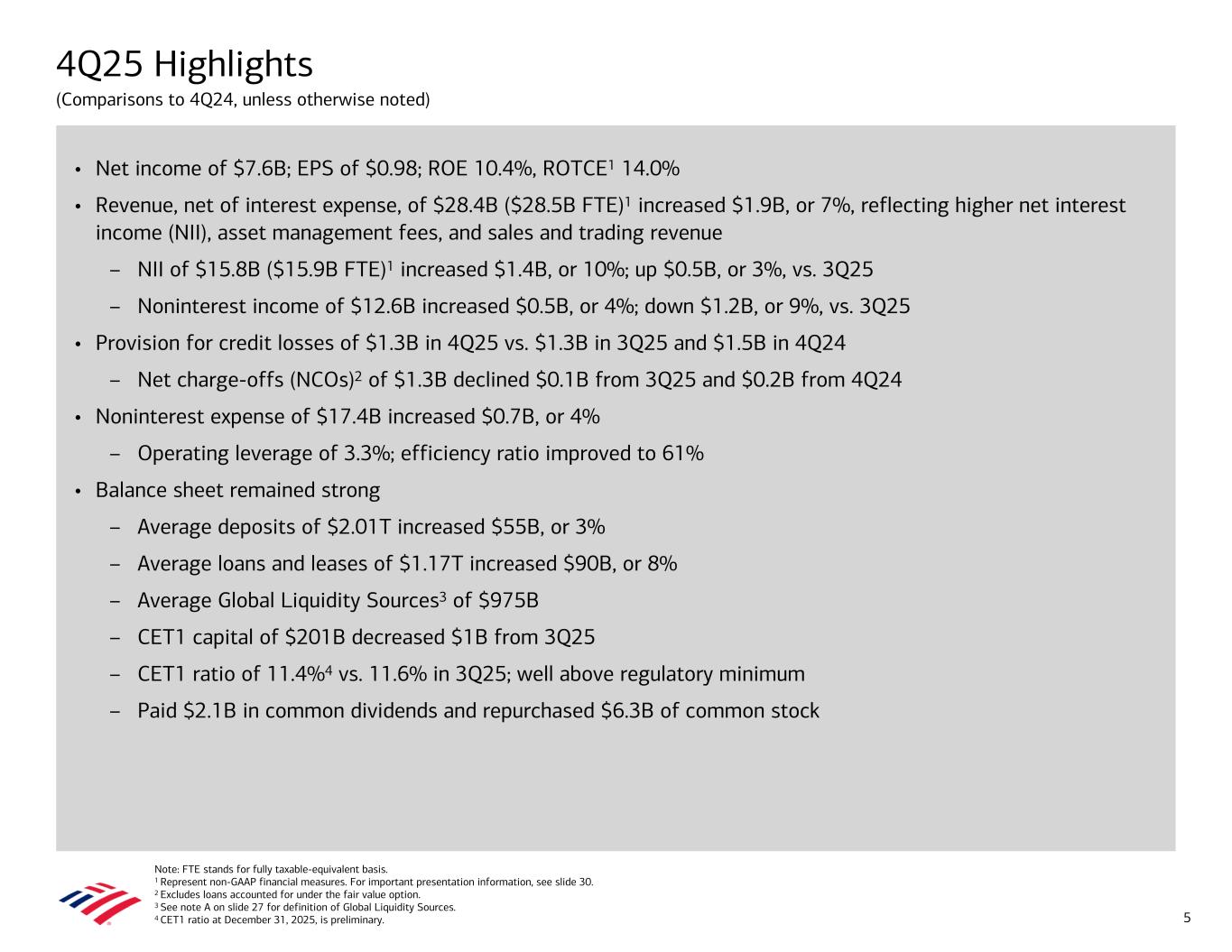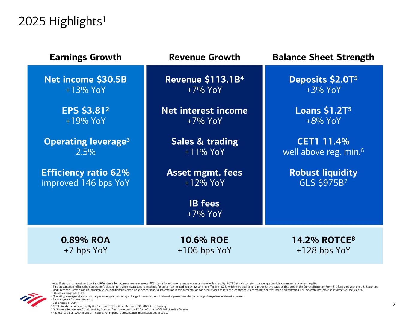 Note: IB stands for investment banking. ROA stands for return on average assets. ROE stands for return on average common shareholders’ equity. ROTCE stands for return on average tangible common shareholders’ equity. 1 This presentation reflects the Corporation’s election to change its accounting methods for certain tax-related equity investments effective 4Q25, which were applied on a retrospective basis as disclosed in the Current Report on Form 8-K furnished with the U.S. Securities and Exchange Commission on January 6, 2026. Additionally, certain prior-period financial information in this presentation has been revised to reflect such changes to conform to current-period presentation. For important presentation information, see slide 30. 2 Diluted earnings per share. 3 Operating leverage calculated as the year-over-year percentage change in revenue, net of interest expense, less the percentage change in noninterest expense. 4 Revenue, net of interest expense. 5 End of period (EOP). 6 CET1 stands for common equity tier 1 capital. CET1 ratio at December 31, 2025, is preliminary. 7 GLS stands for average Global Liquidity Sources. See note A on slide 27 for definition of Global Liquidity Sources. 8 Represents a non-GAAP financial measure. For important presentation information, see slide 30. 2025 Highlights1 2 Earnings Growth Revenue Growth Balance Sheet Strength Net income $30.5B +13% YoY EPS $3.812 +19% YoY Operating leverage3 2.5% Efficiency ratio 62% improved 146 bps YoY Revenue $113.1B4 +7% YoY Net interest income +7% YoY Sales & trading +11% YoY Asset mgmt. fees +12% YoY IB fees +7% YoY Deposits $2.0T5 +3% YoY Loans $1.2T5 +8% YoY CET1 11.4% well above reg. min.6 Robust liquidity GLS $975B7 0.89% ROA +7 bps YoY 10.6% ROE +106 bps YoY 14.2% ROTCE8 +128 bps YoY