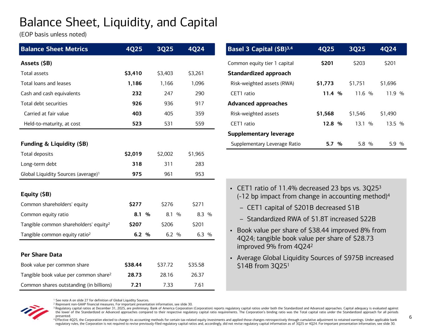 Balance Sheet Metrics 4Q25 3Q25 4Q24 Basel 3 Capital ($B)3,4 4Q25 3Q25 4Q24 Assets ($B) Common equity tier 1 capital $201 $203 $201 Total assets $3,410 $3,403 $3,261 Standardized approach Total loans and leases 1,186 1,166 1,096 Risk-weighted assets (RWA) $1,773 $1,751 $1,696 Cash and cash equivalents 232 247 290 CET1 ratio 11.4 % 11.6 % 11.9 % Total debt securities 926 936 917 Advanced approaches Carried at fair value 403 405 359 Risk-weighted assets $1,568 $1,546 $1,490 Held-to-maturity, at cost 523 531 559 CET1 ratio 12.8 % 13.1 % 13.5 % Supplementary leverage Funding & Liquidity ($B) Supplementary Leverage Ratio 5.7 % 5.8 % 5.9 % Total deposits $2,019 $2,002 $1,965 Long-term debt 318 311 283 Global Liquidity Sources (average)1 975 961 953 Equity ($B) Common shareholders' equity $277 $276 $271 Common equity ratio 8.1 % 8.1 % 8.3 % Tangible common shareholders' equity2 $207 $206 $201 Tangible common equity ratio2 6.2 % 6.2 % 6.3 % Per Share Data Book value per common share $38.44 $37.72 $35.58 Tangible book value per common share2 28.73 28.16 26.37 Common shares outstanding (in billions) 7.21 7.33 7.61 Balance Sheet, Liquidity, and Capital (EOP basis unless noted) 6 • CET1 ratio of 11.4% decreased 23 bps vs. 3Q253 (-12 bp impact from change in accounting method)4 – CET1 capital of $201B decreased $1B – Standardized RWA of $1.8T increased $22B • Book value per share of $38.44 improved 8% from 4Q24; tangible book value per share of $28.73 improved 9% from 4Q242 • Average Global Liquidity Sources of $975B increased $14B from 3Q251 1 See note A on slide 27 for definition of Global Liquidity Sources. 2 Represent non-GAAP financial measures. For important presentation information, see slide 30. 3 Regulatory capital ratios at December 31, 2025, are preliminary. Bank of America Corporation (Corporation) reports regulatory capital ratios under both the Standardized and Advanced approaches. Capital adequacy is evaluated against the lower of the Standardized or Advanced approaches compared to their respective regulatory capital ratio requirements. The Corporation’s binding ratio was the Total capital ratio under the Standardized approach for all periods presented. 4 Effective 4Q25, the Corporation elected to change its accounting methods for certain tax-related equity investments and applied those changes retrospectively through cumulative adjustment to retained earnings. Under applicable bank regulatory rules, the Corporation is not required to revise previously-filed regulatory capital ratios and, accordingly, did not revise regulatory capital information as of 3Q25 or 4Q24. For important presentation information, see slide 30.