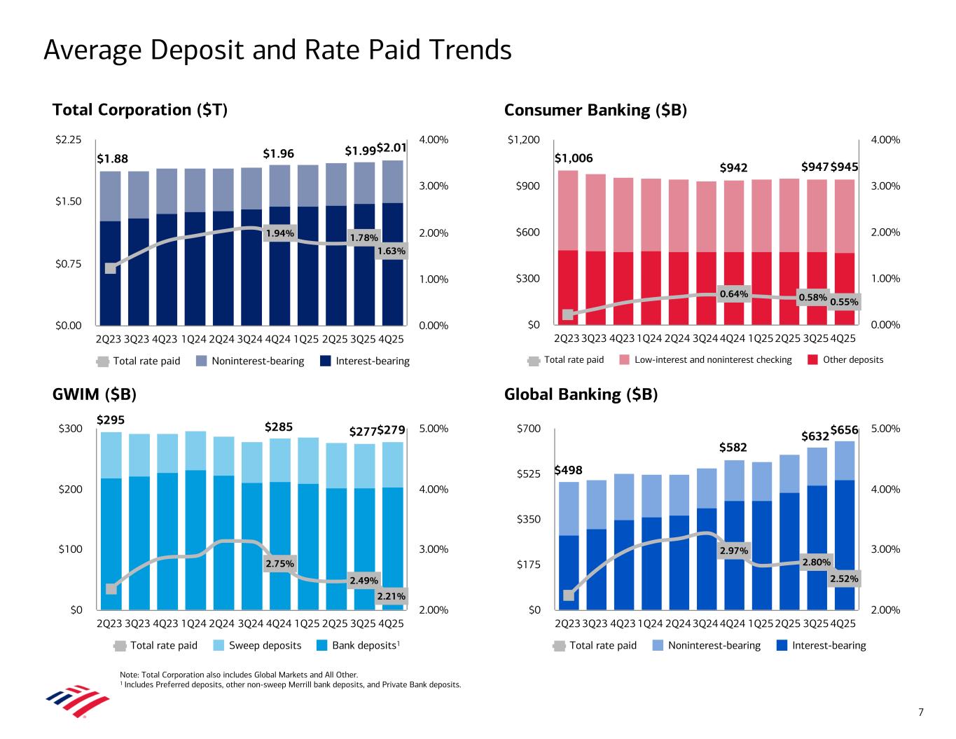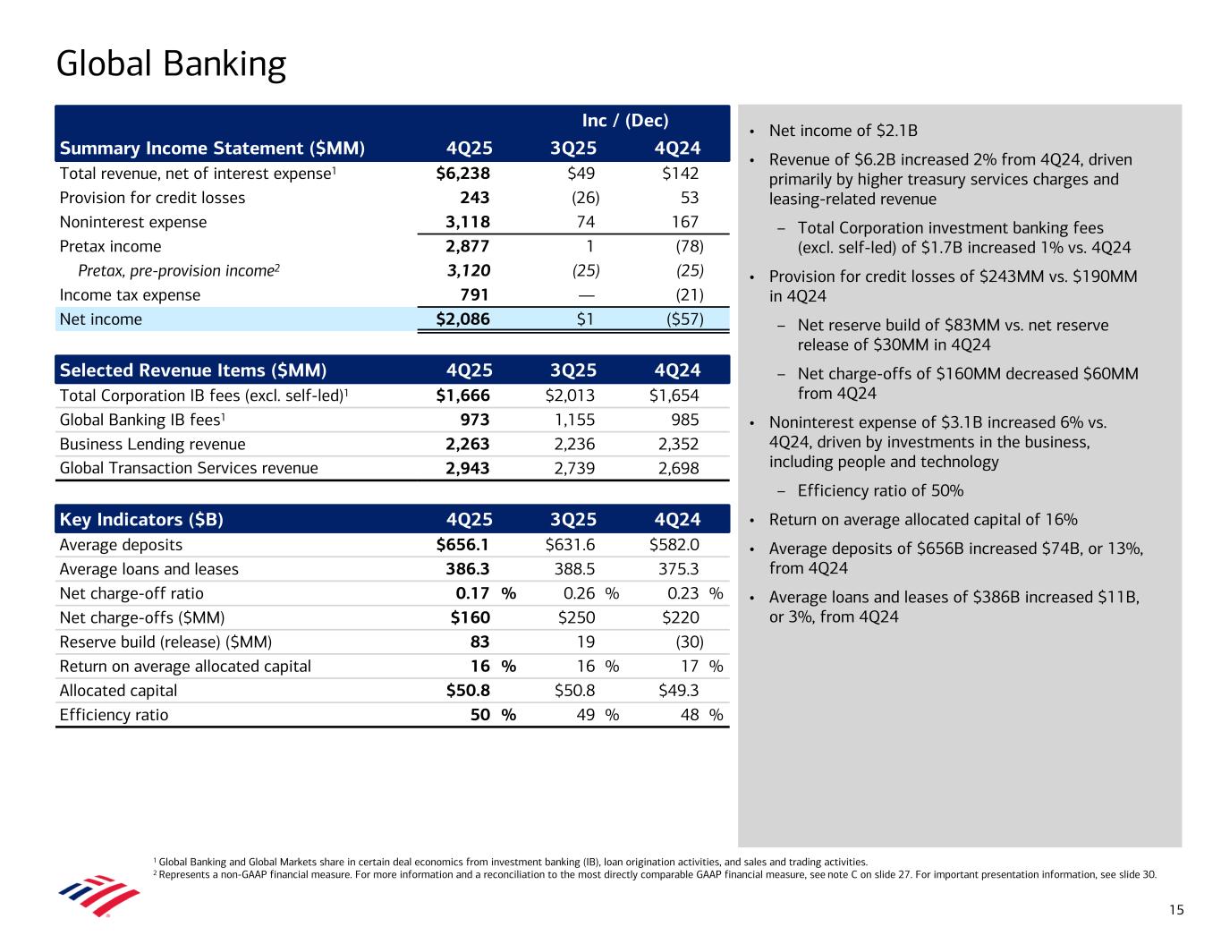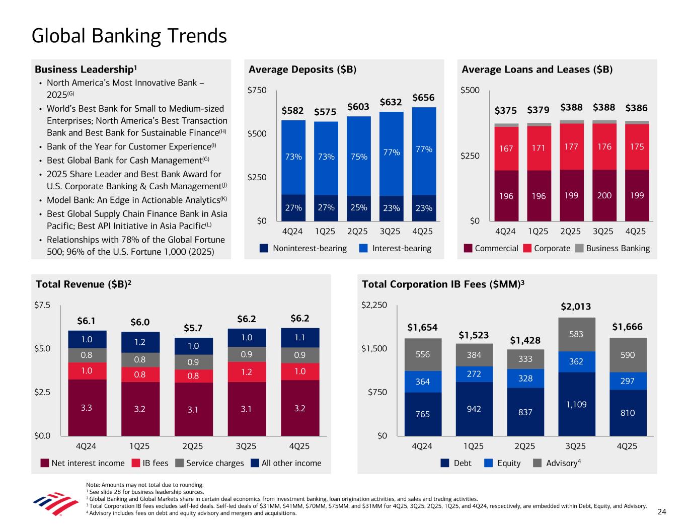 Global Banking Trends Note: Amounts may not total due to rounding. 1 See slide 28 for business leadership sources. 2 Global Banking and Global Markets share in certain deal economics from investment banking, loan origination activities, and sales and trading activities. 3 Total Corporation IB fees excludes self-led deals. Self-led deals of $31MM, $41MM, $70MM, $75MM, and $31MM for 4Q25, 3Q25, 2Q25, 1Q25, and 4Q24, respectively, are embedded within Debt, Equity, and Advisory. 4 Advisory includes fees on debt and equity advisory and mergers and acquisitions. Average Deposits ($B)Business Leadership1 • North America’s Most Innovative Bank – 2025(G) • World’s Best Bank for Small to Medium-sized Enterprises; North America’s Best Transaction Bank and Best Bank for Sustainable Finance(H) • Bank of the Year for Customer Experience(I) • Best Global Bank for Cash Management(G) • 2025 Share Leader and Best Bank Award for U.S. Corporate Banking & Cash Management(J) • Model Bank: An Edge in Actionable Analytics(K) • Best Global Supply Chain Finance Bank in Asia Pacific; Best API Initiative in Asia Pacific(L) • Relationships with 78% of the Global Fortune 500; 96% of the U.S. Fortune 1,000 (2025) Average Loans and Leases ($B) Total Revenue ($B)2 Total Corporation IB Fees ($MM)3 $6.1 $6.0 $5.7 $6.2 $6.2 3.3 3.2 3.1 3.1 3.2 1.0 0.8 0.8 1.2 1.0 0.8 0.8 0.9 0.9 0.9 1.0 1.2 1.0 1.0 1.1 Net interest income IB fees Service charges All other income 4Q24 1Q25 2Q25 3Q25 4Q25 $0.0 $2.5 $5.0 $7.5 765 942 837 1,109 810 364 272 328 362 297 556 384 333 583 590 $1,654 $1,523 $1,428 $2,013 $1,666 Debt Equity Advisory 4Q24 1Q25 2Q25 3Q25 4Q25 $0 $750 $1,500 $2,250 196 196 199 200 199 167 171 177 176 175 $375 $379 $388 $388 $386 Commercial Corporate Business Banking 4Q24 1Q25 2Q25 3Q25 4Q25 $0 $250 $500 4 $582 $575 $603 $632 $656 Noninterest-bearing Interest-bearing 4Q24 1Q25 2Q25 3Q25 4Q25 $0 $250 $500 $750 24 27% 27% 25% 23% 23% 73% 73% 75% 77% 77%