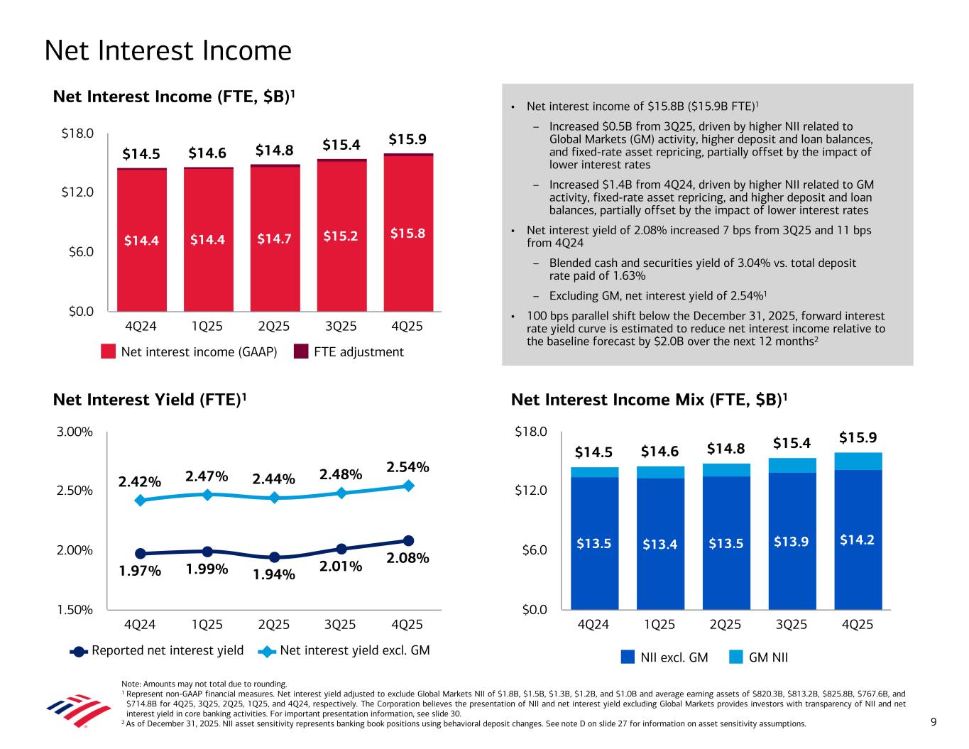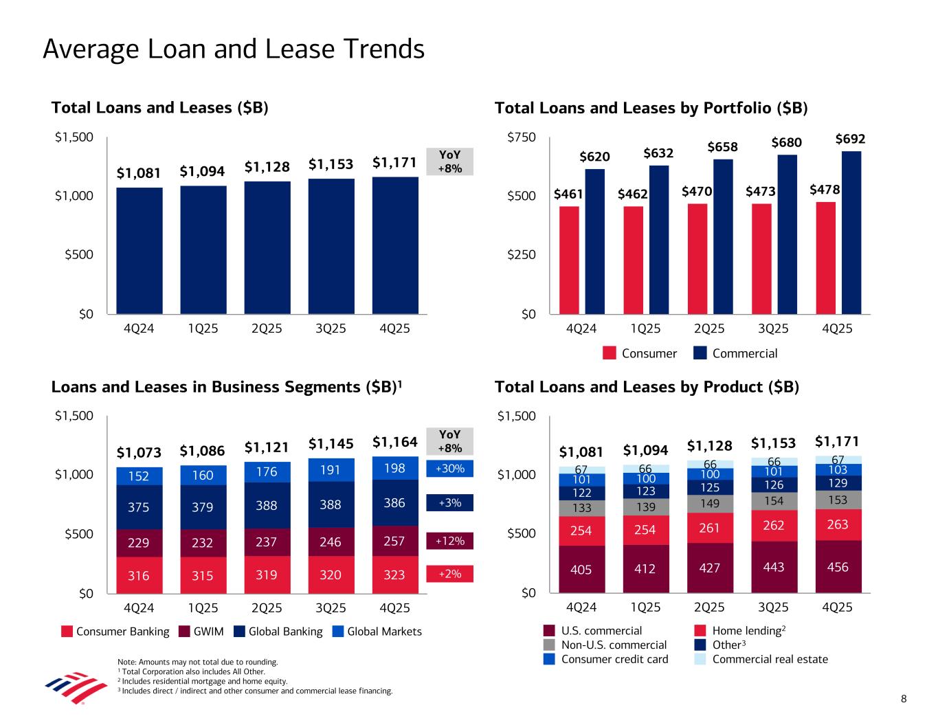 $1,073 $1,086 $1,121 $1,145 $1,164 316 315 319 320 323 229 232 237 246 257 375 379 388 388 386 152 160 176 191 198 Consumer Banking GWIM Global Banking Global Markets 4Q24 1Q25 2Q25 3Q25 4Q25 $0 $500 $1,000 $1,500 $1,081 $1,094 $1,128 $1,153 $1,171 4Q24 1Q25 2Q25 3Q25 4Q25 $0 $500 $1,000 $1,500 +2% +12% +3% +30% Average Loan and Lease Trends YoY +8% YoY +8% Note: Amounts may not total due to rounding. 1 Total Corporation also includes All Other. 2 Includes residential mortgage and home equity. 3 Includes direct / indirect and other consumer and commercial lease financing. Total Loans and Leases by Product ($B) Loans and Leases in Business Segments ($B)1 Total Loans and Leases by Portfolio ($B)Total Loans and Leases ($B) $461 $462 $470 $473 $478 $620 $632 $658 $680 $692 Consumer Commercial 4Q24 1Q25 2Q25 3Q25 4Q25 $0 $250 $500 $750 8 $1,081 $1,094 $1,128 $1,153 $1,171 405 412 427 443 456 254 254 261 262 263 133 139 149 154 153 122 123 125 126 129101 100 100 101 10367 66 66 66 67 U.S. commercial Home lending Non-U.S. commercial Other Consumer credit card Commercial real estate 4Q24 1Q25 2Q25 3Q25 4Q25 $0 $500 $1,000 $1,500 3 2