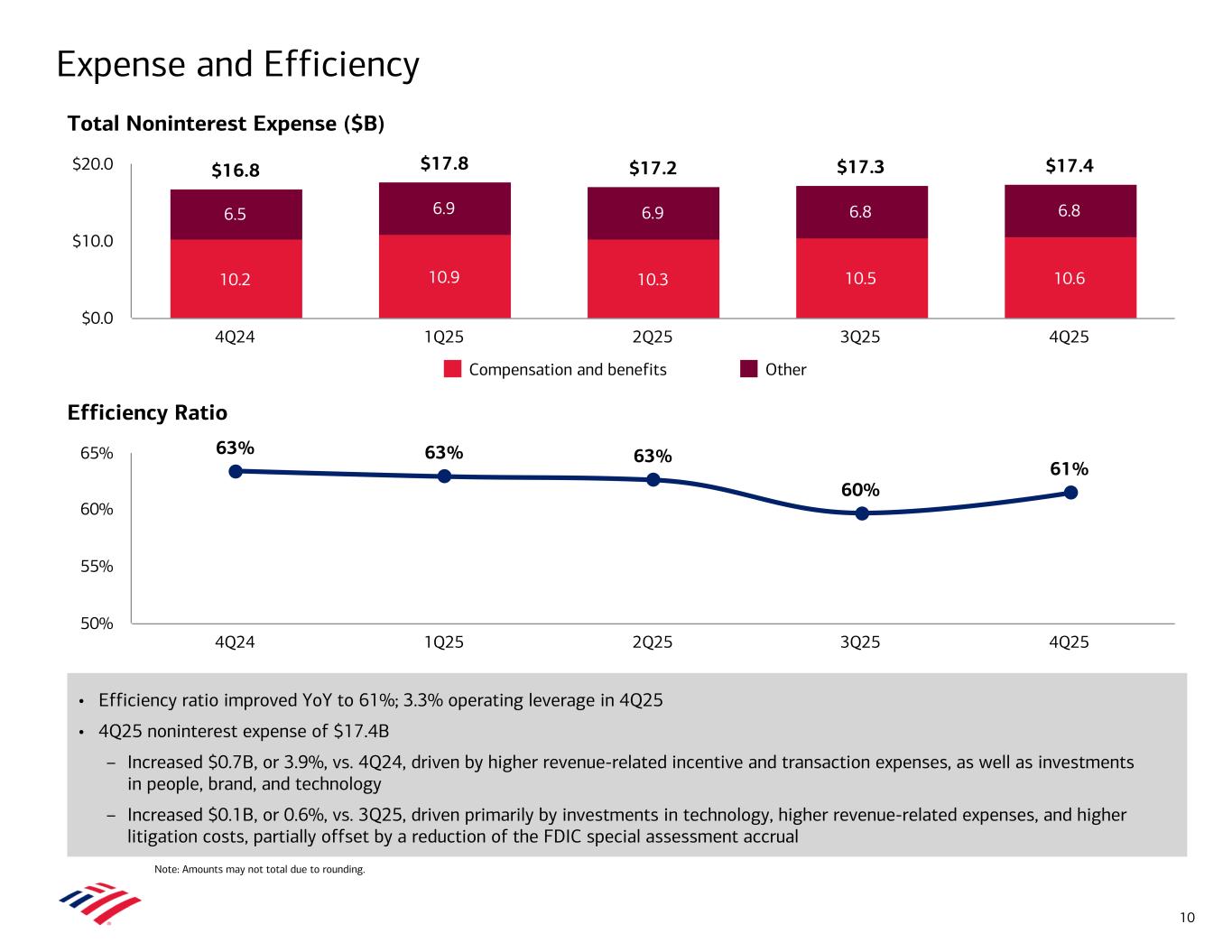 • Net interest income of $15.8B ($15.9B FTE)1 – Increased $0.5B from 3Q25, driven by higher NII related to Global Markets (GM) activity, higher deposit and loan balances, and fixed-rate asset repricing, partially offset by the impact of lower interest rates – Increased $1.4B from 4Q24, driven by higher NII related to GM activity, fixed-rate asset repricing, and higher deposit and loan balances, partially offset by the impact of lower interest rates • Net interest yield of 2.08% increased 7 bps from 3Q25 and 11 bps from 4Q24 – Blended cash and securities yield of 3.04% vs. total deposit rate paid of 1.63% – Excluding GM, net interest yield of 2.54%1 • 100 bps parallel shift below the December 31, 2025, forward interest rate yield curve is estimated to reduce net interest income relative to the baseline forecast by $2.0B over the next 12 months2 Net Interest Income (FTE, $B)1 Net Interest Income Note: Amounts may not total due to rounding. 1 Represent non-GAAP financial measures. Net interest yield adjusted to exclude Global Markets NII of $1.8B, $1.5B, $1.3B, $1.2B, and $1.0B and average earning assets of $820.3B, $813.2B, $825.8B, $767.6B, and $714.8B for 4Q25, 3Q25, 2Q25, 1Q25, and 4Q24, respectively. The Corporation believes the presentation of NII and net interest yield excluding Global Markets provides investors with transparency of NII and net interest yield in core banking activities. For important presentation information, see slide 30. 2 As of December 31, 2025. NII asset sensitivity represents banking book positions using behavioral deposit changes. See note D on slide 27 for information on asset sensitivity assumptions. Net Interest Yield (FTE)1 1.97% 1.99% 1.94% 2.01% 2.08% 2.42% 2.47% 2.44% 2.48% 2.54% Reported net interest yield Net interest yield excl. GM 4Q24 1Q25 2Q25 3Q25 4Q25 1.50% 2.00% 2.50% 3.00% $14.5 $14.6 $14.8 $15.4 $15.9 $14.4 $14.4 $14.7 $15.2 $15.8 Net interest income (GAAP) FTE adjustment 4Q24 1Q25 2Q25 3Q25 4Q25 $0.0 $6.0 $12.0 $18.0 9 Net Interest Income Mix (FTE, $B)1 $14.5 $14.6 $14.8 $15.4 $15.9 $13.5 $13.4 $13.5 $13.9 $14.2 NII excl. GM GM NII 4Q24 1Q25 2Q25 3Q25 4Q25 $0.0 $6.0 $12.0 $18.0