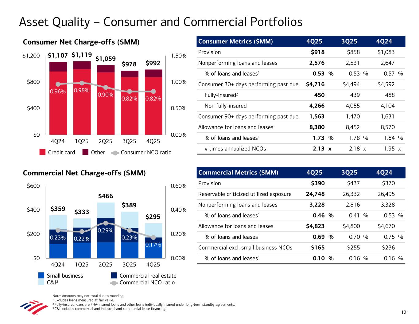 Asset Quality 1 Excludes loans measured at fair value. 2 Allowance for loan and lease losses ratio is calculated as allowance for loan and lease losses divided by loans and leases outstanding at the end of the period. Provision for Credit Losses ($MM) Net Charge-offs ($MM)1 $1,452 $1,480 $1,592 $1,295 $1,308 4Q24 1Q25 2Q25 3Q25 4Q25 $0 $500 $1,000 $1,500 $2,000 $1,466 $1,452 $1,525 $1,367 $1,287 0.54% 0.54% 0.55% 0.47% 0.44% Net charge-offs Net charge-off ratio 4Q24 1Q25 2Q25 3Q25 4Q25 $0 $500 $1,000 $1,500 $2,000 0.00% 0.25% 0.50% 0.75% 1.00% 11 • Total net charge-offs1 of $1.3B decreased $80MM from 3Q25 – Consumer net charge-offs of $1.0B increased $14MM ▪ Credit card charge-off rate of 3.40% in 4Q25 vs. 3.46% in 3Q25 – Commercial net charge-offs of $295MM decreased $94MM, driven primarily by lower commercial real estate office losses – Net charge-off ratio of 0.44% vs. 0.47% in 3Q25 • Provision for credit losses of $1.3B was flat to 3Q25 – Net reserve build of $21MM in 4Q25 vs. net reserve release of $72MM in 3Q25 • Allowance for loan and lease losses of $13.2B represented 1.12% of total loans and leases1,2 – Total allowance of $14.4B included $1.2B for unfunded commitments • Nonperforming loans of $5.8B increased $0.5B from 3Q25 and decreased $0.2B from 4Q24 • Commercial reservable criticized utilized exposure of $24.7B decreased $1.6B from 3Q25 and $1.7B from 4Q24