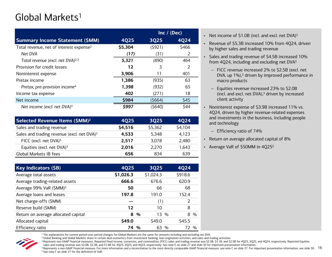 Global Banking 1 Global Banking and Global Markets share in certain deal economics from investment banking (IB), loan origination activities, and sales and trading activities. 2 Represents a non-GAAP financial measure. For more information and a reconciliation to the most directly comparable GAAP financial measure, see note C on slide 27. For important presentation information, see slide 30. Inc / (Dec) Summary Income Statement ($MM) 4Q25 3Q25 4Q24 Total revenue, net of interest expense1 $6,238 $49 $142 Provision for credit losses 243 (26) 53 Noninterest expense 3,118 74 167 Pretax income 2,877 1 (78) Pretax, pre-provision income2 3,120 (25) (25) Income tax expense 791 — (21) Net income $2,086 $1 ($57) Selected Revenue Items ($MM) 4Q25 3Q25 4Q24 Total Corporation IB fees (excl. self-led)1 $1,666 $2,013 $1,654 Global Banking IB fees1 973 1,155 985 Business Lending revenue 2,263 2,236 2,352 Global Transaction Services revenue 2,943 2,739 2,698 Key Indicators ($B) 4Q25 3Q25 4Q24 Average deposits $656.1 $631.6 $582.0 Average loans and leases 386.3 388.5 375.3 Net charge-off ratio 0.17 % 0.26 % 0.23 % Net charge-offs ($MM) $160 $250 $220 Reserve build (release) ($MM) 83 19 (30) Return on average allocated capital 16 % 16 % 17 % Allocated capital $50.8 $50.8 $49.3 Efficiency ratio 50 % 49 % 48 % 15 • Net income of $2.1B • Revenue of $6.2B increased 2% from 4Q24, driven primarily by higher treasury services charges and leasing-related revenue – Total Corporation investment banking fees (excl. self-led) of $1.7B increased 1% vs. 4Q24 • Provision for credit losses of $243MM vs. $190MM in 4Q24 – Net reserve build of $83MM vs. net reserve release of $30MM in 4Q24 – Net charge-offs of $160MM decreased $60MM from 4Q24 • Noninterest expense of $3.1B increased 6% vs. 4Q24, driven by investments in the business, including people and technology – Efficiency ratio of 50% • Return on average allocated capital of 16% • Average deposits of $656B increased $74B, or 13%, from 4Q24 • Average loans and leases of $386B increased $11B, or 3%, from 4Q24