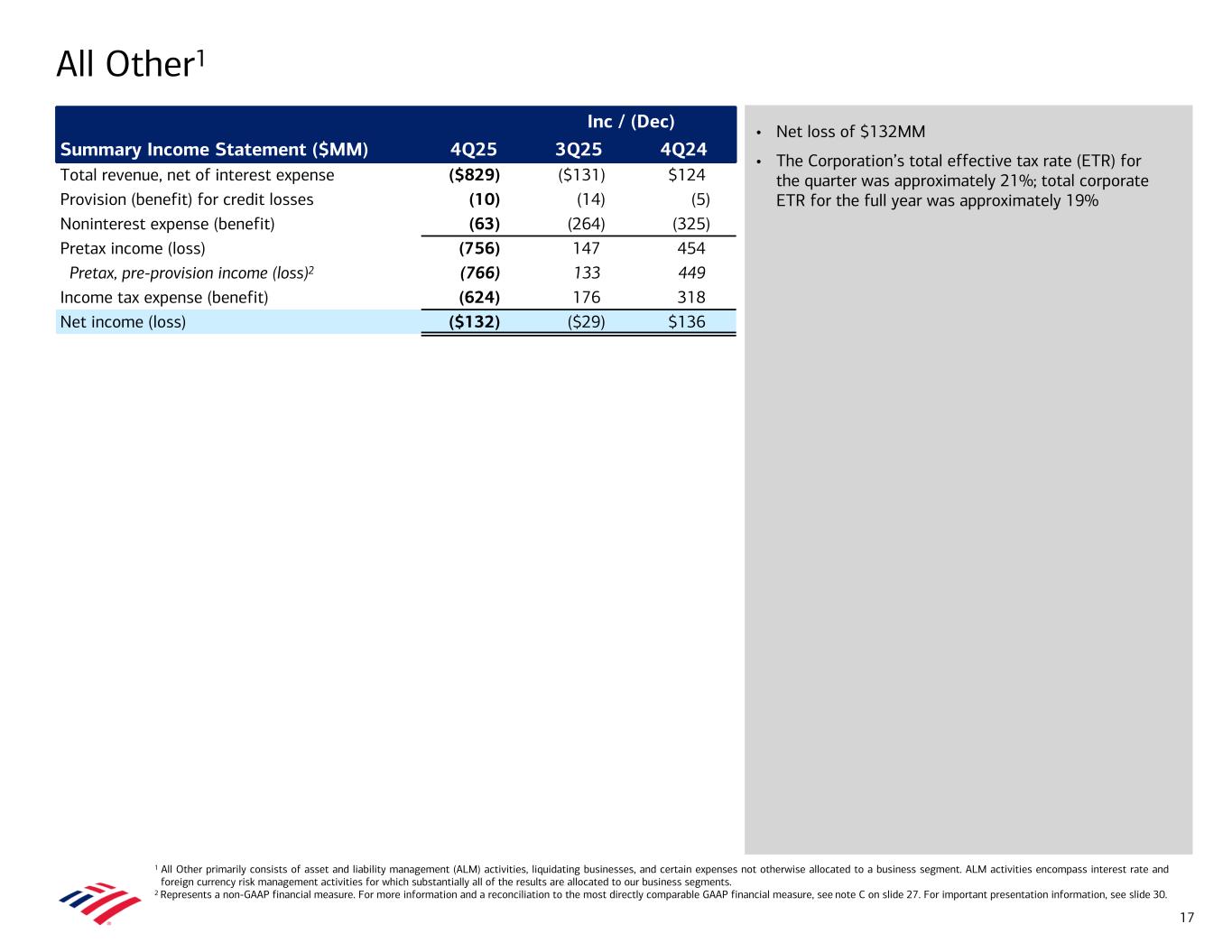 • Net loss of $132MM • The Corporation’s total effective tax rate (ETR) for the quarter was approximately 21%; total corporate ETR for the full year was approximately 19% All Other1 1 All Other primarily consists of asset and liability management (ALM) activities, liquidating businesses, and certain expenses not otherwise allocated to a business segment. ALM activities encompass interest rate and foreign currency risk management activities for which substantially all of the results are allocated to our business segments. 2 Represents a non-GAAP financial measure. For more information and a reconciliation to the most directly comparable GAAP financial measure, see note C on slide 27. For important presentation information, see slide 30. Inc / (Dec) Summary Income Statement ($MM) 4Q25 3Q25 4Q24 Total revenue, net of interest expense ($829) ($131) $124 Provision (benefit) for credit losses (10) (14) (5) Noninterest expense (benefit) (63) (264) (325) Pretax income (loss) (756) 147 454 Pretax, pre-provision income (loss)2 (766) 133 449 Income tax expense (benefit) (624) 176 318 Net income (loss) ($132) ($29) $136 17