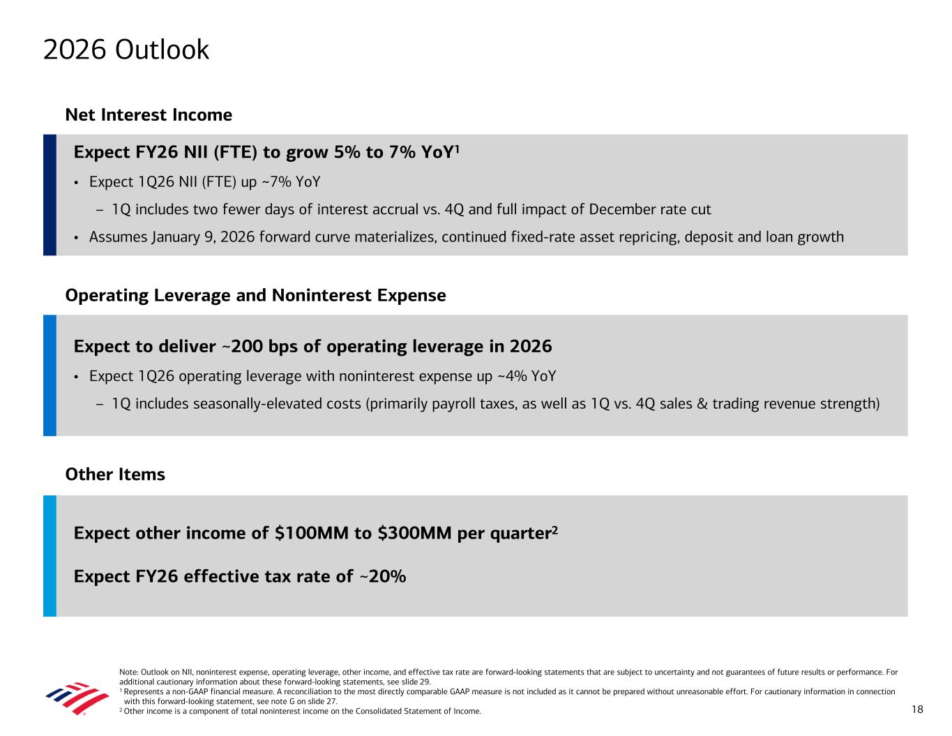 Forward-Looking Statements Bank of America Corporation (the Corporation) and its management may make certain statements that constitute “forward-looking statements” within the meaning of the Private Securities Litigation Reform Act of 1995. These statements can be identified by the fact that they do not relate strictly to historical or current facts. Forward-looking statements often use words such as “anticipates,” “targets,” “expects,” “hopes,” “estimates,” “intends,” “plans,” “goals,” “outlook,” “believes,” “continue” and other similar expressions or future or conditional verbs such as “will,” “may,” “might,” “should,” “would” and “could.” Forward-looking statements represent the Corporation’s current expectations, plans or forecasts of its future results (such as its 2026 outlook and related assumptions, including with regard to the interest forward curve, asset repricing, deposit and loan growth and other matters), including revenues, liquidity, net interest income, other income, provision for credit losses, expenses, operating leverage, effective tax rate, efficiency ratio, capital measures, deposits and assets, as well as strategy, future business and economic conditions more generally, and other future matters. These statements are not guarantees of future results or performance and involve certain known and unknown risks, uncertainties and assumptions that are difficult to predict and are often beyond the Corporation’s control. Actual outcomes and results may differ materially from those expressed in, or implied by, any of these forward-looking statements. You should not place undue reliance on any forward-looking statement and should consider the following uncertainties and risks, as well as the risks and uncertainties more fully discussed under Item 1A. Risk Factors of the Corporation’s 2024 Annual Report on Form 10-K and in any of the Corporation’s subsequent U.S. Securities and Exchange Commission (SEC) filings: the Corporation’s potential judgments, orders, settlements, penalties, fines and reputational damage, which are inherently difficult to predict, resulting from pending, threatened or future litigation and regulatory inquiries, demands, requests, investigations, proceedings and enforcement actions, which the Corporation is subject to in the ordinary course of business, including matters related to our processing of unemployment benefits for California and certain other states, the features of our automatic credit card payment service, the adequacy of the Corporation’s anti- money laundering and economic sanctions programs and the processing of electronic payments, including through the Zelle network, and related fraud, which are in various stages; in connection with ongoing litigation, the impact of certain changes to Visa’s and Mastercard’s respective card payment network rules and reductions in interchange fees for U.S.-based merchants; the possibility that the Corporation's future liabilities may be in excess of its recorded liability and estimated range of possible loss for litigation, and regulatory and government actions; the Corporation’s ability to resolve representations and warranties repurchase and related claims; the impact of U.S. and global interest rates (including the potential for ongoing fluctuations in interest rates), inflation, currency exchange rates, economic conditions, trade policies and tensions, including changes in, or the imposition of, tariffs and / or trade barriers and the economic impacts, volatility and uncertainty resulting therefrom, which may have varying effects across industries and geographies, and geopolitical instability; the risks related to the discontinuation of reference rates, including increased expenses and litigation and the effectiveness of hedging strategies; uncertainties about the financial stability and growth rates of non-U.S. jurisdictions, the risk that those jurisdictions may face difficulties servicing their sovereign debt, and related stresses on financial markets, currencies and trade, and the Corporation’s exposures to such risks, including direct, indirect and operational; the impact of the interest rate, inflationary, macroeconomic, banking and regulatory environment on the Corporation’s assets, business, financial condition and results of operations; the impact of adverse developments affecting the U.S. or global banking industry, including bank failures and liquidity concerns, resulting in worsening economic and market volatility, and regulatory responses thereto; the possibility that future credit losses may be higher than currently expected due to changes in economic assumptions, which may include unemployment rates, real estate prices, gross domestic product levels and corporate bond spreads, customer behavior, adverse developments with respect to U.S. or global economic conditions and other uncertainties, including the impact of trade policies, supply chain disruptions, inflationary pressures and labor shortages on economic conditions and our business; potential losses related to the Corporation’s concentration of credit risk; the Corporation's ability to achieve its expense targets (including noninterest expense) and expectations regarding revenue, net interest income, operating leverage, other income, provision for credit losses, net charge-offs, effective tax rate, loan growth or other projections; variances to the underlying assumptions and judgments used in estimating banking book net interest income sensitivity; adverse changes to the Corporation’s credit ratings from the major credit rating agencies; an inability to access capital markets or maintain deposits or borrowing costs; estimates of the fair value and other accounting values, subject to impairment assessments, of certain of the Corporation’s assets and liabilities; the estimated or actual impact of changes in accounting standards or as