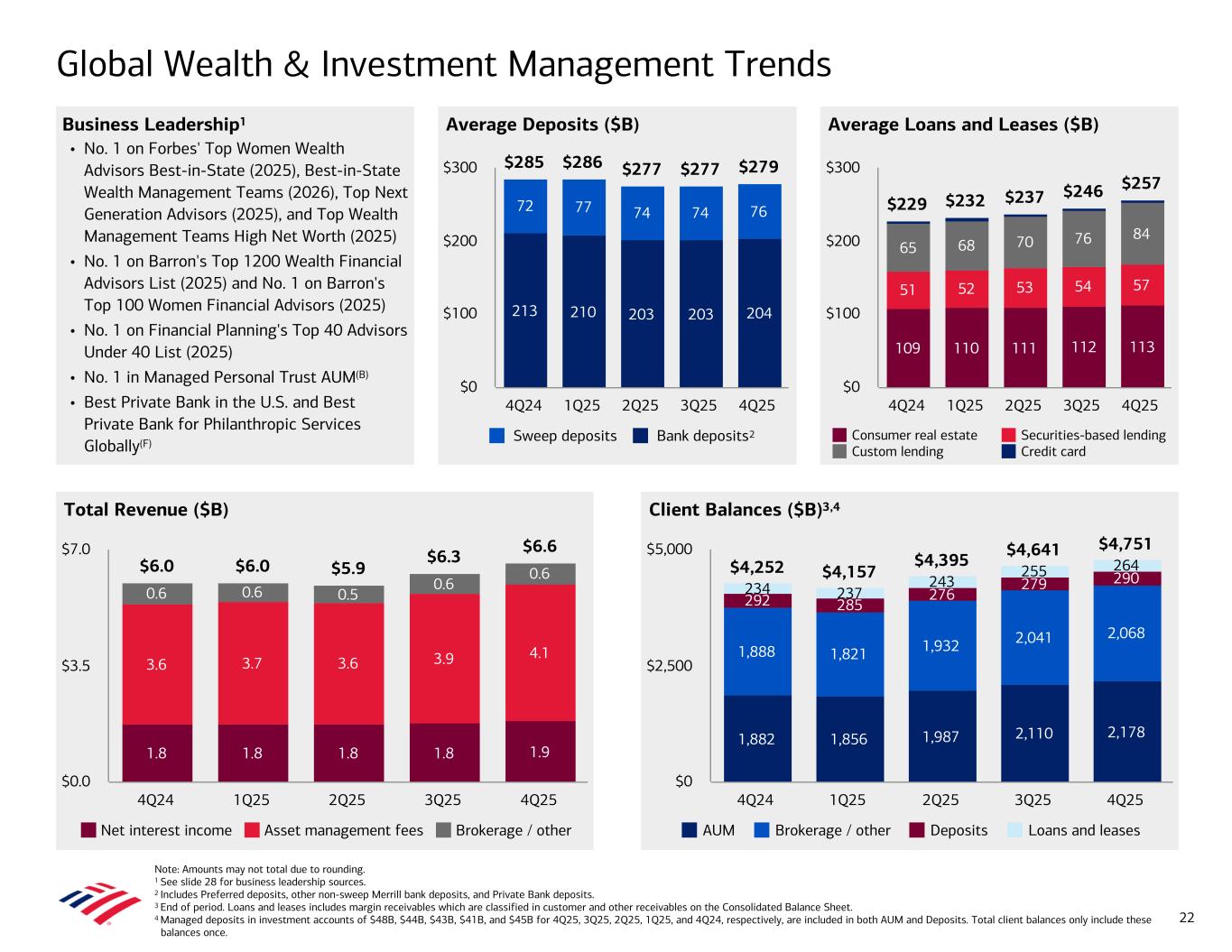 Note: Amounts may not total due to rounding. 1 See slide 28 for business leadership sources. 2 Includes Preferred deposits, other non-sweep Merrill bank deposits, and Private Bank deposits. 3 End of period. Loans and leases includes margin receivables which are classified in customer and other receivables on the Consolidated Balance Sheet. 4 Managed deposits in investment accounts of $48B, $44B, $43B, $41B, and $45B for 4Q25, 3Q25, 2Q25, 1Q25, and 4Q24, respectively, are included in both AUM and Deposits. Total client balances only include these balances once. Average Deposits ($B) Global Wealth & Investment Management Trends Business Leadership1 • No. 1 on Forbes' Top Women Wealth Advisors Best-in-State (2025), Best-in-State Wealth Management Teams (2026), Top Next Generation Advisors (2025), and Top Wealth Management Teams High Net Worth (2025) • No. 1 on Barron's Top 1200 Wealth Financial Advisors List (2025) and No. 1 on Barron's Top 100 Women Financial Advisors (2025) • No. 1 on Financial Planning's Top 40 Advisors Under 40 List (2025) • No. 1 in Managed Personal Trust AUM(B) • Best Private Bank in the U.S. and Best Private Bank for Philanthropic Services Globally(F) Average Loans and Leases ($B) Total Revenue ($B) Client Balances ($B)3,4 $6.0 $6.0 $5.9 $6.3 $6.6 1.8 1.8 1.8 1.8 1.9 3.6 3.7 3.6 3.9 4.1 0.6 0.6 0.5 0.6 0.6 Net interest income Asset management fees Brokerage / other 4Q24 1Q25 2Q25 3Q25 4Q25 $0.0 $3.5 $7.0 1,882 1,856 1,987 2,110 2,178 1,888 1,821 1,932 2,041 2,068 292 285 276 279 290 234 237 243 255 264$4,252 $4,157 $4,395 $4,641 $4,751 AUM Brokerage / other Deposits Loans and leases 4Q24 1Q25 2Q25 3Q25 4Q25 $0 $2,500 $5,000 $229 $232 $237 $246 $257 109 110 111 112 113 51 52 53 54 57 65 68 70 76 84 Consumer real estate Securities-based lending Custom lending Credit card 4Q24 1Q25 2Q25 3Q25 4Q25 $0 $100 $200 $300$285 $286 $277 $277 $279 213 210 203 203 204 72 77 74 74 76 Sweep deposits Bank deposits 4Q24 1Q25 2Q25 3Q25 4Q25 $0 $100 $200 $300 22 2