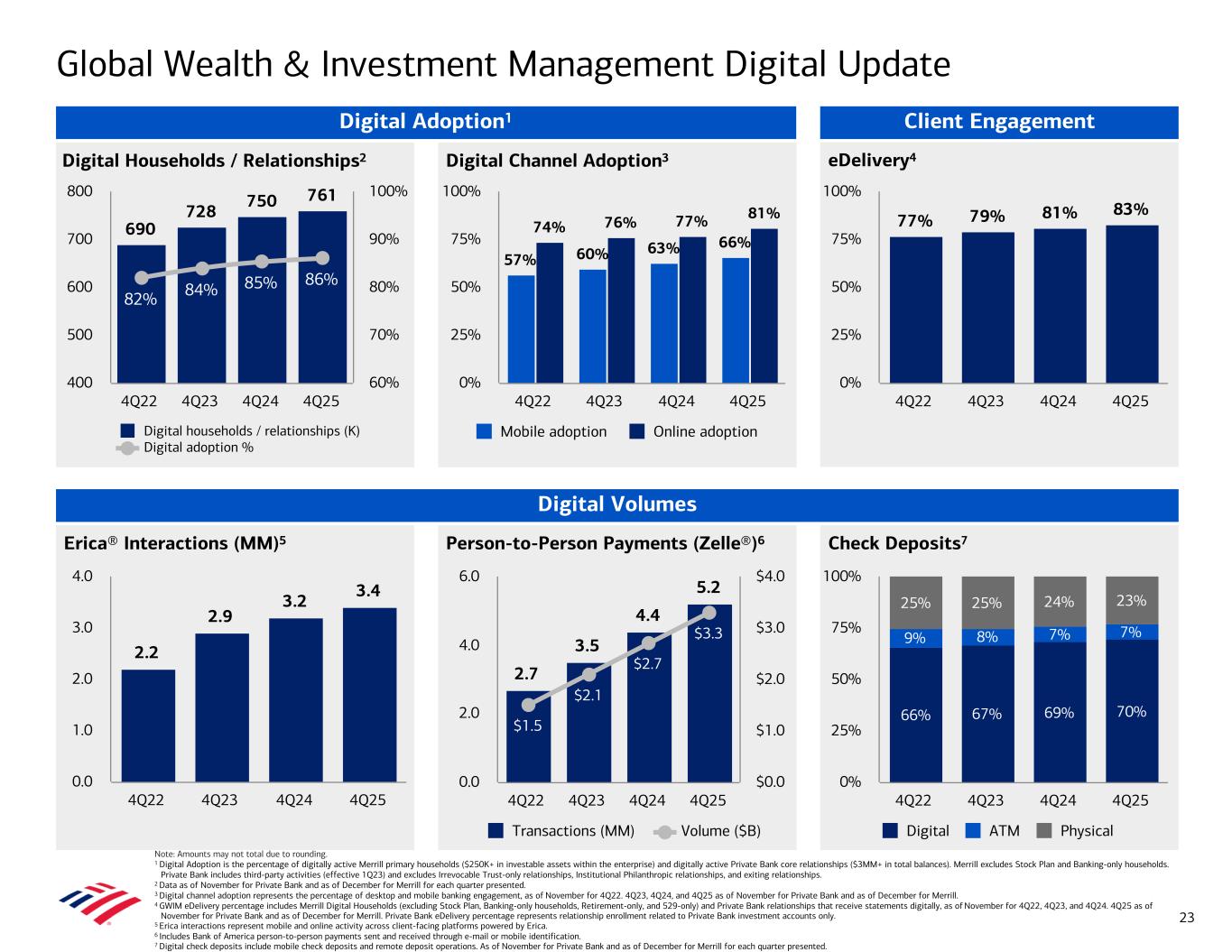 Erica® Interactions (MM)5 2.2 2.9 3.2 3.4 4Q22 4Q23 4Q24 4Q25 0.0 1.0 2.0 3.0 4.0 Person-to-Person Payments (Zelle®)6 Check Deposits7 eDelivery4Digital Households / Relationships2 Digital Channel Adoption3 77% 79% 81% 83% 4Q22 4Q23 4Q24 4Q25 0% 25% 50% 75% 100% 57% 60% 63% 66% 74% 76% 77% 81% Mobile adoption Online adoption 4Q22 4Q23 4Q24 4Q25 0% 25% 50% 75% 100% 690 728 750 761 82% 84% 85% 86% Digital households / relationships (K) Digital adoption % 4Q22 4Q23 4Q24 4Q25 400 500 600 700 800 60% 70% 80% 90% 100% Client Engagement Digital Volumes Global Wealth & Investment Management Digital Update 23 Digital Adoption1 2.7 3.5 4.4 5.2 $1.5 $2.1 $2.7 $3.3 Transactions (MM) Volume ($B) 4Q22 4Q23 4Q24 4Q25 0.0 2.0 4.0 6.0 $0.0 $1.0 $2.0 $3.0 $4.0 66% 67% 69% 70% 9% 8% 7% 7% 25% 25% 24% 23% Digital ATM Physical 4Q22 4Q23 4Q24 4Q25 0% 25% 50% 75% 100% Note: Amounts may not total due to rounding. 1 Digital Adoption is the percentage of digitally active Merrill primary households ($250K+ in investable assets within the enterprise) and digitally active Private Bank core relationships ($3MM+ in total balances). Merrill excludes Stock Plan and Banking-only households. Private Bank includes third-party activities (effective 1Q23) and excludes Irrevocable Trust-only relationships, Institutional Philanthropic relationships, and exiting relationships. 2 Data as of November for Private Bank and as of December for Merrill for each quarter presented. 3 Digital channel adoption represents the percentage of desktop and mobile banking engagement, as of November for 4Q22. 4Q23, 4Q24, and 4Q25 as of November for Private Bank and as of December for Merrill. 4 GWIM eDelivery percentage includes Merrill Digital Households (excluding Stock Plan, Banking-only households, Retirement-only, and 529-only) and Private Bank relationships that receive statements digitally, as of November for 4Q22, 4Q23, and 4Q24. 4Q25 as of November for Private Bank and as of December for Merrill. Private Bank eDelivery percentage represents relationship enrollment related to Private Bank investment accounts only. 5 Erica interactions represent mobile and online activity across client-facing platforms powered by Erica. 6 Includes Bank of America person-to-person payments sent and received through e-mail or mobile identification. 7 Digital check deposits include mobile check deposits and remote deposit operations. As of November for Private Bank and as of December for Merrill for each quarter presented.