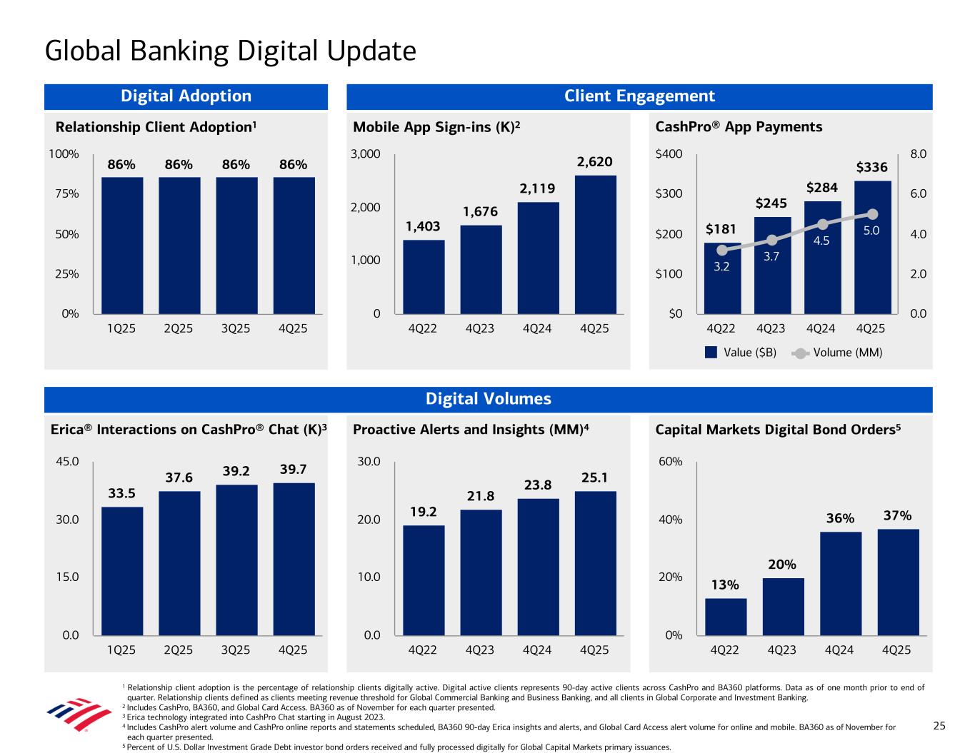 1 Relationship client adoption is the percentage of relationship clients digitally active. Digital active clients represents 90-day active clients across CashPro and BA360 platforms. Data as of one month prior to end of quarter. Relationship clients defined as clients meeting revenue threshold for Global Commercial Banking and Business Banking, and all clients in Global Corporate and Investment Banking. 2 Includes CashPro, BA360, and Global Card Access. BA360 as of November for each quarter presented. 3 Erica technology integrated into CashPro Chat starting in August 2023. 4 Includes CashPro alert volume and CashPro online reports and statements scheduled, BA360 90-day Erica insights and alerts, and Global Card Access alert volume for online and mobile. BA360 as of November for each quarter presented. 5 Percent of U.S. Dollar Investment Grade Debt investor bond orders received and fully processed digitally for Global Capital Markets primary issuances. Capital Markets Digital Bond Orders5 Erica® Interactions on CashPro® Chat (K)3 Proactive Alerts and Insights (MM)4 13% 20% 36% 37% 4Q22 4Q23 4Q24 4Q25 0% 20% 40% 60% 19.2 21.8 23.8 25.1 4Q22 4Q23 4Q24 4Q25 0.0 10.0 20.0 30.0 33.5 37.6 39.2 39.7 1Q25 2Q25 3Q25 4Q25 0.0 15.0 30.0 45.0 CashPro® App PaymentsRelationship Client Adoption1 Mobile App Sign-ins (K)2 $181 $245 $284 $336 3.2 3.7 4.5 5.0 Value ($B) Volume (MM) 4Q22 4Q23 4Q24 4Q25 $0 $100 $200 $300 $400 0.0 2.0 4.0 6.0 8.0 1,403 1,676 2,119 2,620 4Q22 4Q23 4Q24 4Q25 0 1,000 2,000 3,000 86% 86% 86% 86% 1Q25 2Q25 3Q25 4Q25 0% 25% 50% 75% 100% Client Engagement Digital Volumes Global Banking Digital Update 25 Digital Adoption