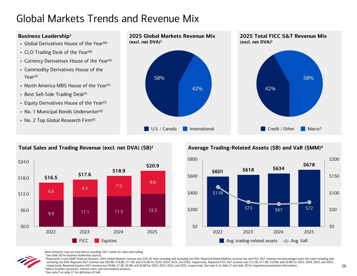 Note: Amounts may not total due to rounding. S&T stands for sales and trading. 1 See slide 28 for business leadership sources. 2 Represents a non-GAAP financial measure. 2025 Global Markets revenue was $24.1B, both including and excluding net DVA. Reported Global Markets revenue mix and FICC S&T revenue mix percentages were the same including and excluding net DVA. Reported S&T revenue was $20.9B, $18.8B, $17.4B, and $16.5B for 2025, 2024, 2023, and 2022, respectively. Reported FICC S&T revenue was $12.3B, $11.4B, $10.9B, and $9.9B for 2025, 2024, 2023, and 2022, respectively. Reported Equities S&T revenue was $8.6B, $7.4B, $6.5B, and $6.6B for 2025, 2024, 2023, and 2022, respectively. See note E on slide 27 and slide 30 for important presentation information. 3 Macro includes currencies, interest rates, and commodities products. 4 See note F on slide 27 for definition of VaR. Global Markets Trends and Revenue Mix 2025 Global Markets Revenue Mix (excl. net DVA)2 Business Leadership1 • Global Derivatives House of the Year(M) • CLO Trading Desk of the Year(M) • Currency Derivatives House of the Year(N) • Commodity Derivatives House of the Year(O) • North America MBS House of the Year(O) • Best Sell-Side Trading Desk(P) • Equity Derivatives House of the Year(O) • No. 1 Municipal Bonds Underwriter(Q) • No. 2 Top Global Research Firm(R) 2025 Total FICC S&T Revenue Mix (excl. net DVA)2 Total Sales and Trading Revenue (excl. net DVA) ($B)2 Average Trading-Related Assets ($B) and VaR ($MM)4 $16.5 $17.6 $18.9 $20.9 9.9 11.1 11.5 12.3 6.6 6.5 7.5 8.6 FICC Equities 2022 2023 2024 2025 $0.0 $6.0 $12.0 $18.0 $24.0 $601 $618 $634 $678 $118 $73 $67 $72 Avg. trading-related assets Avg. VaR 2022 2023 2024 2025 $0 $200 $400 $600 $800 $0 $50 $100 $150 $200 58% 42% U.S. / Canada International 42% 58% Credit / Other Macro 26 3