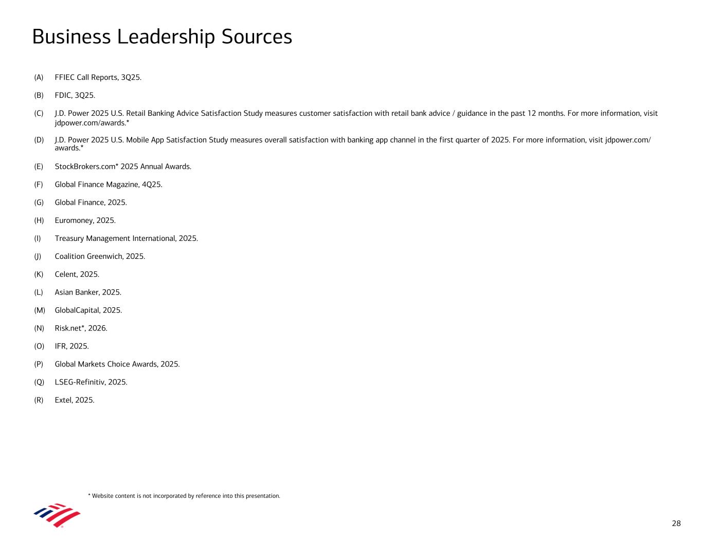 Business Leadership Sources (A) FFIEC Call Reports, 3Q25. (B) FDIC, 3Q25. (C) J.D. Power 2025 U.S. Retail Banking Advice Satisfaction Study measures customer satisfaction with retail bank advice / guidance in the past 12 months. For more information, visit jdpower.com/awards.* (D) J.D. Power 2025 U.S. Mobile App Satisfaction Study measures overall satisfaction with banking app channel in the first quarter of 2025. For more information, visit jdpower.com/ awards.* (E) StockBrokers.com* 2025 Annual Awards. (F) Global Finance Magazine, 4Q25. (G) Global Finance, 2025. (H) Euromoney, 2025. (I) Treasury Management International, 2025. (J) Coalition Greenwich, 2025. (K) Celent, 2025. (L) Asian Banker, 2025. (M) GlobalCapital, 2025. (N) Risk.net*, 2026. (O) IFR, 2025. (P) Global Markets Choice Awards, 2025. (Q) LSEG-Refinitiv, 2025. (R) Extel, 2025. 28 * Website content is not incorporated by reference into this presentation.
