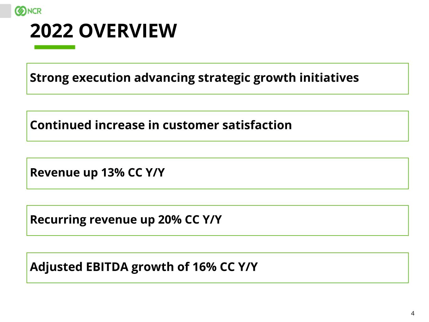 3 NON-GAAP MEASURES. While NCR reports its results in accordance with generally accepted accounting principles in the United States, or GAAP, comments made during this conference call and in these materials will include or make reference to certain "non- GAAP" measures, including: selected measures, such as period-over-period revenue growth; gross margin rate (non-GAAP); diluted earnings per share (non-GAAP); free cash flow; gross margin (non-GAAP); net debt; adjusted EBITDA; adjusted EBITDA growth; adjusted EBITDA margin; the ratio of net debt to adjusted EBITDA; operating income (non-GAAP); interest and other expense (non- GAAP); income tax expense (non-GAAP); effective income tax rate (non-GAAP); net income (non-GAAP); and measurements in constant currency. These measures are included to provide additional useful information regarding NCR's financial results, and are not a substitute for their comparable GAAP measures. Explanations of these non-GAAP measures, and reconciliations of these non- GAAP measures to their directly comparable GAAP measures, are included in the accompanying "Supplementary Materials" and are available on the Investor Relations page of NCR's website at www.ncr.com. Descriptions of many of these non-GAAP measures are also included in NCR's SEC reports. CHANGE IN REPORTABLE SEGMENTS. Effective January 1, 2022, the Company realigned its reportable segments to correspond with changes to its operating model, management structure and organizational responsibilities. Prior periods have been reclassified in order to conform to current period presentation. USE OF CERTAIN TERMS. As used in these materials: (i) the term "recurring revenue" includes all revenue streams from contracts where there is a predictable revenue pattern that will occur at regular intervals with a relatively high degree of certainty. This includes hardware and software maintenance revenue, cloud revenue, payment processing revenue, interchange and network revenue, cryptocurrency- related revenue, and certain professional services arrangements, as well as term-based software license arrangements that include customer termination rights. (ii) the term "annual recurring revenue" or "ARR" is recurring revenue, excluding software license sold as a subscription, for the last three months times four, plus the rolling four quarters for term-based software license arrangements that include customer termination rights. (iii) the term "CC" means constant currency. (iv) the term "LTM" means last twelve months. These presentation materials and the associated remarks made during this conference call are integrally related and are intended to be presented and understood together. NOTES TO INVESTORS