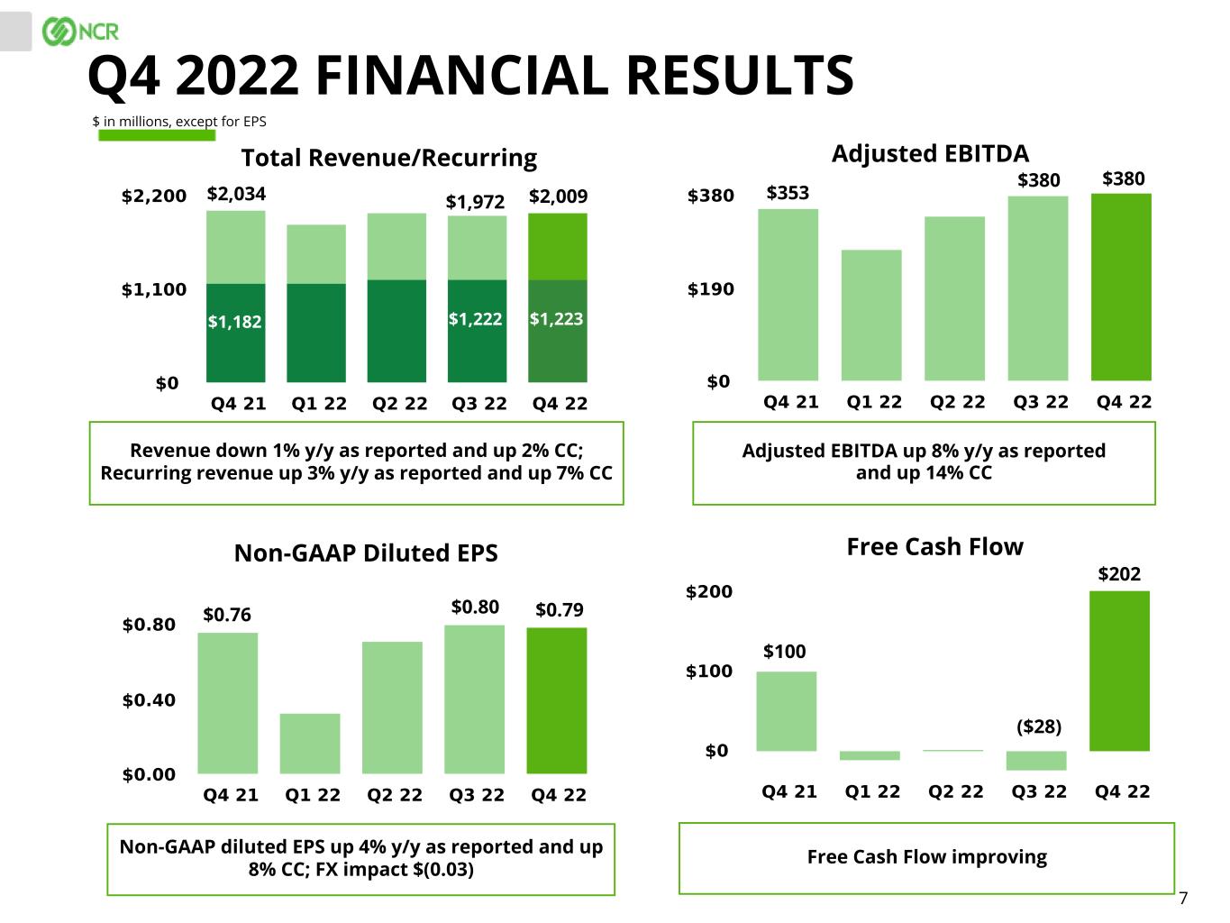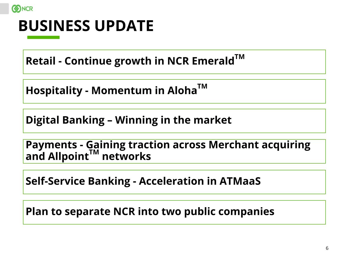 6 BUSINESS UPDATE Plan to separate NCR into two public companies Retail - Continue growth in NCR EmeraldTM Hospitality - Momentum in AlohaTM Digital Banking – Winning in the market Payments - Gaining traction across Merchant acquiring and AllpointTM networks Self-Service Banking - Acceleration in ATMaaS