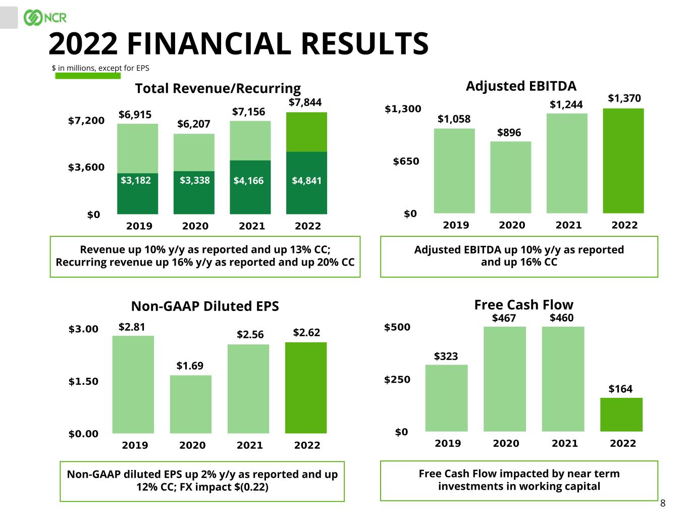 7 Adjusted EBITDA up 8% y/y as reported and up 14% CC Non-GAAP diluted EPS up 4% y/y as reported and up 8% CC; FX impact $(0.03) Free Cash Flow improving Total Revenue/Recurring Adjusted EBITDA Non-GAAP Diluted EPS Free Cash Flow Revenue down 1% y/y as reported and up 2% CC; Recurring revenue up 3% y/y as reported and up 7% CC Q4 2022 FINANCIAL RESULTS $ in millions, except for EPS $2,034 $353 $100 $1,972 $380 $0.76 $0.80 ($28) $202 $2,009 $380 $0.79 $1,182 $1,222 $1,223