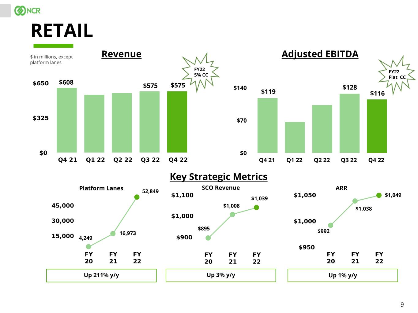 9 $ in millions, except platform lanes RETAIL Revenue Adjusted EBITDA Q4 21 Q1 22 Q2 22 Q3 22 Q4 22 $0 $70 $140 SCO RevenuePlatform Lanes ARR Up 3% y/y Key Strategic Metrics Up 1% y/yUp 211% y/y $608 $575 $119 $128 16,973 52,849 $1,038 $1,039 $1,008 $575 $116 $1,049 $895 4,249 $992 FY22 Flat CC FY22 5% CC