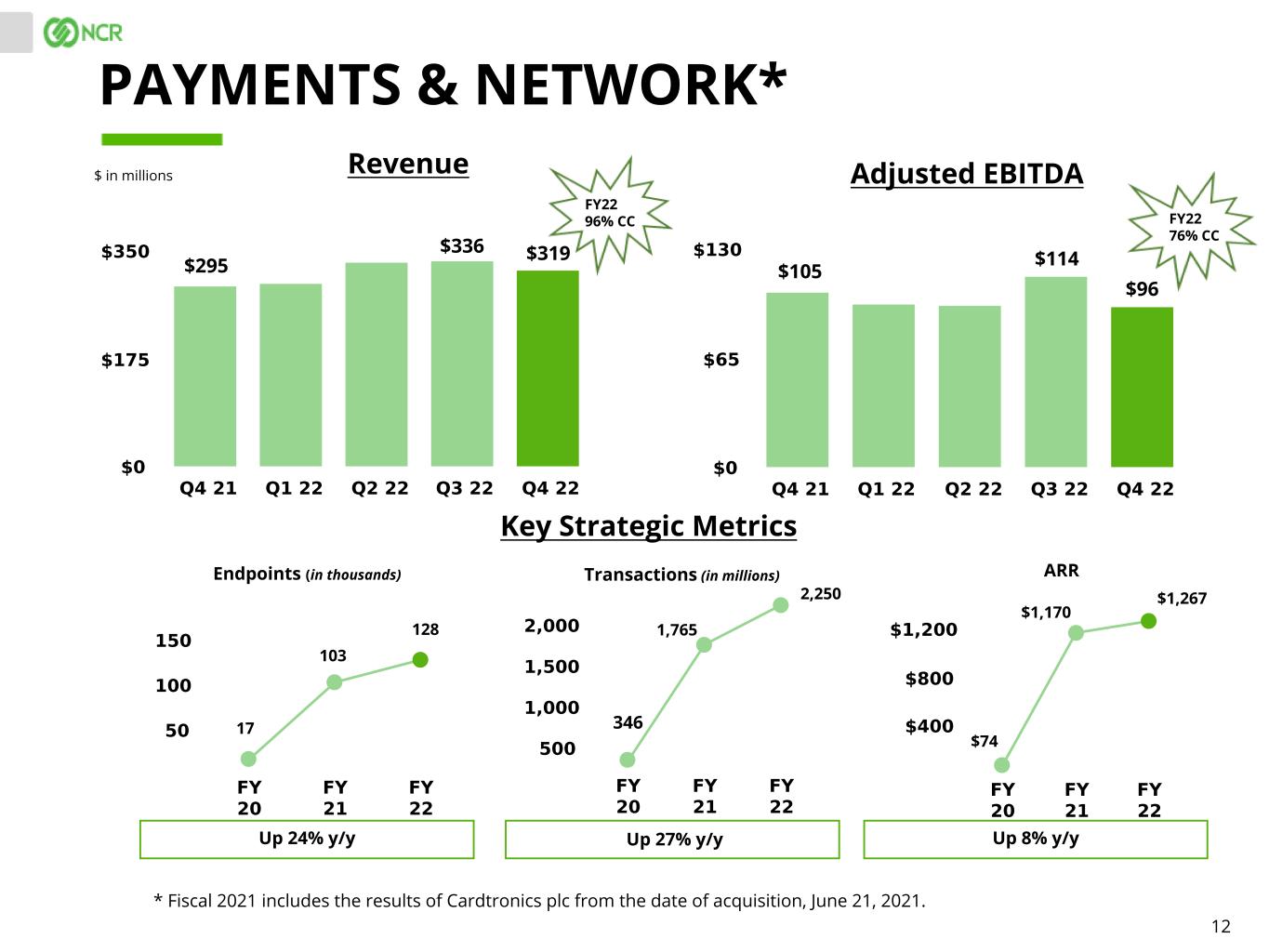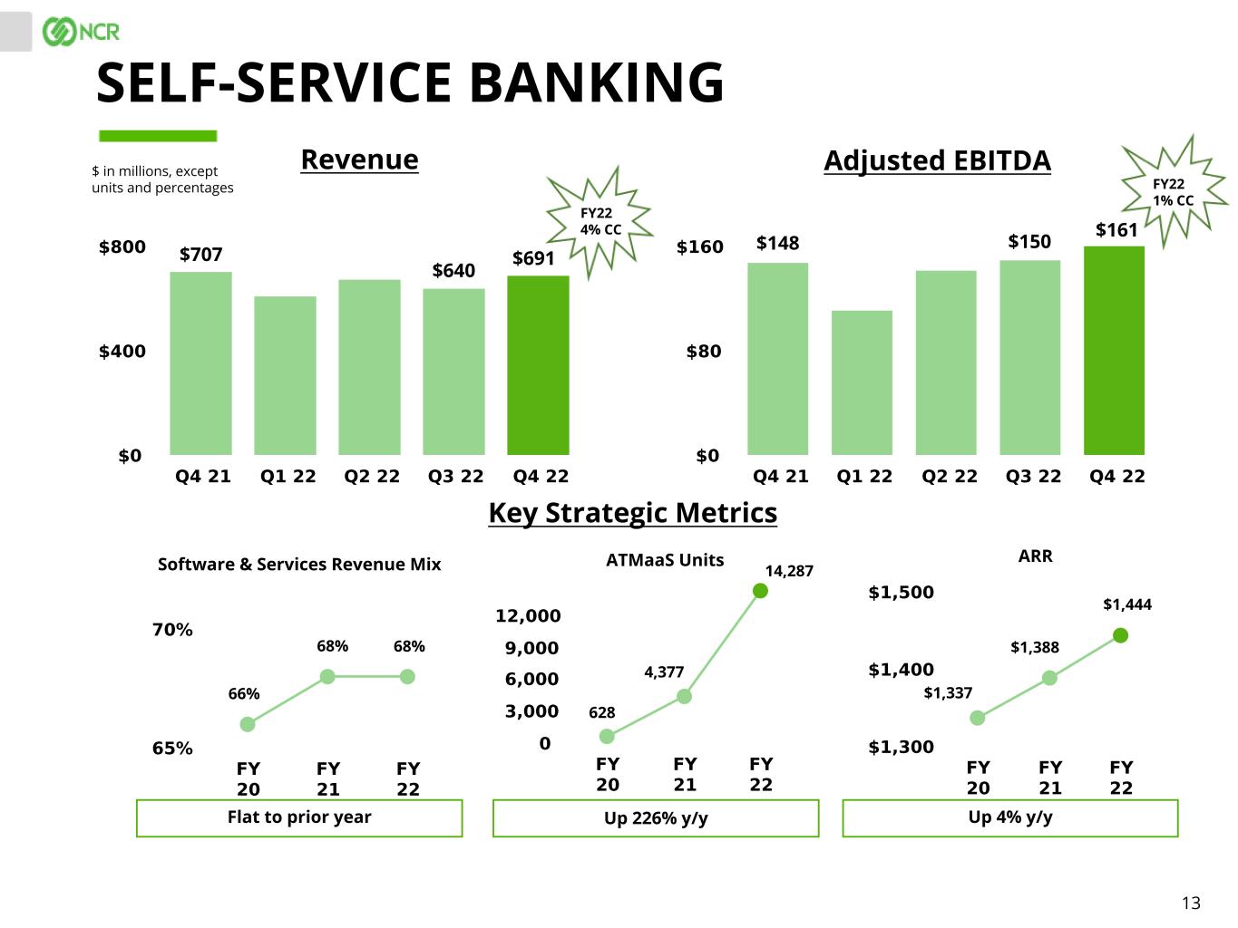 12 $ in millions PAYMENTS & NETWORK* Revenue Adjusted EBITDA $295 Endpoints (in thousands) Transactions (in millions) ARR Up 24% y/y Up 27% y/y Up 8% y/y Key Strategic Metrics $336 17 $114$105 1,765 $1,170 $1,267 103 $319 $96 2,250 128 346 $74 FY22 96% CC FY22 76% CC * Fiscal 2021 includes the results of Cardtronics plc from the date of acquisition, June 21, 2021.