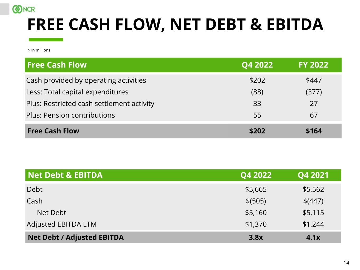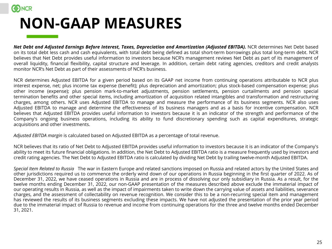 25 Net Debt and Adjusted Earnings Before Interest, Taxes, Depreciation and Amortization (Adjusted EBITDA). NCR determines Net Debt based on its total debt less cash and cash equivalents, with total debt being defined as total short-term borrowings plus total long-term debt. NCR believes that Net Debt provides useful information to investors because NCR’s management reviews Net Debt as part of its management of overall liquidity, financial flexibility, capital structure and leverage. In addition, certain debt rating agencies, creditors and credit analysts monitor NCR’s Net Debt as part of their assessments of NCR’s business. NCR determines Adjusted EBITDA for a given period based on its GAAP net income from continuing operations attributable to NCR plus interest expense, net; plus income tax expense (benefit); plus depreciation and amortization; plus stock-based compensation expense; plus other income (expense); plus pension mark-to-market adjustments, pension settlements, pension curtailments and pension special termination benefits and other special items, including amortization of acquisition related intangibles and transformation and restructuring charges, among others. NCR uses Adjusted EBITDA to manage and measure the performance of its business segments. NCR also uses Adjusted EBITDA to manage and determine the effectiveness of its business managers and as a basis for incentive compensation. NCR believes that Adjusted EBITDA provides useful information to investors because it is an indicator of the strength and performance of the Company's ongoing business operations, including its ability to fund discretionary spending such as capital expenditures, strategic acquisitions and other investments. Adjusted EBITDA margin is calculated based on Adjusted EBITDA as a percentage of total revenue. NCR believes that its ratio of Net Debt to Adjusted EBITDA provides useful information to investors because it is an indicator of the Company's ability to meet its future financial obligations. In addition, the Net Debt to Adjusted EBITDA ratio is a measure frequently used by investors and credit rating agencies. The Net Debt to Adjusted EBITDA ratio is calculated by dividing Net Debt by trailing twelve-month Adjusted EBITDA. Special Item Related to Russia The war in Eastern Europe and related sanctions imposed on Russia and related actors by the United States and other jurisdictions required us to commence the orderly wind down of our operations in Russia beginning in the first quarter of 2022. As of December 31, 2022, we have ceased operations in Russia and are in process of dissolving our only subsidiary in Russia. As a result, for the twelve months ending December 31, 2022, our non-GAAP presentation of the measures described above exclude the immaterial impact of our operating results in Russia, as well as the impact of impairments taken to write down the carrying value of assets and liabilities, severance charges, and the assessment of collectability on revenue recognition. We consider this to be a non-recurring special item and management has reviewed the results of its business segments excluding these impacts. We have not adjusted the presentation of the prior year period due to the immaterial impact of Russia to revenue and income from continuing operations for the three and twelve months ended December 31, 2021. NON-GAAP MEASURES