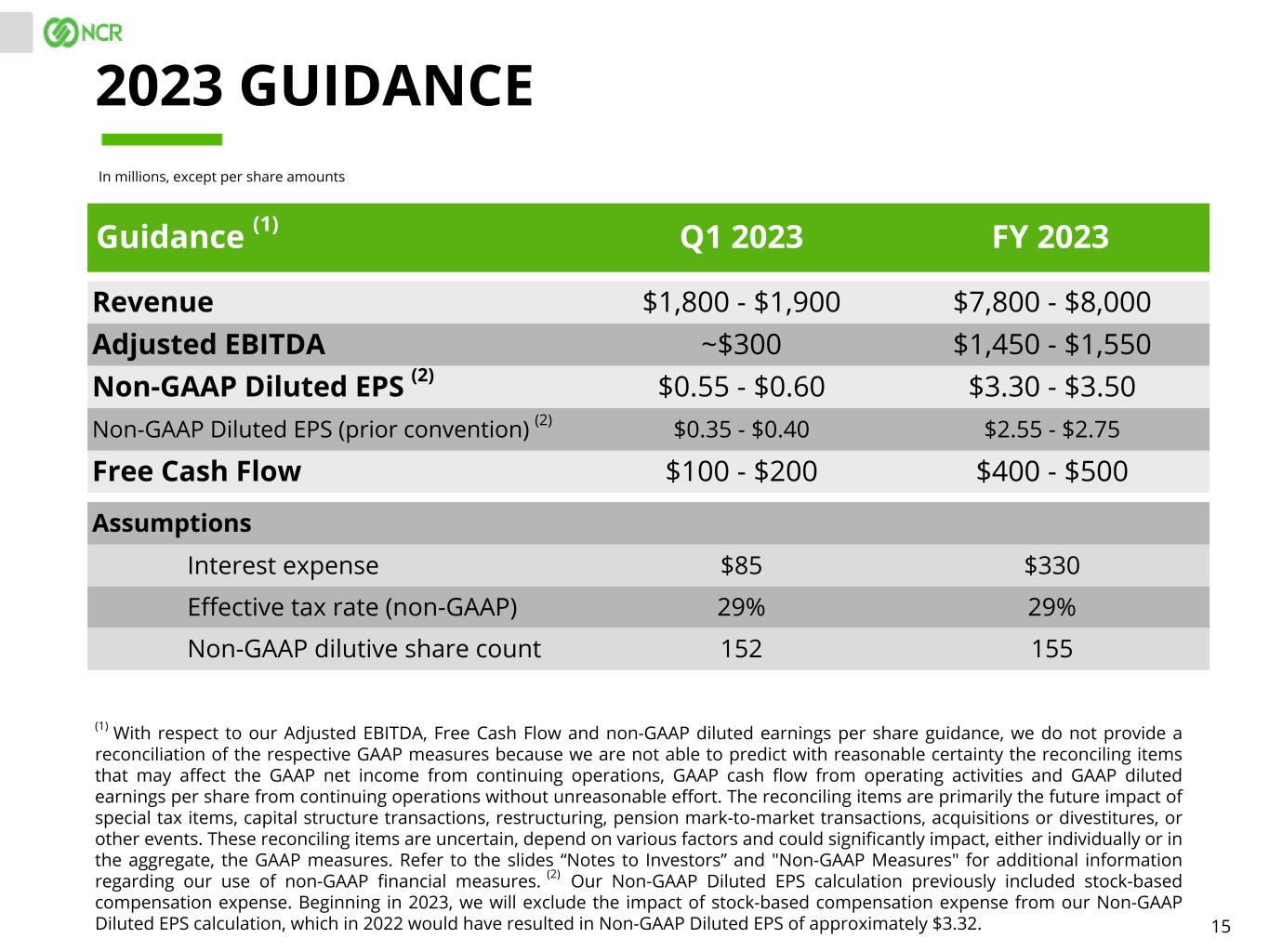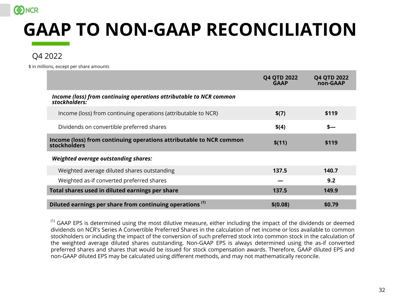 32 Q4 QTD 2022 GAAP Q4 QTD 2022 non-GAAP Income (loss) from continuing operations attributable to NCR common stockholders: Income (loss) from continuing operations (attributable to NCR) $(7) $119 Dividends on convertible preferred shares $(4) $— Income (loss) from continuing operations attributable to NCR common stockholders $(11) $119 Weighted average outstanding shares: Weighted average diluted shares outstanding 137.5 140.7 Weighted as-if converted preferred shares — 9.2 Total shares used in diluted earnings per share 137.5 149.9 Diluted earnings per share from continuing operations (1) $(0.08) $0.79 (1) GAAP EPS is determined using the most dilutive measure, either including the impact of the dividends or deemed dividends on NCR's Series A Convertible Preferred Shares in the calculation of net income or loss available to common stockholders or including the impact of the conversion of such preferred stock into common stock in the calculation of the weighted average diluted shares outstanding. Non-GAAP EPS is always determined using the as-if converted preferred shares and shares that would be issued for stock compensation awards. Therefore, GAAP diluted EPS and non-GAAP diluted EPS may be calculated using different methods, and may not mathematically reconcile. GAAP TO NON-GAAP RECONCILIATION $ in millions, except per share amounts Q4 2022