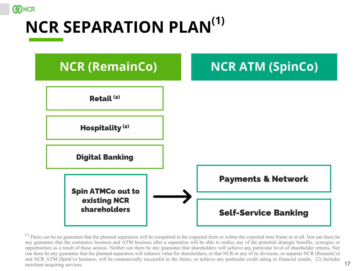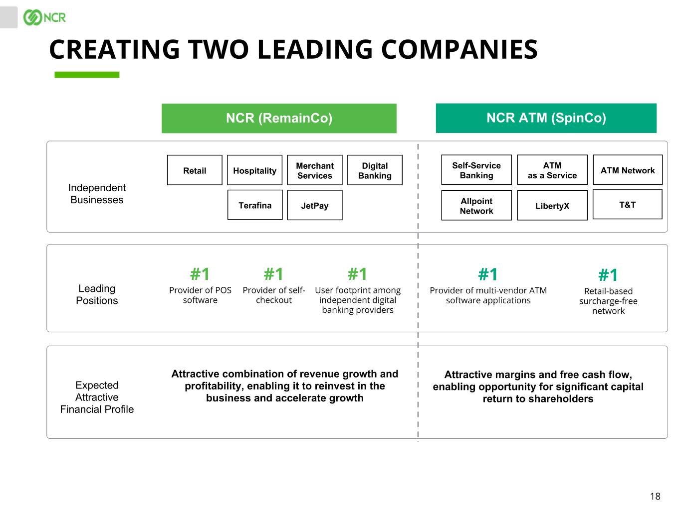 17 NCR SEPARATION PLAN(1) (1) There can be no guarantee that the planned separation will be completed in the expected form or within the expected time frame or at all. Nor can there be any guarantee that the commerce business and ATM business after a separation will be able to realize any of the potential strategic benefits, synergies or opportunities as a result of these actions. Neither can there be any guarantee that shareholders will achieve any particular level of shareholder returns. Nor can there be any guarantee that the planned separation will enhance value for shareholders, or that NCR or any of its divisions, or separate NCR (RemainCo) and NCR ATM (SpinCo) business, will be commercially successful in the future, or achieve any particular credit rating or financial results. (2) Includes merchant acquiring services. NCR (RemainCo) NCR ATM (SpinCo)