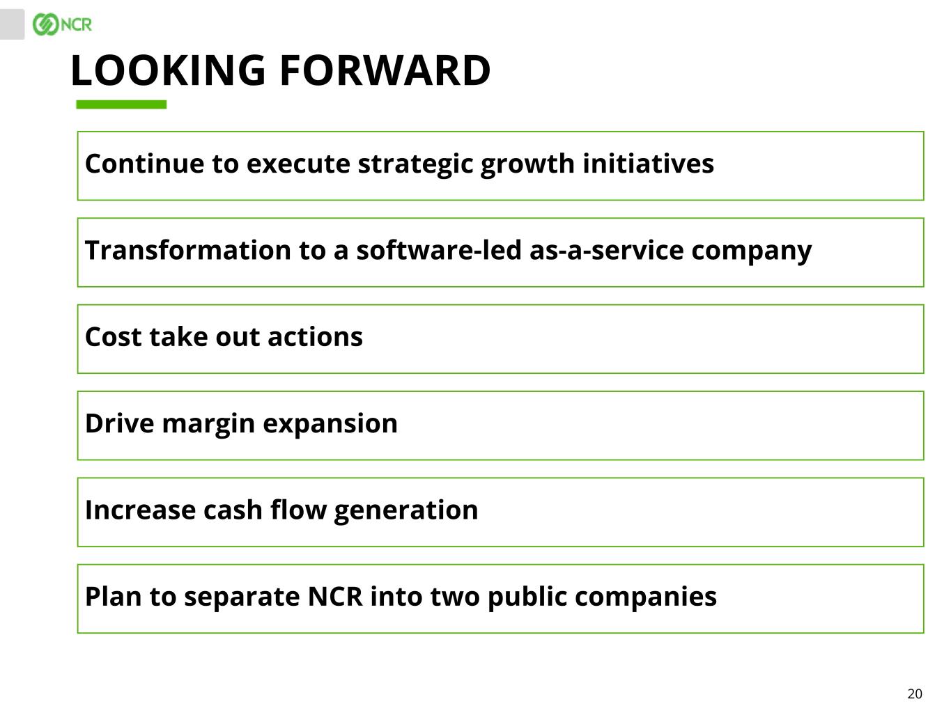 20 LOOKING FORWARD Transformation to a software-led as-a-service company Drive margin expansion Increase cash flow generation Continue to execute strategic growth initiatives Plan to separate NCR into two public companies Cost take out actions