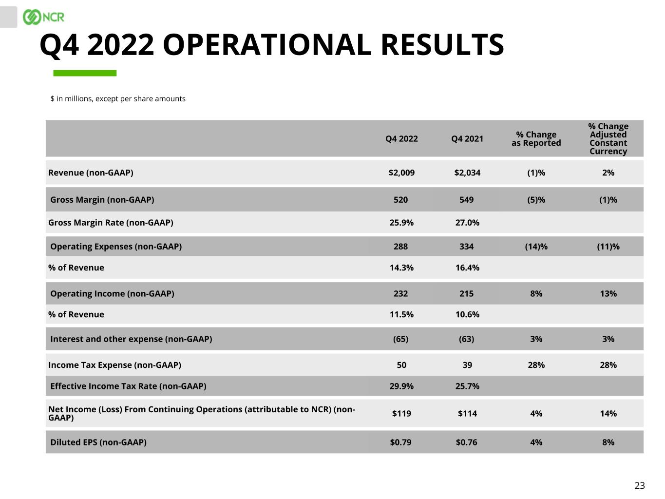 22 Q4 2022 Q4 2021 % Change Revenue $2,009 $2,034 (1)% Gross Margin 485 503 (4)% Gross Margin Rate 24.1% 24.7% Operating Expenses 319 380 (16)% % of Revenue 15.9% 18.7% Operating Income 166 123 35% % of Revenue 8.3% 6.0% Interest and other expense, net (83) 49 (269)% Income Tax Expense (Benefit) 92 109 Effective Income Tax Rate 110.8% 63.4% Net Income (Loss) from Continuing Operations (attributable to NCR) $(7) $64 (111)% Diluted EPS from Continuing Operations $(0.08) $0.43 (119)% $ in millions, except per share amounts Q4 2022 GAAP RESULTS