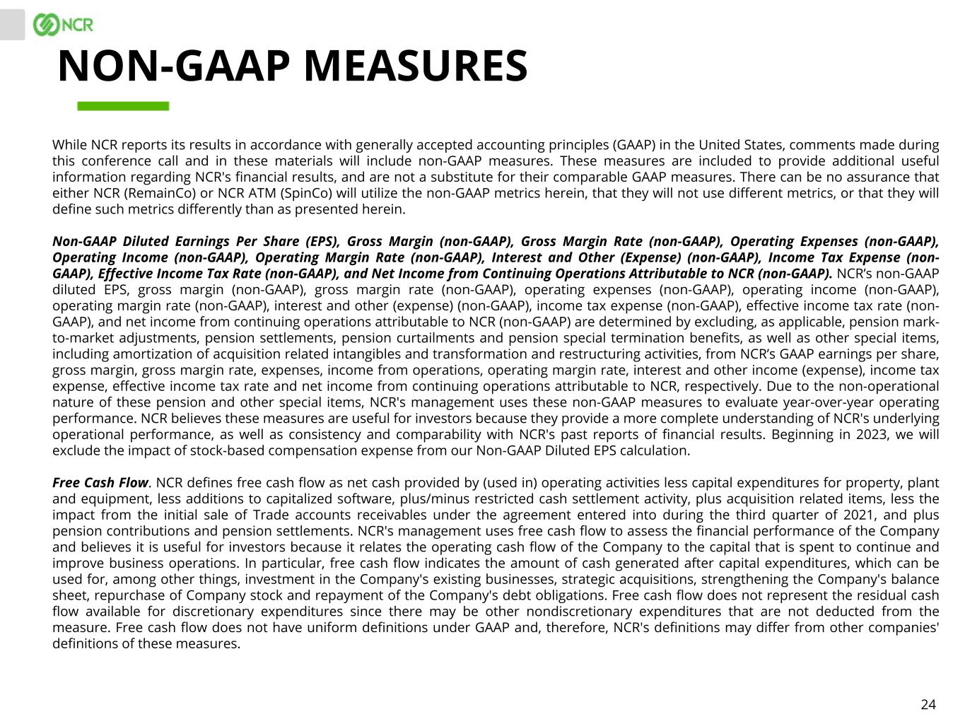 24 While NCR reports its results in accordance with generally accepted accounting principles (GAAP) in the United States, comments made during this conference call and in these materials will include non-GAAP measures. These measures are included to provide additional useful information regarding NCR's financial results, and are not a substitute for their comparable GAAP measures. There can be no assurance that either NCR (RemainCo) or NCR ATM (SpinCo) will utilize the non-GAAP metrics herein, that they will not use different metrics, or that they will define such metrics differently than as presented herein. Non-GAAP Diluted Earnings Per Share (EPS), Gross Margin (non-GAAP), Gross Margin Rate (non-GAAP), Operating Expenses (non-GAAP), Operating Income (non-GAAP), Operating Margin Rate (non-GAAP), Interest and Other (Expense) (non-GAAP), Income Tax Expense (non- GAAP), Effective Income Tax Rate (non-GAAP), and Net Income from Continuing Operations Attributable to NCR (non-GAAP). NCR’s non-GAAP diluted EPS, gross margin (non-GAAP), gross margin rate (non-GAAP), operating expenses (non-GAAP), operating income (non-GAAP), operating margin rate (non-GAAP), interest and other (expense) (non-GAAP), income tax expense (non-GAAP), effective income tax rate (non- GAAP), and net income from continuing operations attributable to NCR (non-GAAP) are determined by excluding, as applicable, pension mark- to-market adjustments, pension settlements, pension curtailments and pension special termination benefits, as well as other special items, including amortization of acquisition related intangibles and transformation and restructuring activities, from NCR’s GAAP earnings per share, gross margin, gross margin rate, expenses, income from operations, operating margin rate, interest and other income (expense), income tax expense, effective income tax rate and net income from continuing operations attributable to NCR, respectively. Due to the non-operational nature of these pension and other special items, NCR's management uses these non-GAAP measures to evaluate year-over-year operating performance. NCR believes these measures are useful for investors because they provide a more complete understanding of NCR's underlying operational performance, as well as consistency and comparability with NCR's past reports of financial results. Beginning in 2023, we will exclude the impact of stock-based compensation expense from our Non-GAAP Diluted EPS calculation. Free Cash Flow. NCR defines free cash flow as net cash provided by (used in) operating activities less capital expenditures for property, plant and equipment, less additions to capitalized software, plus/minus restricted cash settlement activity, plus acquisition related items, less the impact from the initial sale of Trade accounts receivables under the agreement entered into during the third quarter of 2021, and plus pension contributions and pension settlements. NCR's management uses free cash flow to assess the financial performance of the Company and believes it is useful for investors because it relates the operating cash flow of the Company to the capital that is spent to continue and improve business operations. In particular, free cash flow indicates the amount of cash generated after capital expenditures, which can be used for, among other things, investment in the Company's existing businesses, strategic acquisitions, strengthening the Company's balance sheet, repurchase of Company stock and repayment of the Company's debt obligations. Free cash flow does not represent the residual cash flow available for discretionary expenditures since there may be other nondiscretionary expenditures that are not deducted from the measure. Free cash flow does not have uniform definitions under GAAP and, therefore, NCR's definitions may differ from other companies' definitions of these measures. NON-GAAP MEASURES
