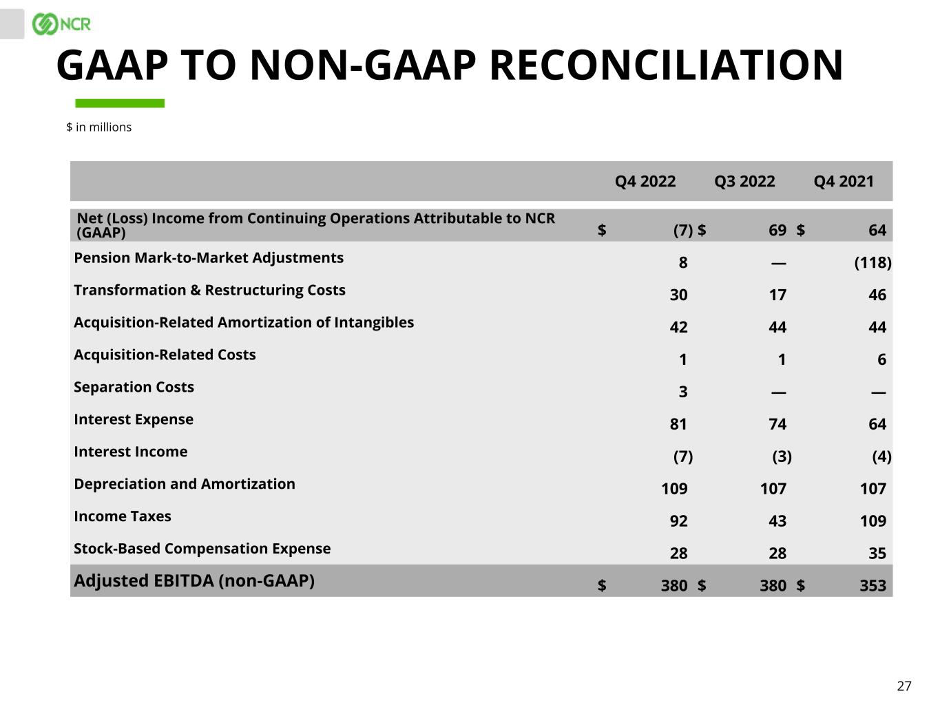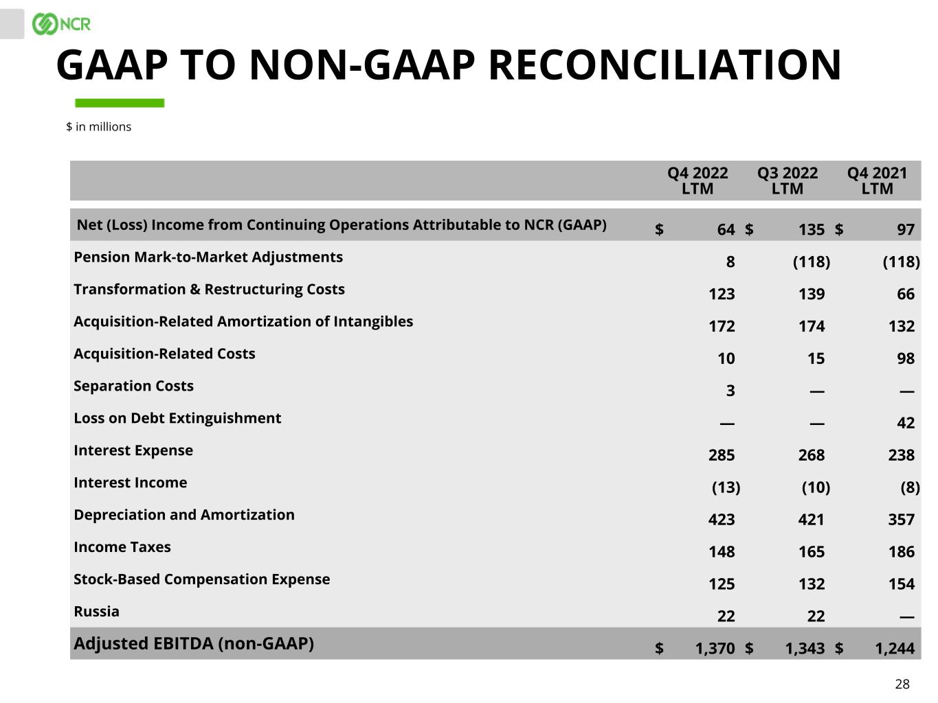 27 Q4 2022 Q3 2022 Q4 2021 Net (Loss) Income from Continuing Operations Attributable to NCR (GAAP) $ (7) $ 69 $ 64 Pension Mark-to-Market Adjustments 8 — (118) Transformation & Restructuring Costs 30 17 46 Acquisition-Related Amortization of Intangibles 42 44 44 Acquisition-Related Costs 1 1 6 Separation Costs 3 — — Interest Expense 81 74 64 Interest Income (7) (3) (4) Depreciation and Amortization 109 107 107 Income Taxes 92 43 109 Stock-Based Compensation Expense 28 28 35 Adjusted EBITDA (non-GAAP) $ 380 $ 380 $ 353 GAAP TO NON-GAAP RECONCILIATION $ in millions