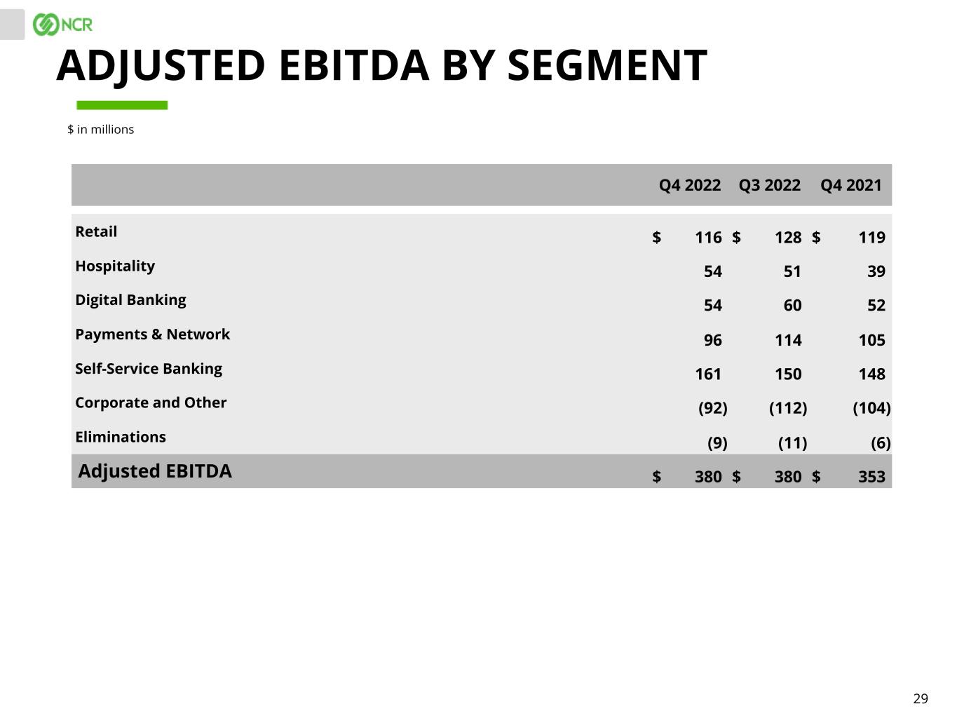 29 Q4 2022 Q3 2022 Q4 2021 Retail $ 116 $ 128 $ 119 Hospitality 54 51 39 Digital Banking 54 60 52 Payments & Network 96 114 105 Self-Service Banking 161 150 148 Corporate and Other (92) (112) (104) Eliminations (9) (11) (6) Adjusted EBITDA $ 380 $ 380 $ 353 ADJUSTED EBITDA BY SEGMENT $ in millions