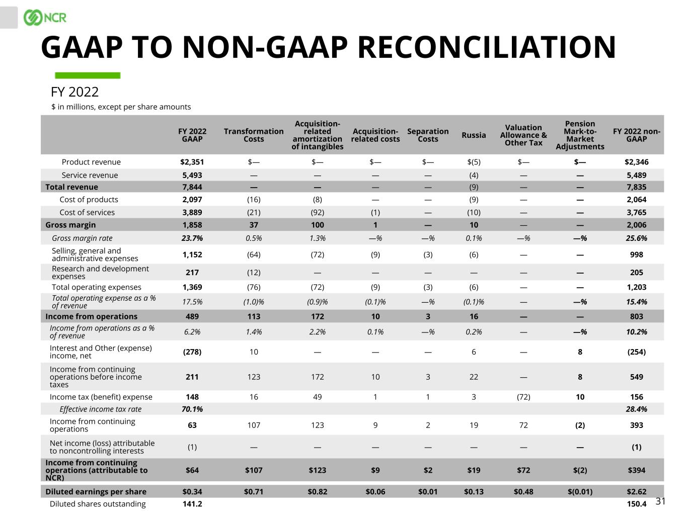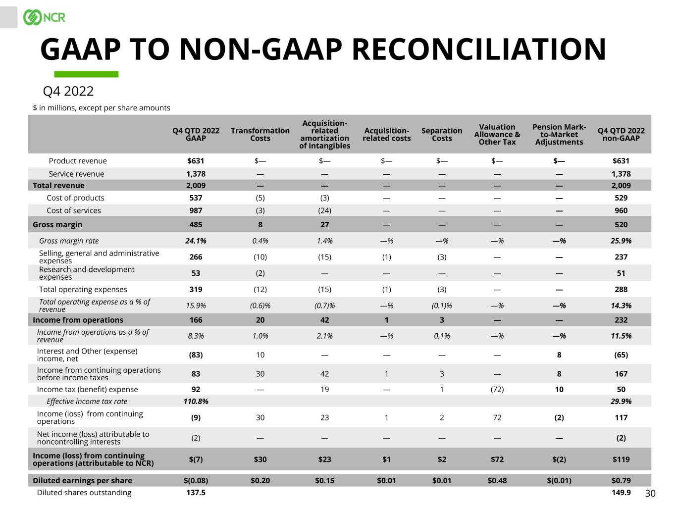 30 Q4 QTD 2022 GAAP Transformation Costs Acquisition- related amortization of intangibles Acquisition- related costs Separation Costs Valuation Allowance & Other Tax Pension Mark- to-Market Adjustments Q4 QTD 2022 non-GAAP Product revenue $631 $— $— $— $— $— $— $631 Service revenue 1,378 — — — — — — 1,378 Total revenue 2,009 — — — — — — 2,009 Cost of products 537 (5) (3) — — — — 529 Cost of services 987 (3) (24) — — — — 960 Gross margin 485 8 27 — — — — 520 Gross margin rate 24.1% 0.4% 1.4% —% —% —% —% 25.9% Selling, general and administrative expenses 266 (10) (15) (1) (3) — — 237 Research and development expenses 53 (2) — — — — — 51 Total operating expenses 319 (12) (15) (1) (3) — — 288 Total operating expense as a % of revenue 15.9% (0.6)% (0.7)% —% (0.1)% —% —% 14.3% Income from operations 166 20 42 1 3 — — 232 Income from operations as a % of revenue 8.3% 1.0% 2.1% —% 0.1% —% —% 11.5% Interest and Other (expense) income, net (83) 10 — — — — 8 (65) Income from continuing operations before income taxes 83 30 42 1 3 — 8 167 Income tax (benefit) expense 92 — 19 — 1 (72) 10 50 Effective income tax rate 110.8% 29.9% Income (loss) from continuing operations (9) 30 23 1 2 72 (2) 117 Net income (loss) attributable to noncontrolling interests (2) — — — — — — (2) Income (loss) from continuing operations (attributable to NCR) $(7) $30 $23 $1 $2 $72 $(2) $119 Diluted earnings per share $(0.08) $0.20 $0.15 $0.01 $0.01 $0.48 $(0.01) $0.79 Diluted shares outstanding 137.5 149.9 GAAP TO NON-GAAP RECONCILIATION $ in millions, except per share amounts Q4 2022
